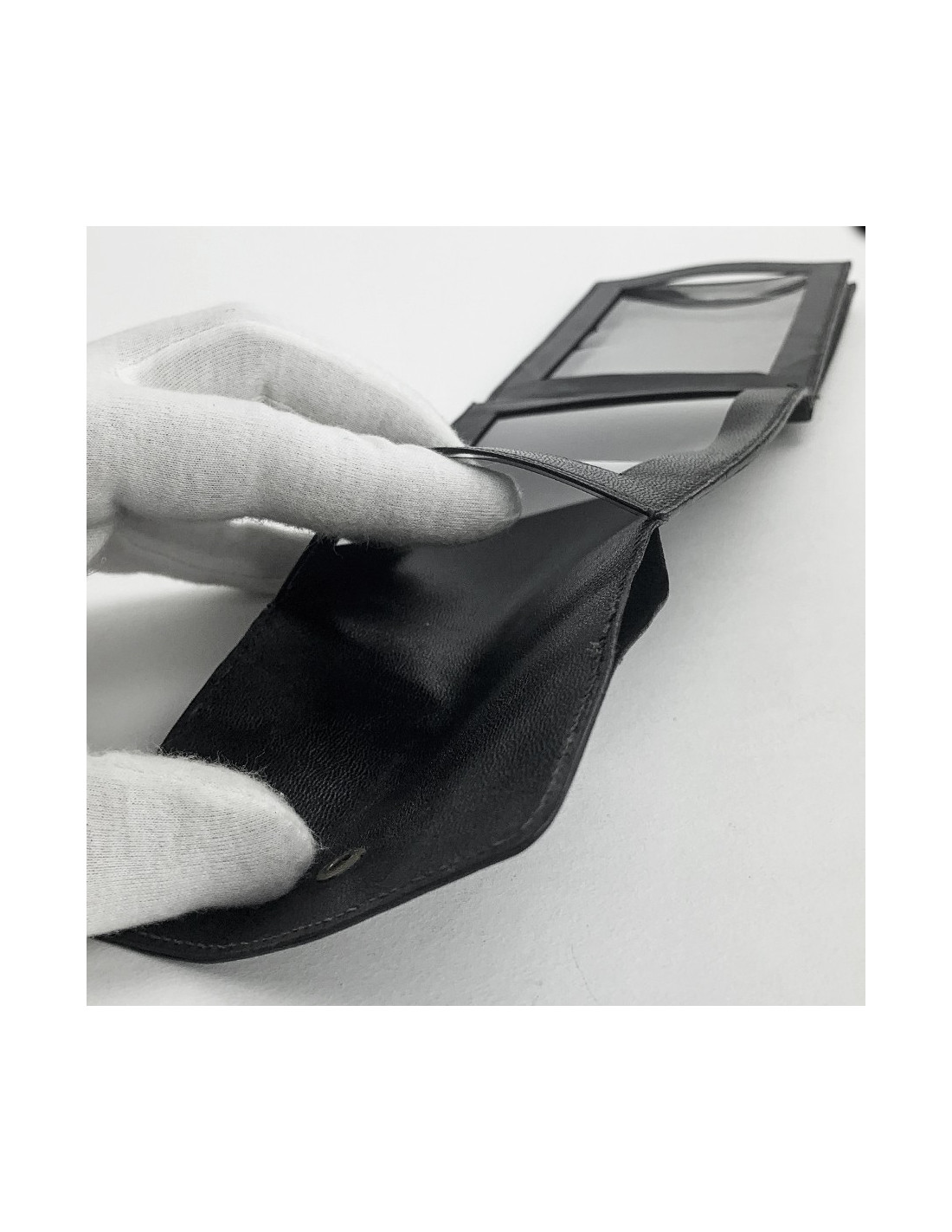 Le porte-photos est une pièce vintage de la Maison HERMES. Il est de forme rectangulaire en cuir box noir et se ferme par un bouton pression. Il dispose de trois compartiments photo double face.