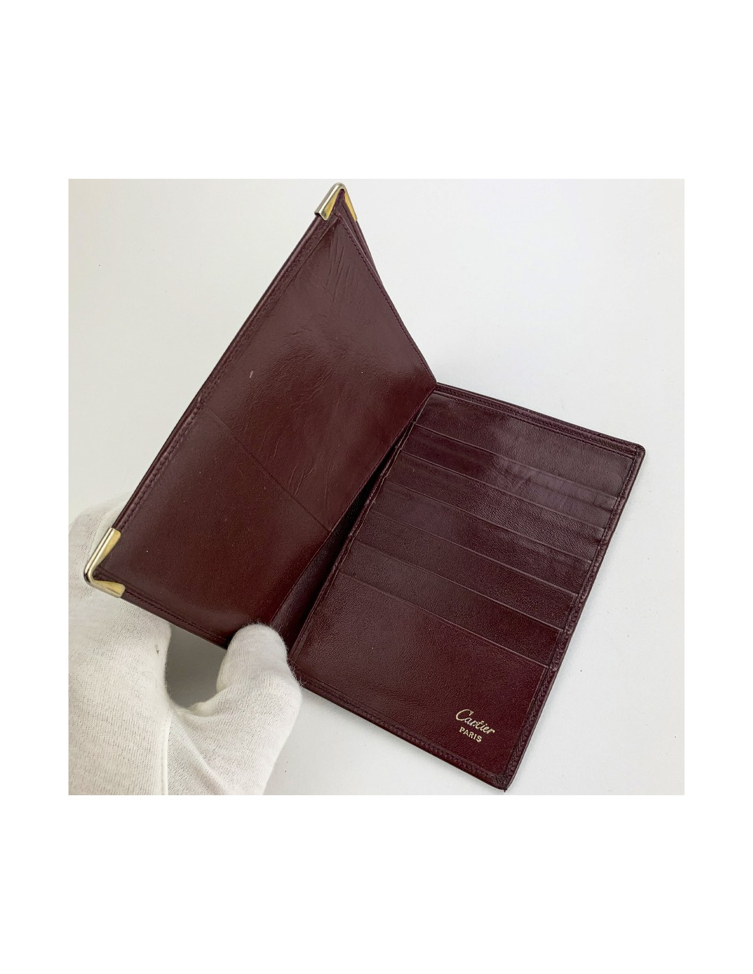 Le porte-cartes est en bon état. Des traces d'usure intérieures sont visibles mais son apparence extérieure reste en très bon état. Le porte-cartes mesure 14.5 cm de longueur et 11 cm de largeur. Mention de la marque Cartier Paris à l'intérieur et présence de la carte d'authenticité.
