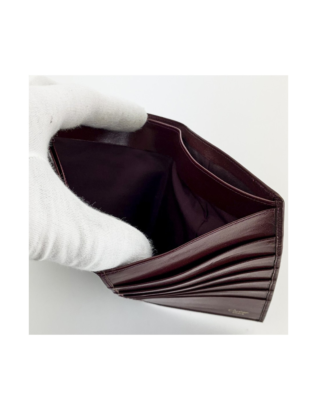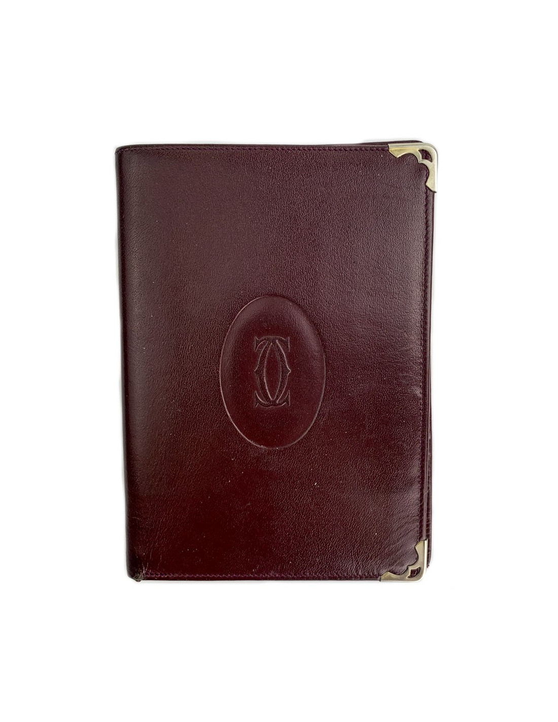 Porte-cartes de la Maison CARTIER. Il est de forme rectangulaire en cuir bordeaux embossé avec le double C de la marque. L'intérieur se compose de huit compartiments pour cartes et deux poches intérieures pour papiers et billets.
