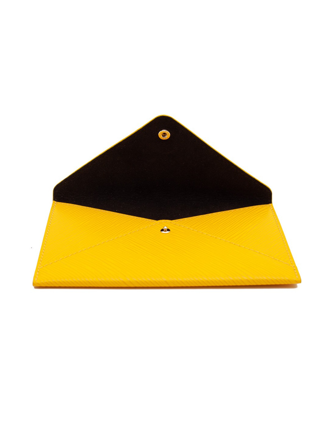 Jamais porté enveloppe LOUIS VUITTON en cuir Epi jaune doublé de suédine marron. Fermeture par une pression dorée.