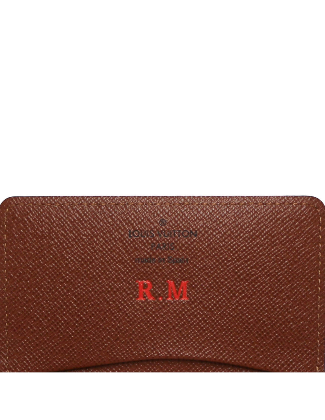 Détails : initiales R.M à l'intérieur, fermeture rabat, taille cartes de credit