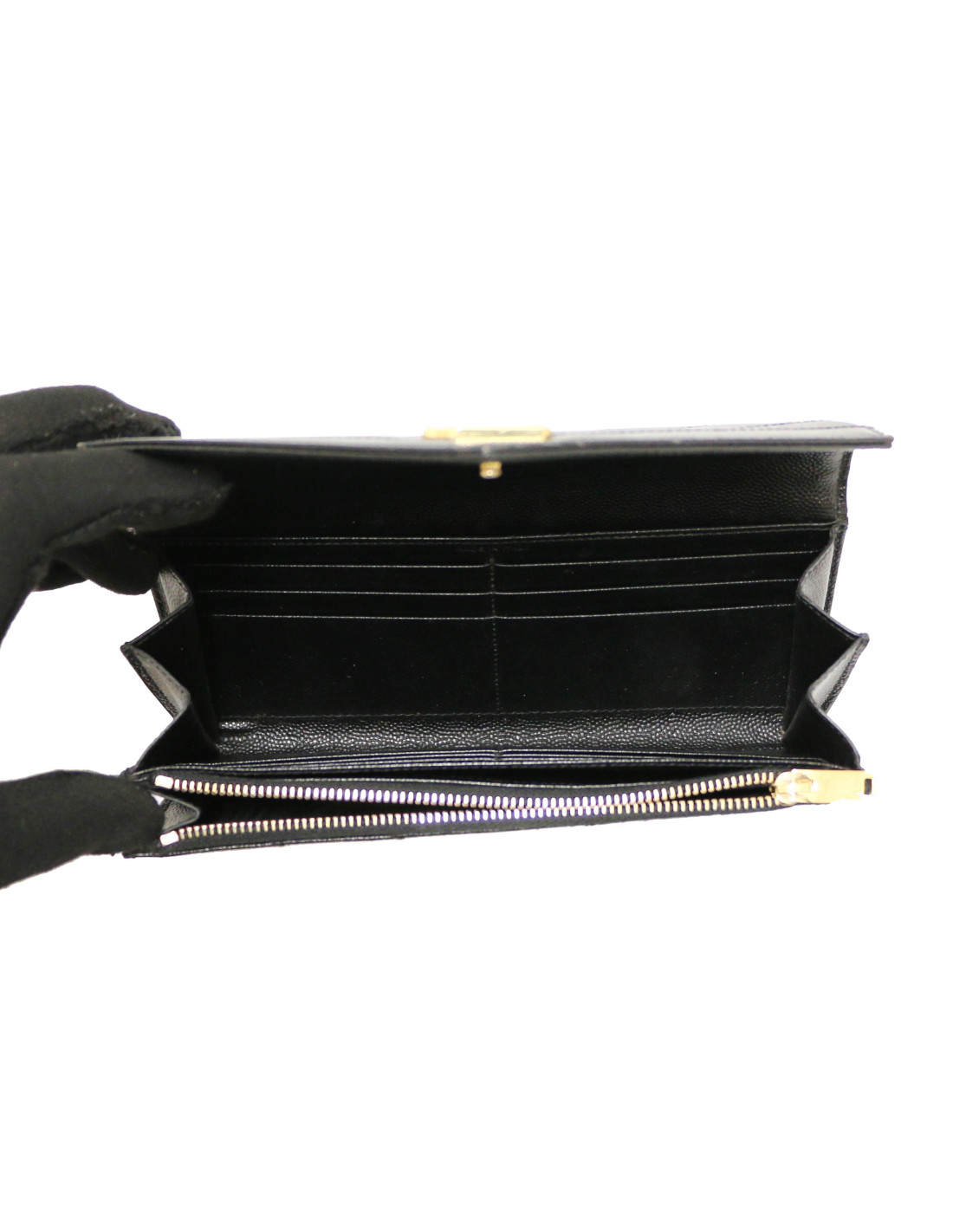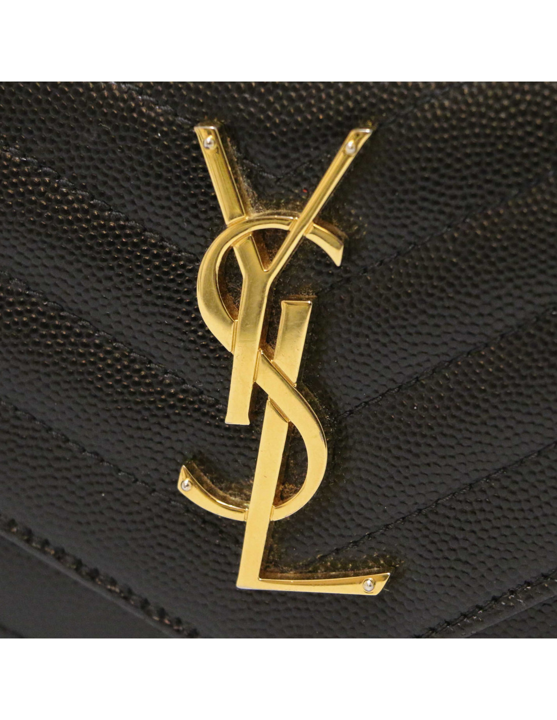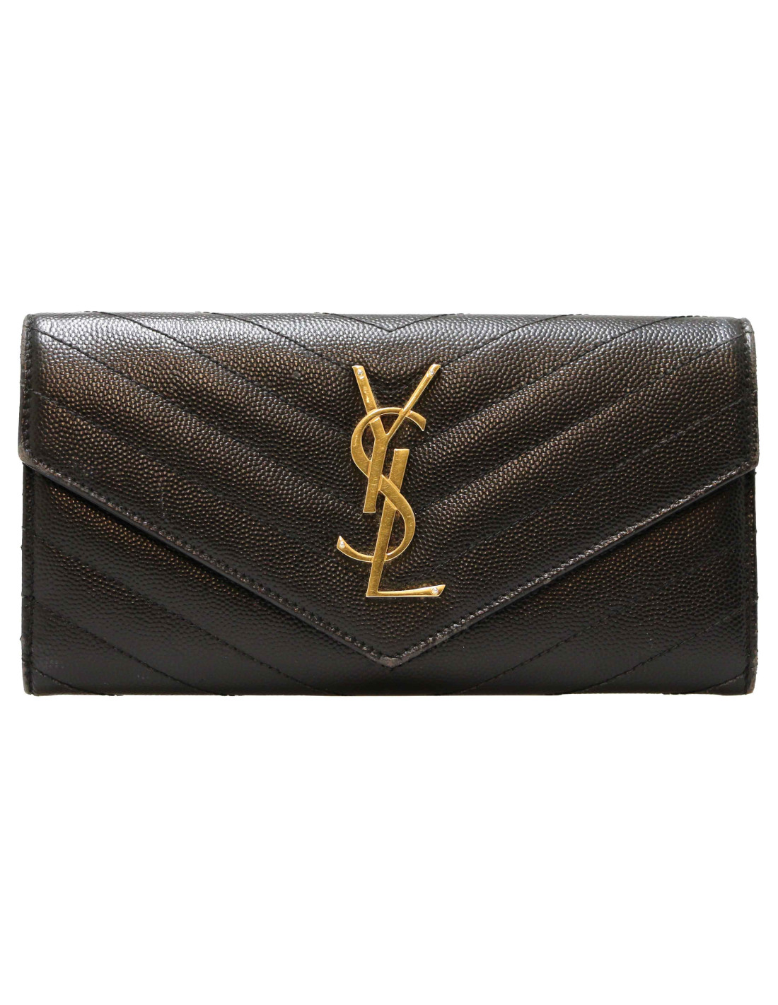 Détails : surpiqûres noires, iconique logo Cassandre, fermeture par bouton pression, 12 fentes à cartes, deux fentes à billet et un porte monnaie zippé.