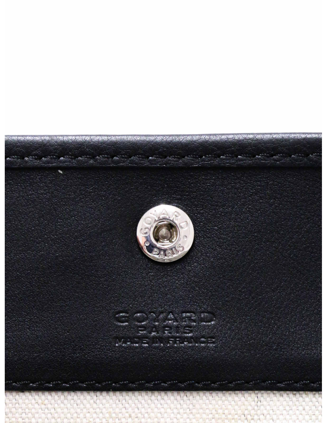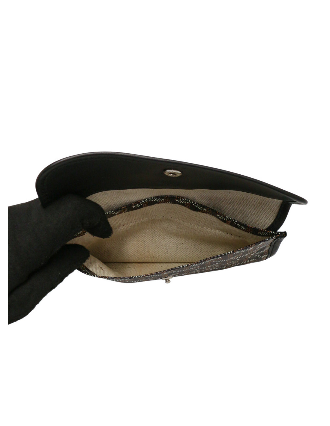 Détails : petite pochette fermée par un bouton pression. Elle peut être attachée et facilement rangée dans un sac. Emblématique toile Goyardine.