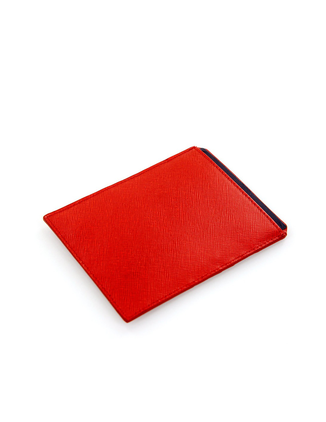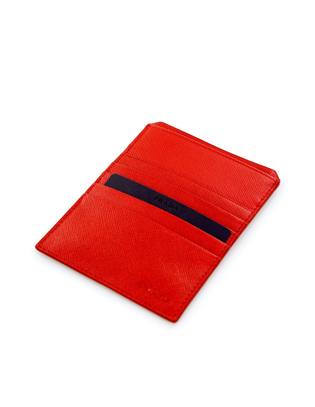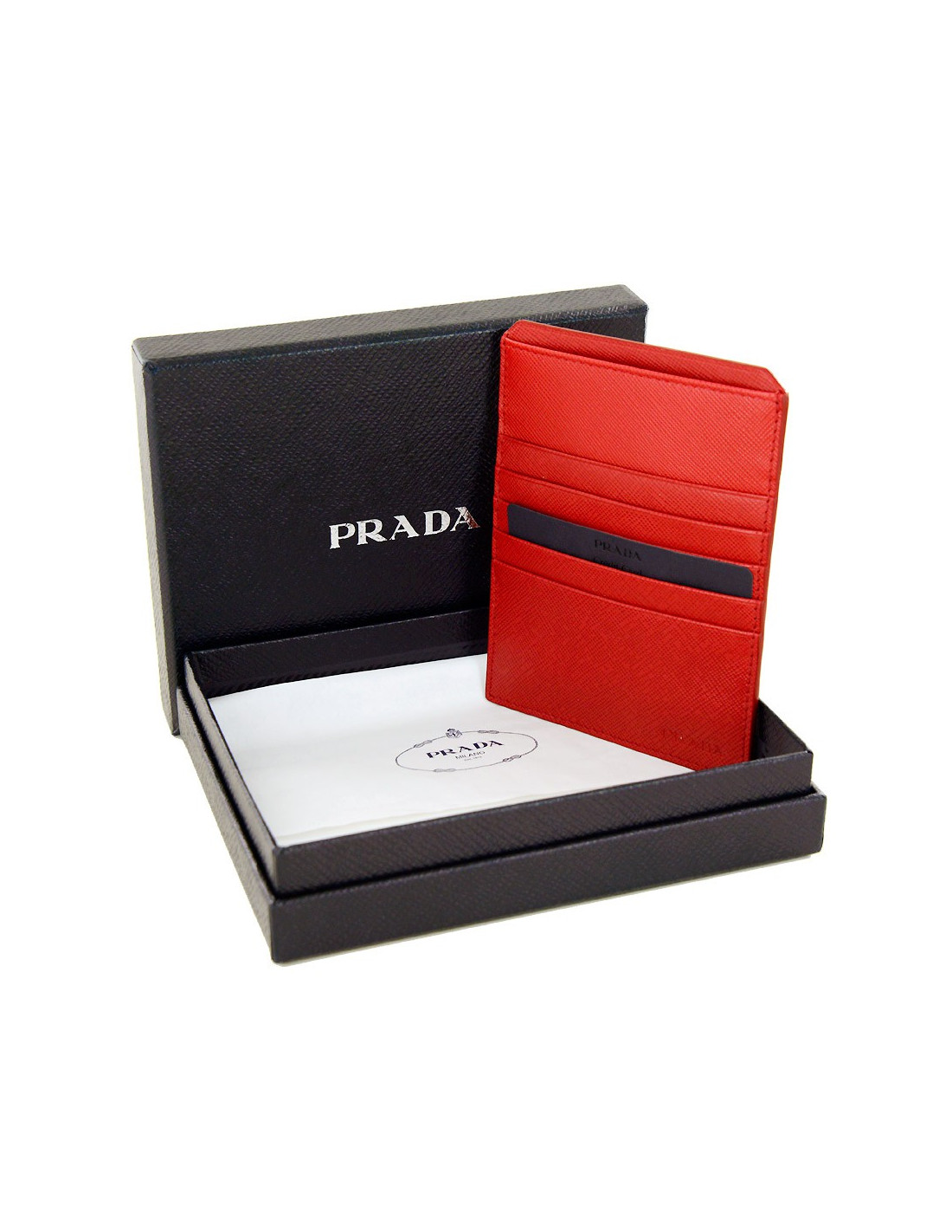 Porte-cartes de crédit Prada, cuir grainé rouge framboise, état neuf dans sa boite et sa carte d'authentiticité.