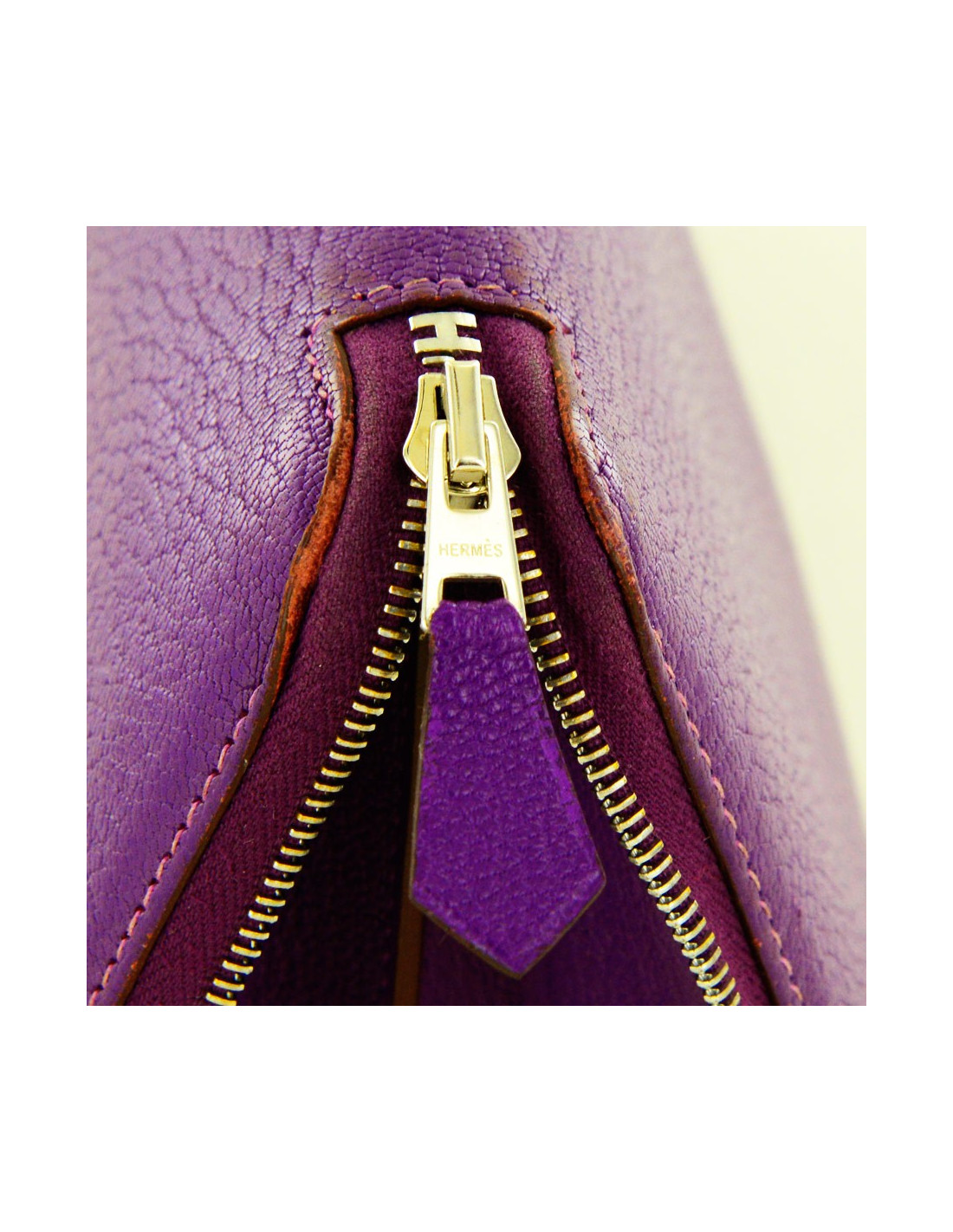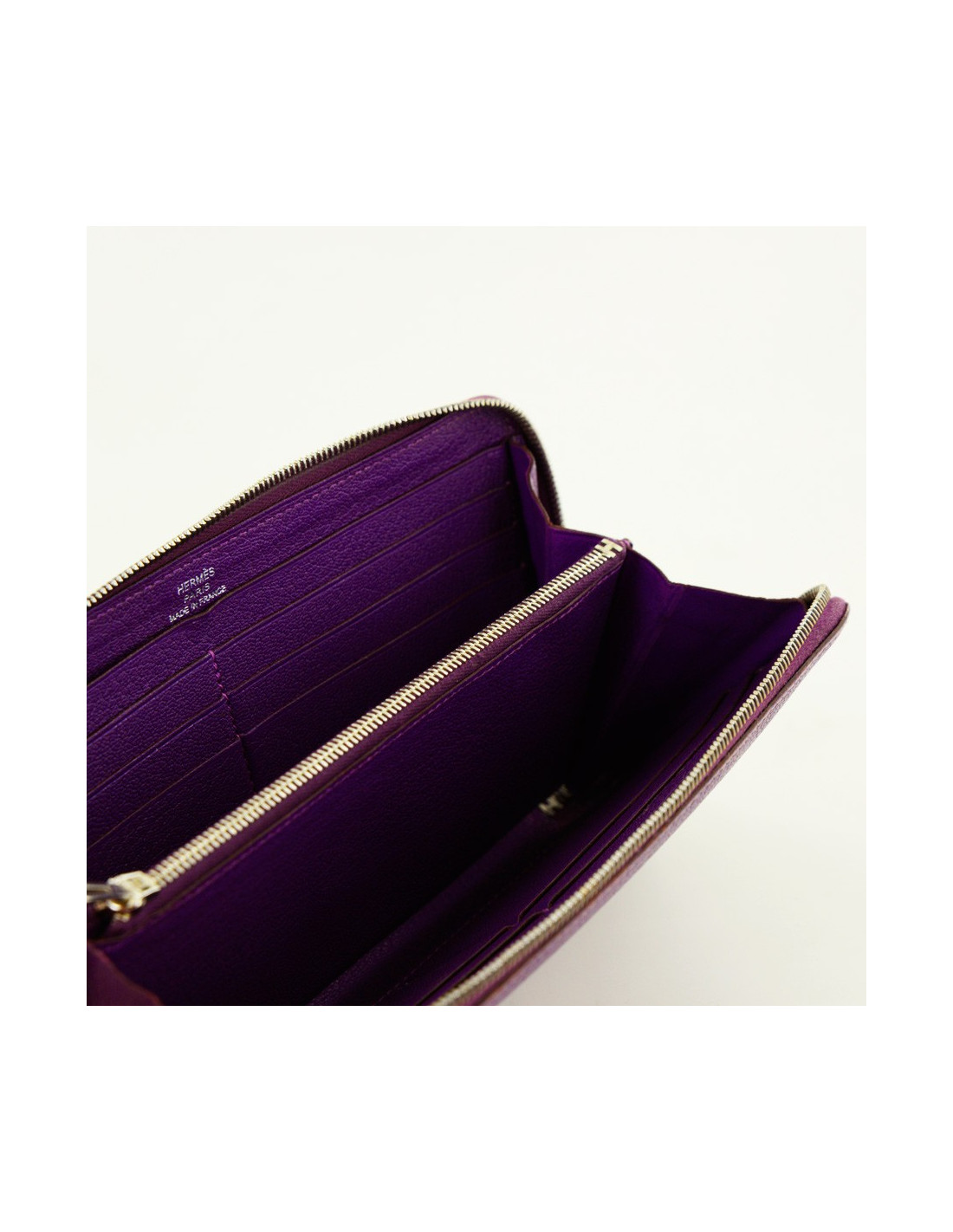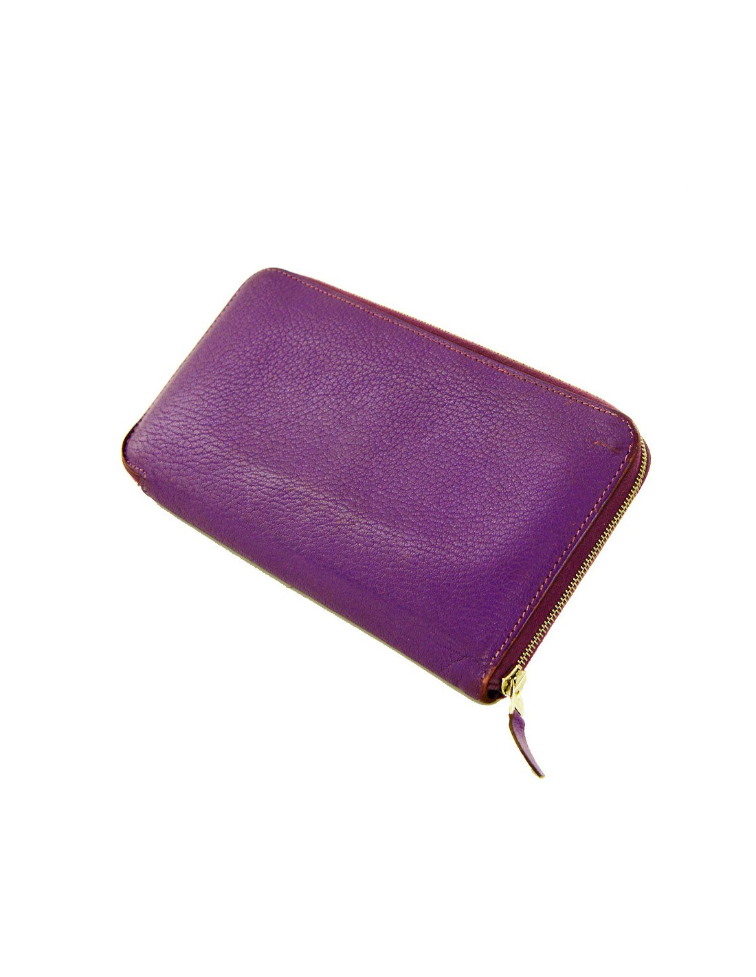 Portefeuille "compagnon", Hermès en cuir grainé violet. En très bon état. Il y a 12 fentes pour cartes de crédit. 3 compartiments dont un zippé pour la monnaie et 2 fentes supplémentaires pour les papiers ou billets de banque.