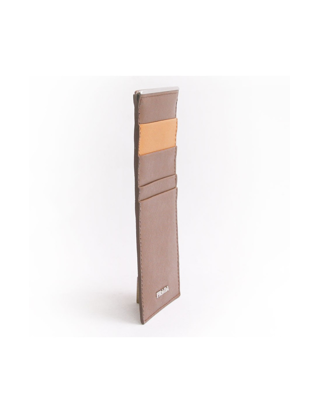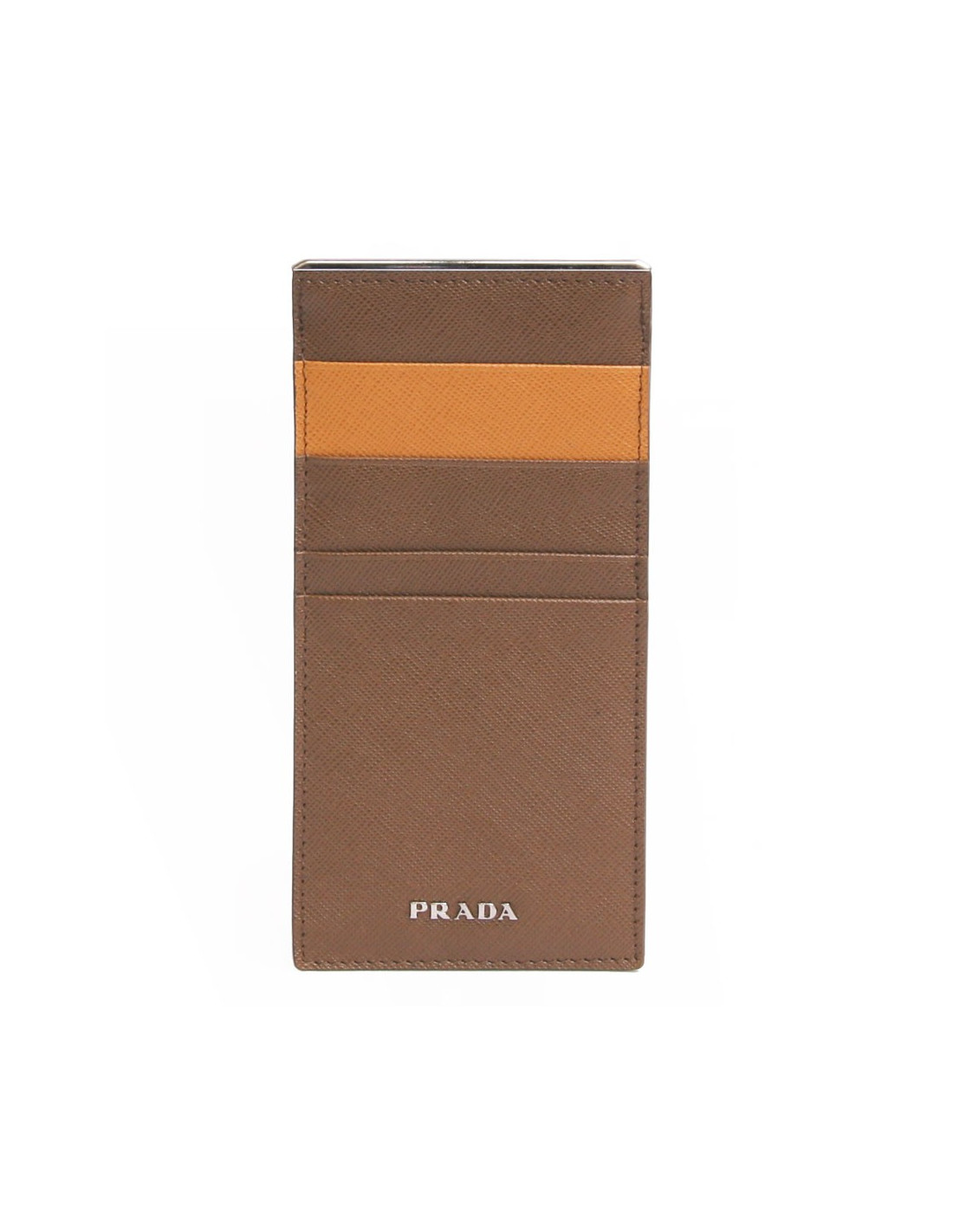 Porte-cartes extra-plat Prada, pour homme, en cuir grainé, de couleur marron clair et une fente jaune moutarde.Très bon état (jamais porté)