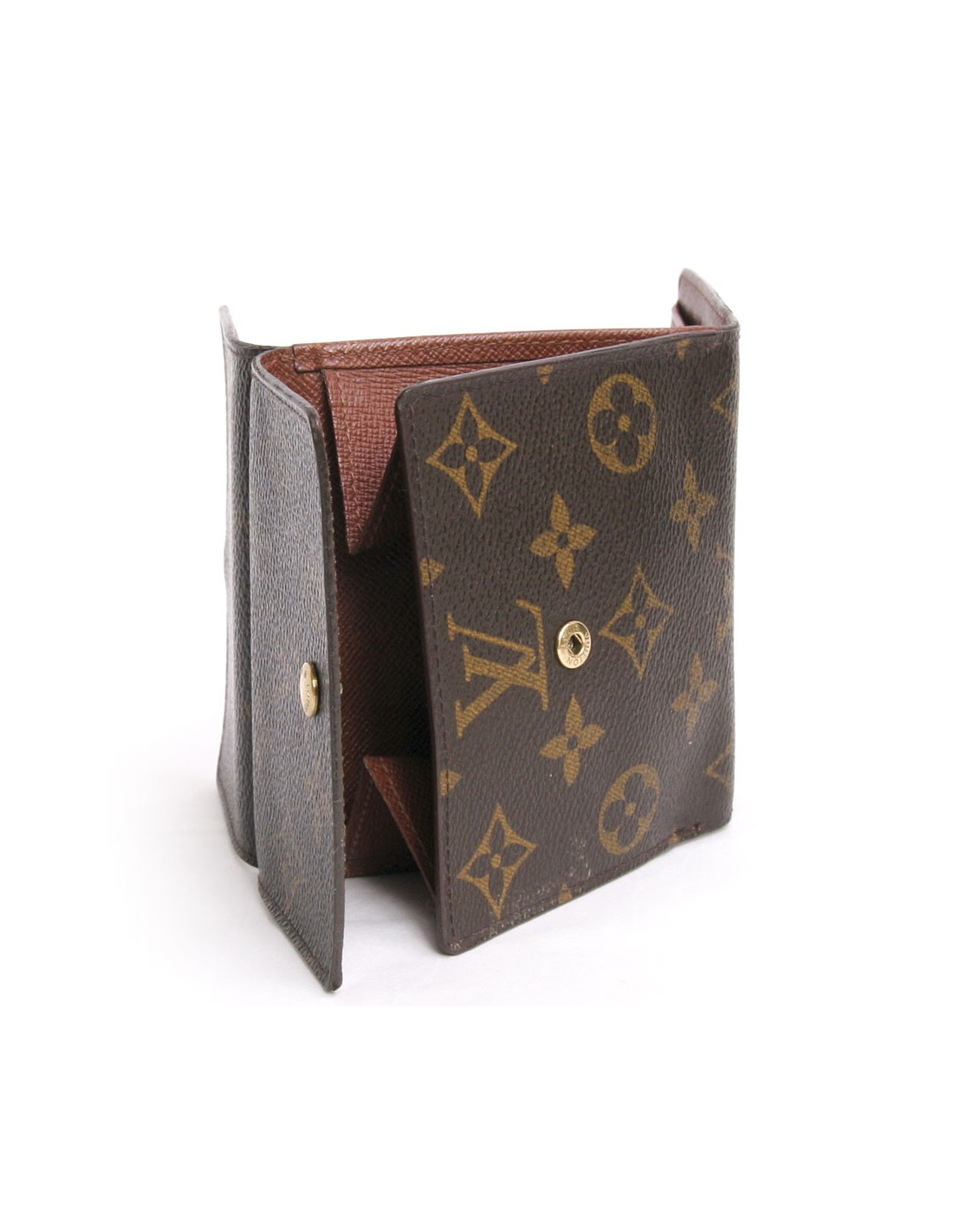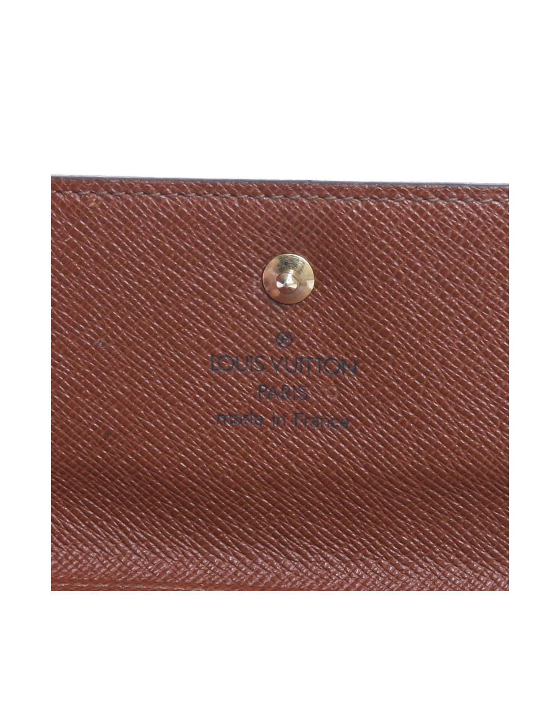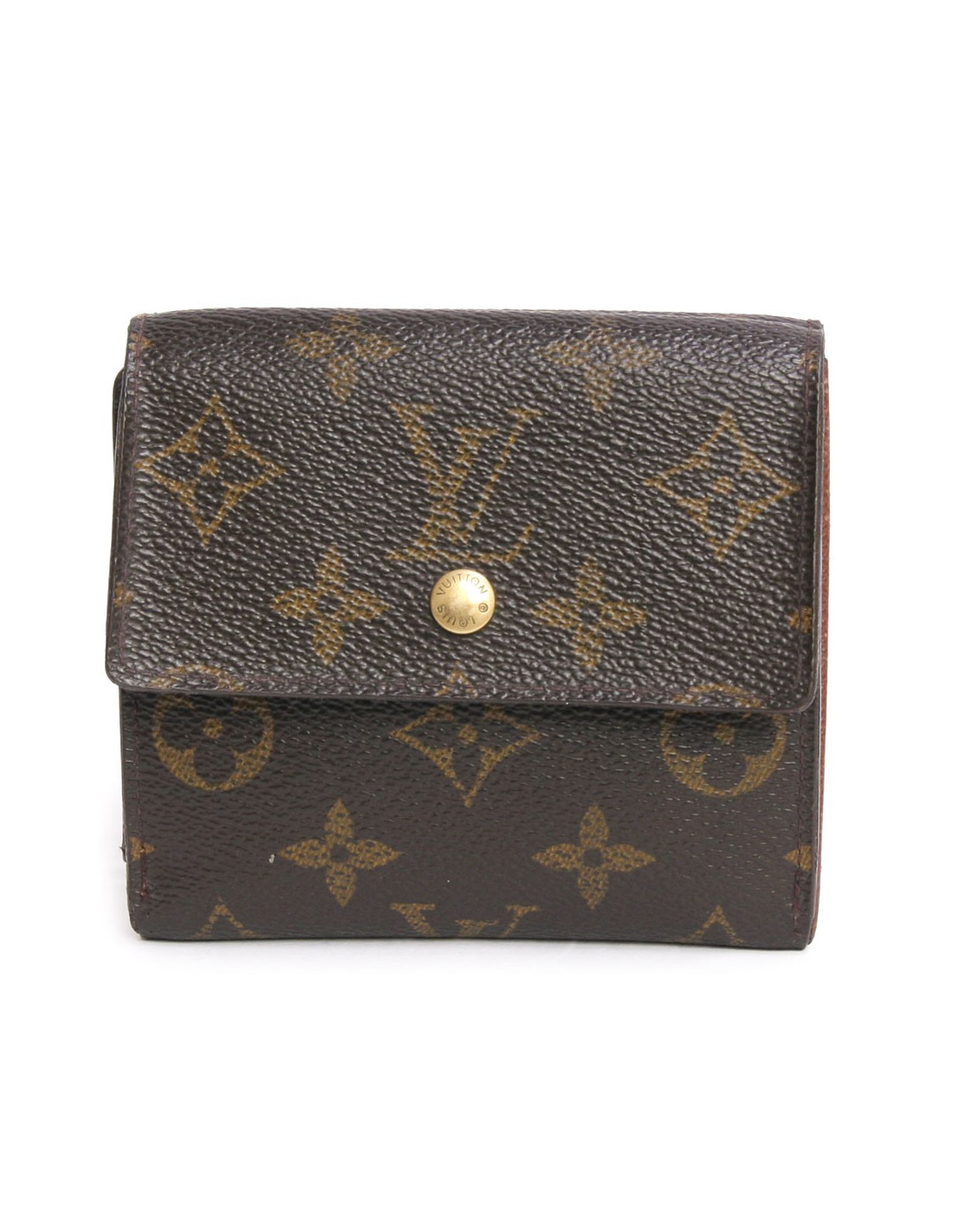 Porte-cartes, porte monnaie Louis Vuitton en toile monogram. Il dispose d'un emplaçement pour billets, 4 emplaçements pour carte bleue et deux emplaçements pour tickets. De l'autre côté, un porte monnaie. Fermeture par pression. En très bon état.