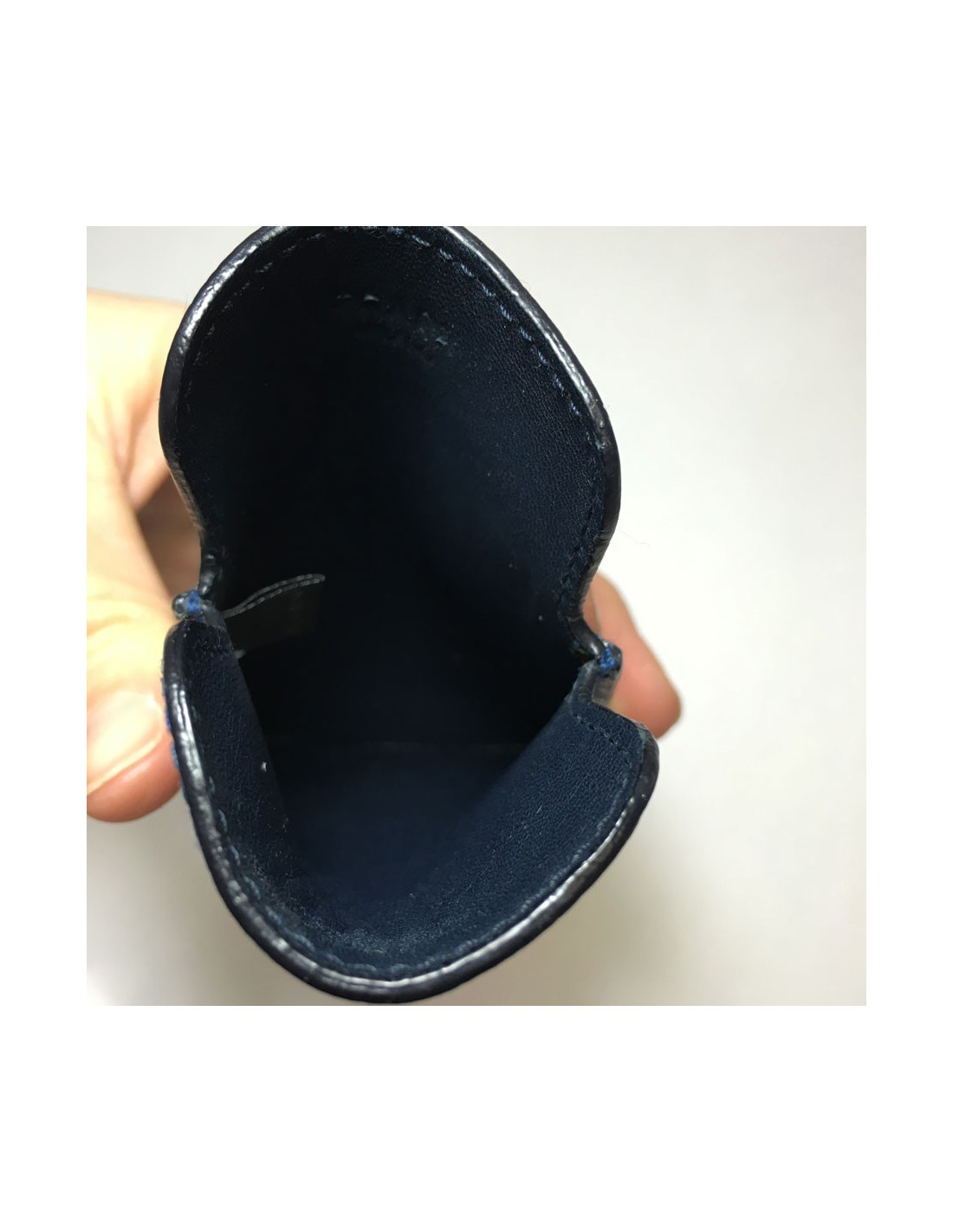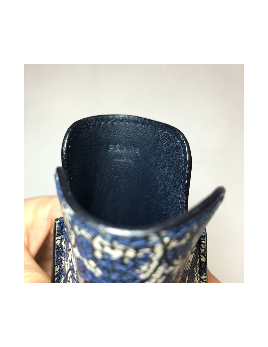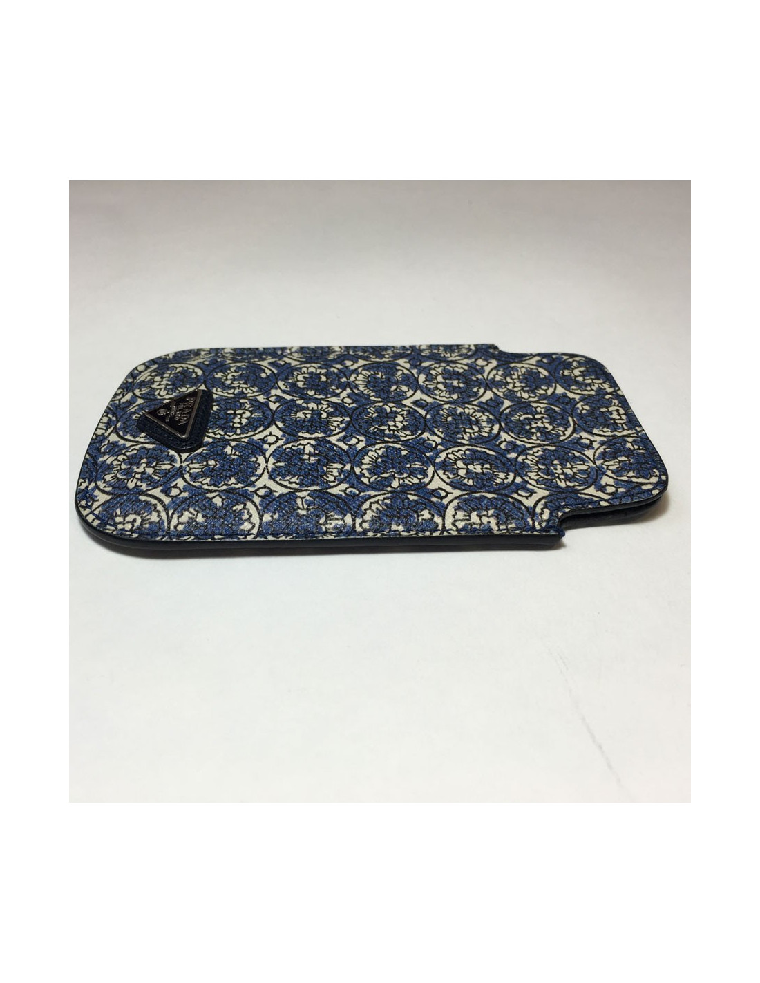 Très joli étui pour iPhone 4/4S en cuir saffiano imprimé de couleur dominante bleue marine et blanc, intérieur en agneau bleu marine. En très bon état (neuf).