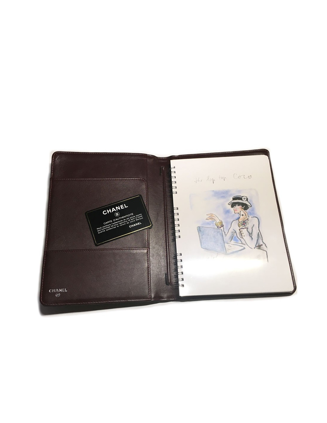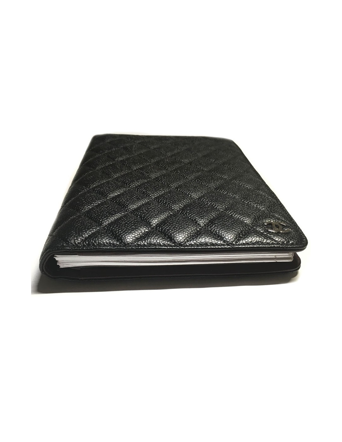 Porte agenda CHANEL en cuir matelassé noir. Petit CC argenté sur la couverture. Intérieur en cuir bordeaux et à spirales. 2 grandes fentes pour les documents, Une plus petite pour les cartes. Carnet d'adresses noir à la fin du porte agenda.