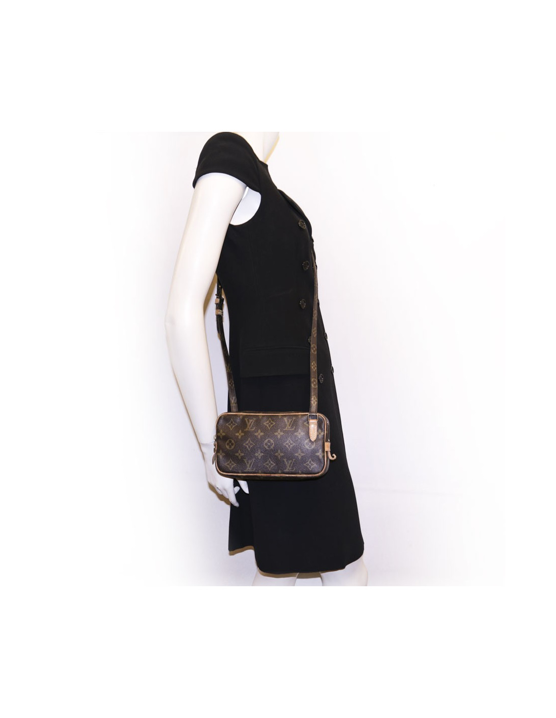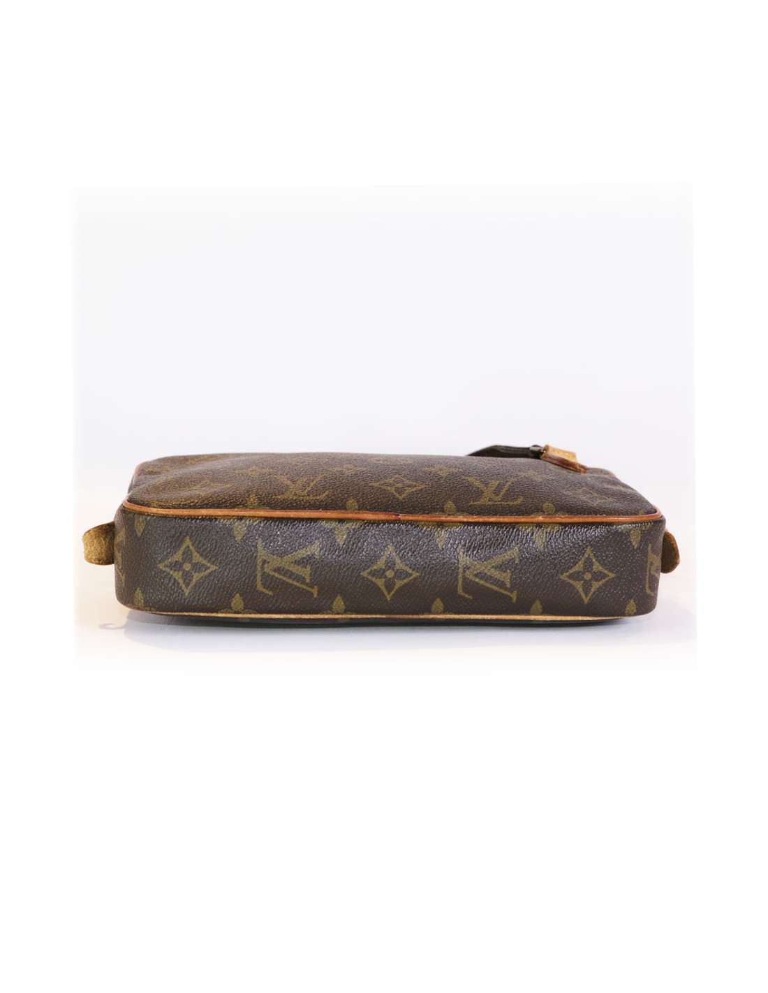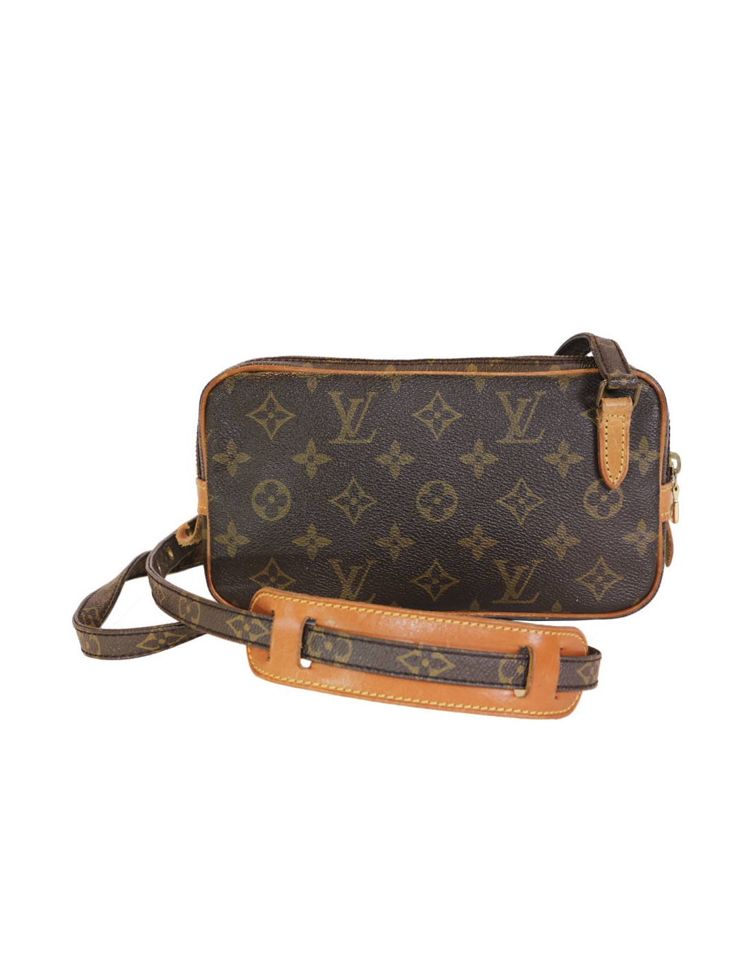 Sac pochette de la Maison Louis Vuitton en toile monogram marron avec une bandoulière réglable. Fermeture zippée. La bijouterie est en laiton doré. L'intérieur est en toile plastifiée marron. Hologramme: 890.... En très bon état. Les pièces en cuir de vache sont patinées dû à l'usage quotidien.