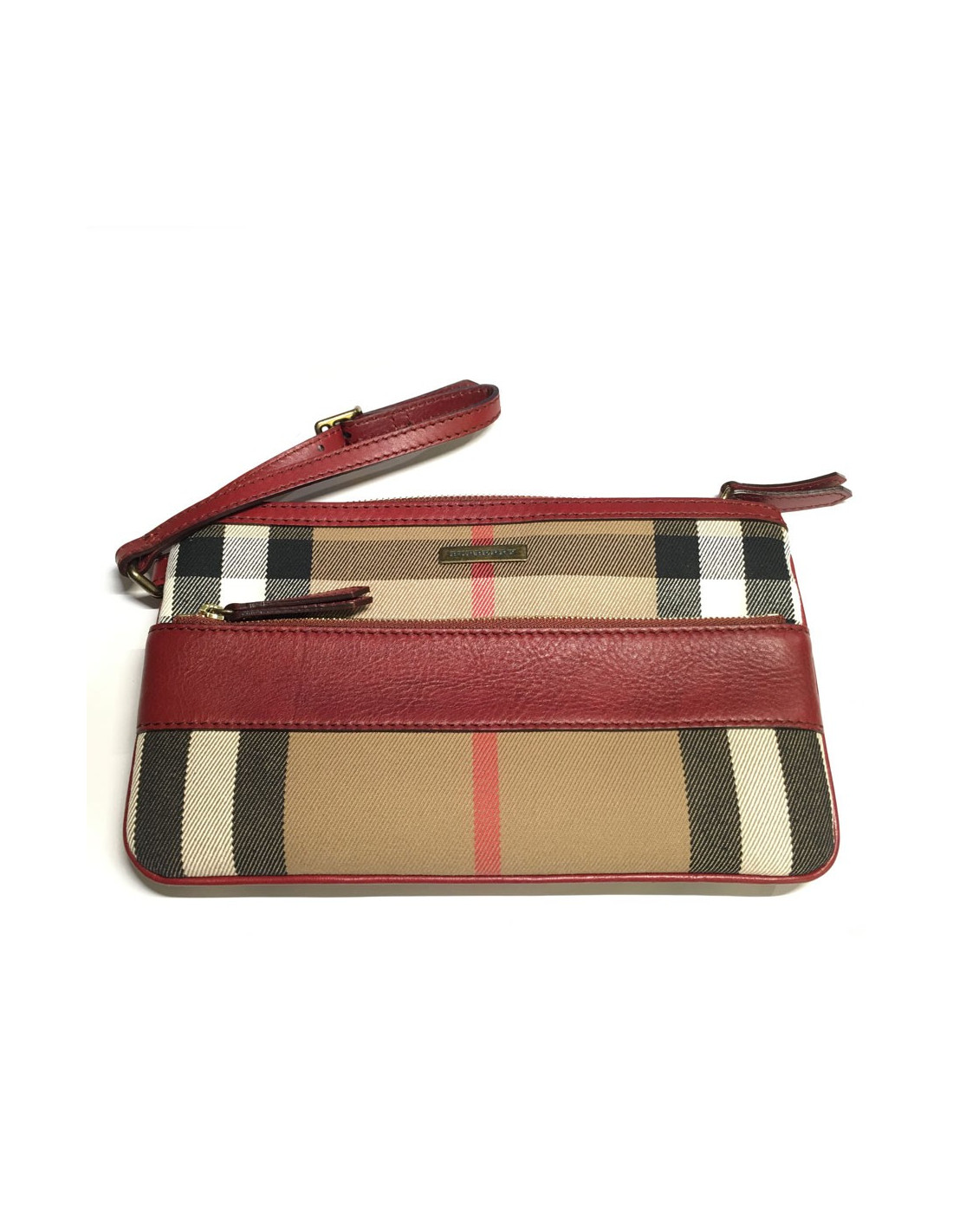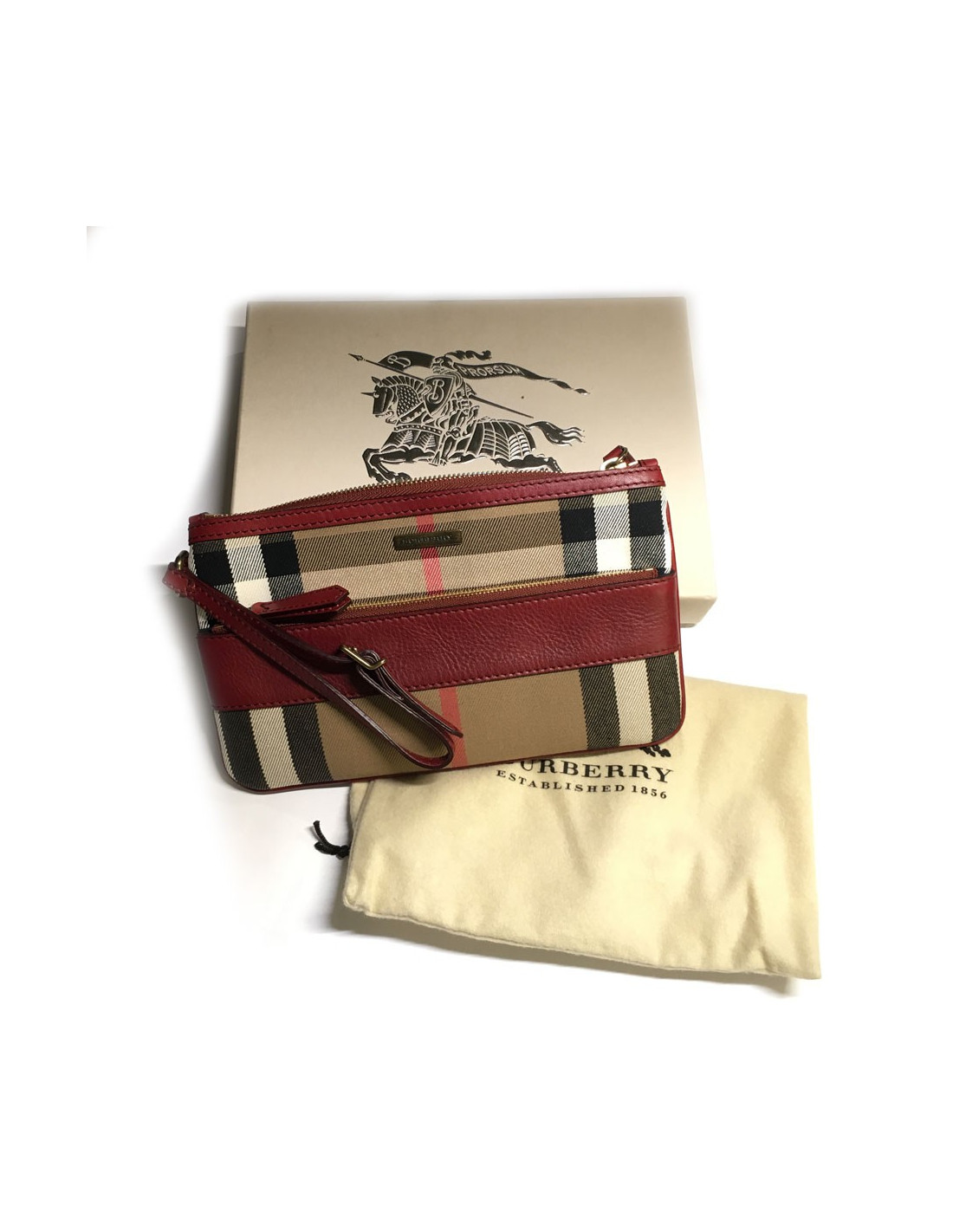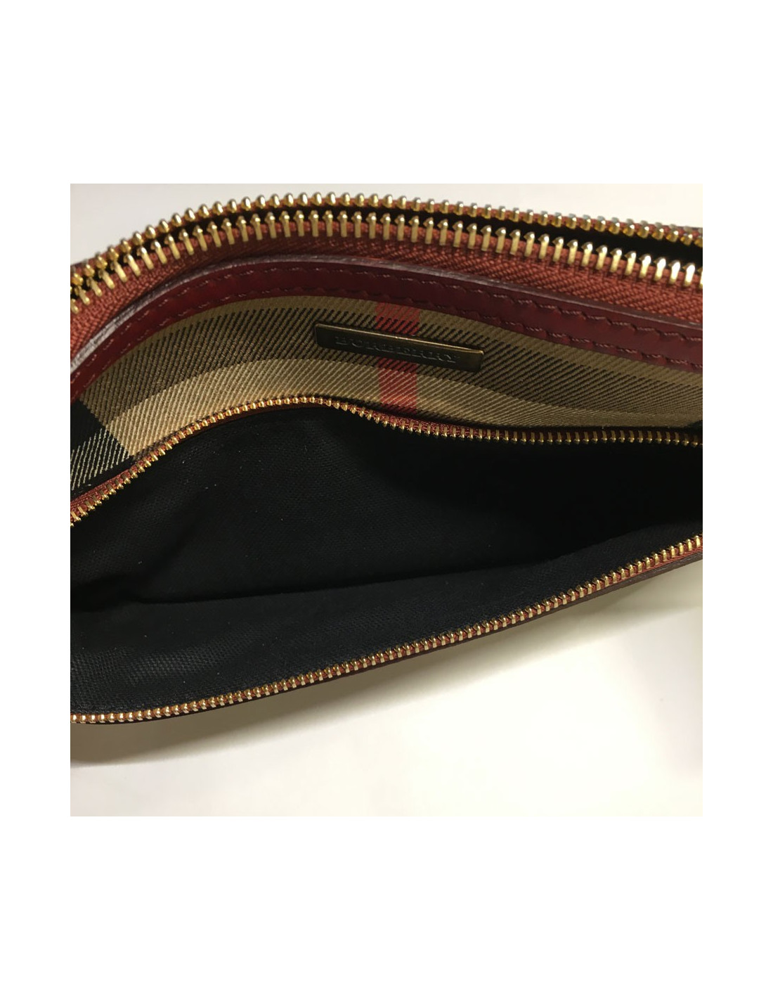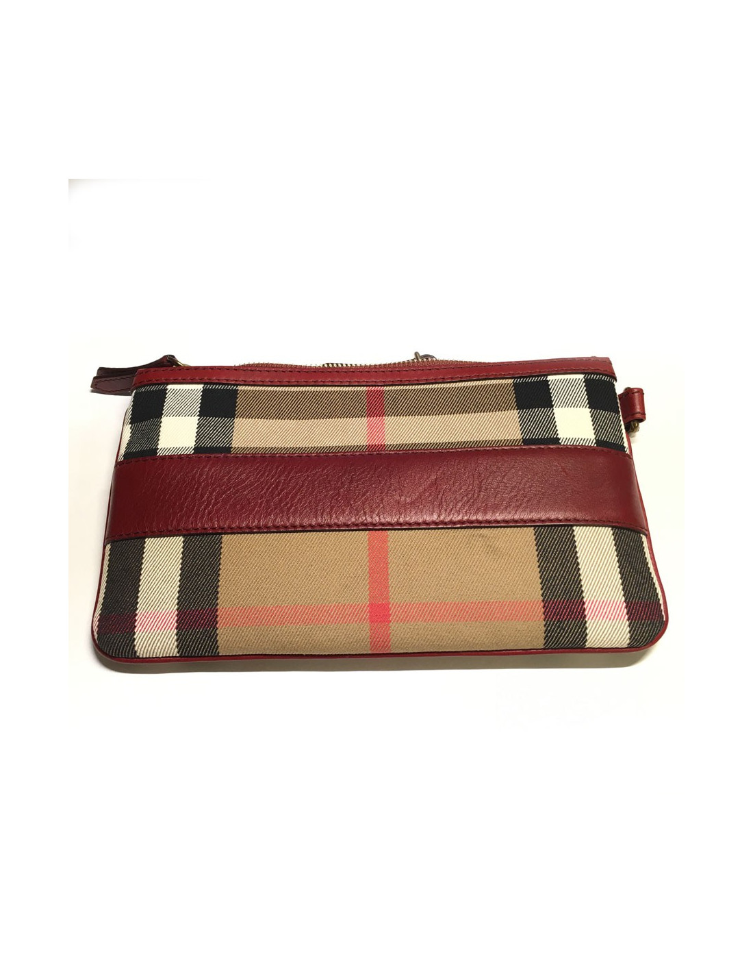 Pochette BURBERRY Haymarket Check en toile et cuir bordeaux. S'ouvre par un zip, une anse en cuir permet de porter cette pochette au poignet. Intérieur en tissu noir.