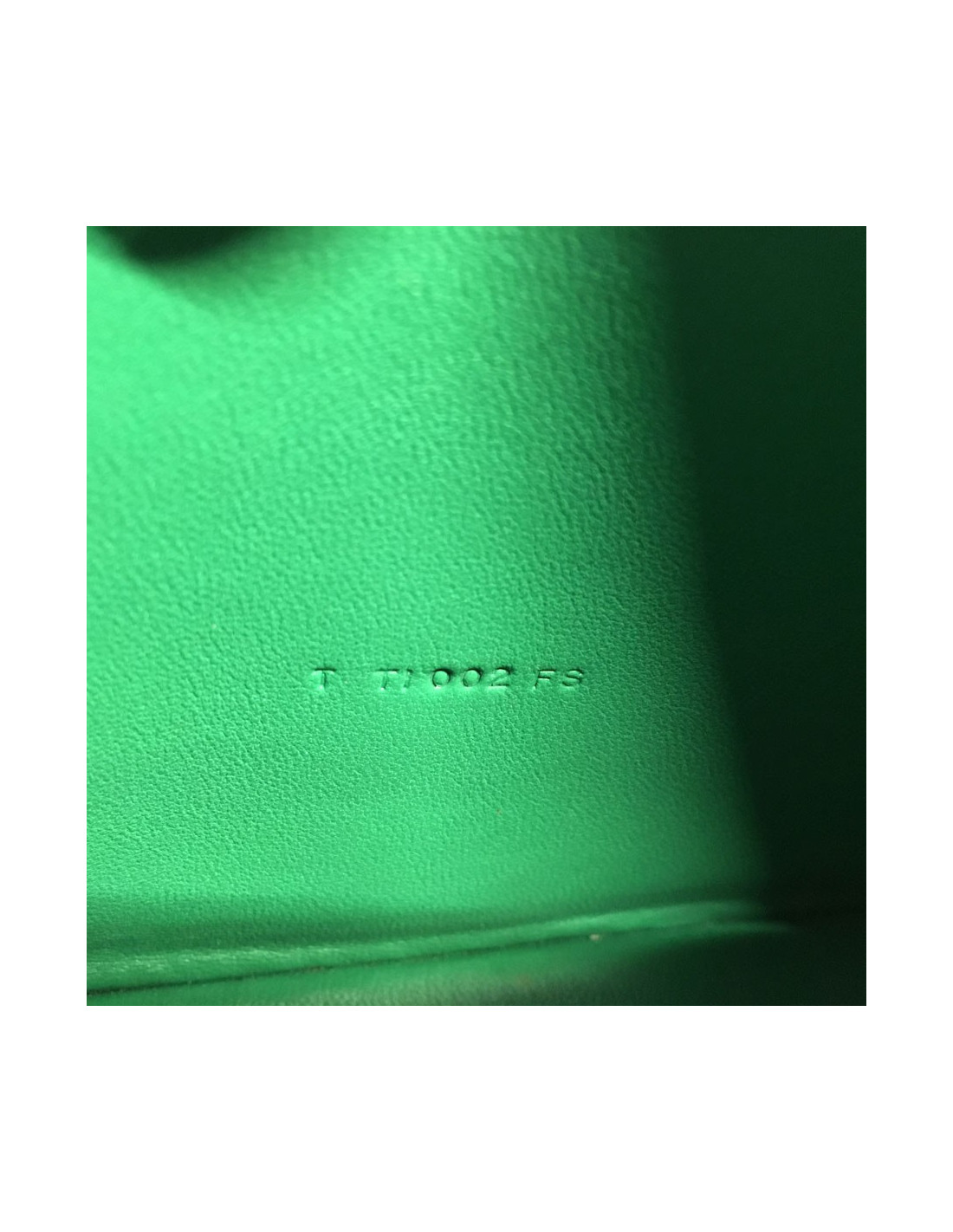 en cuir togo vert bamboo, doublé agneau, fermeture clou de selle. En très bon état. Une pochette zippée au dos. 8 fentes à cartes de crédit et 2 grandes fentes à billets.