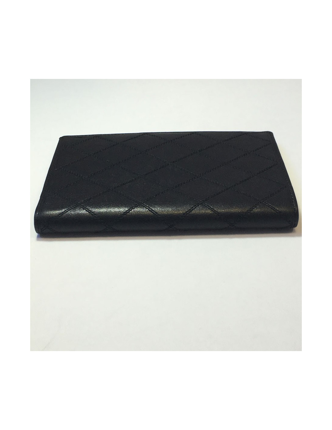 Portefeuille CHANEL en cuir noir matelassé vintage. Surpiqûres noires. Inscription CHANEL en lettres dorées à l'intérieur. 1 grande fente à billet, 4 fentes moyennes et 6 fentes à cartes de crédit.
