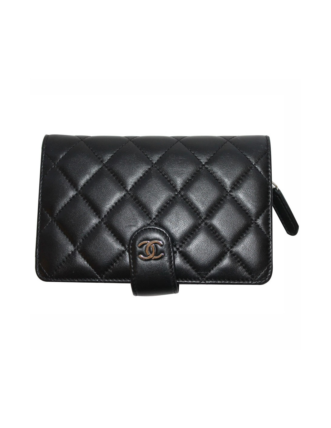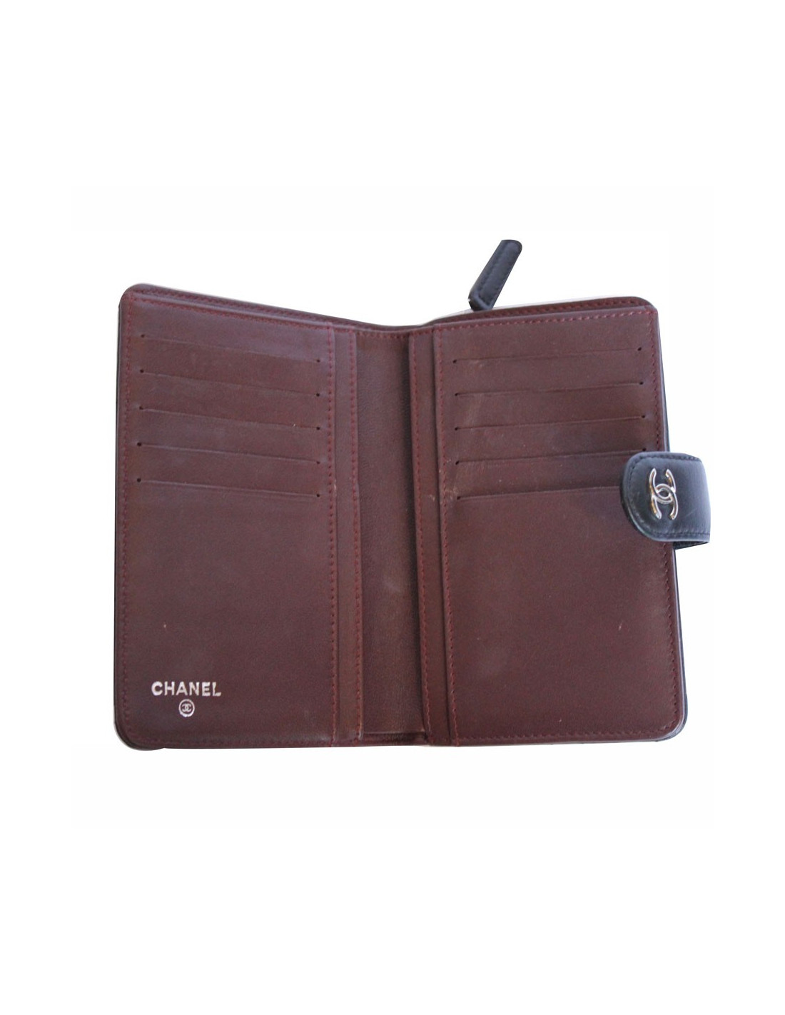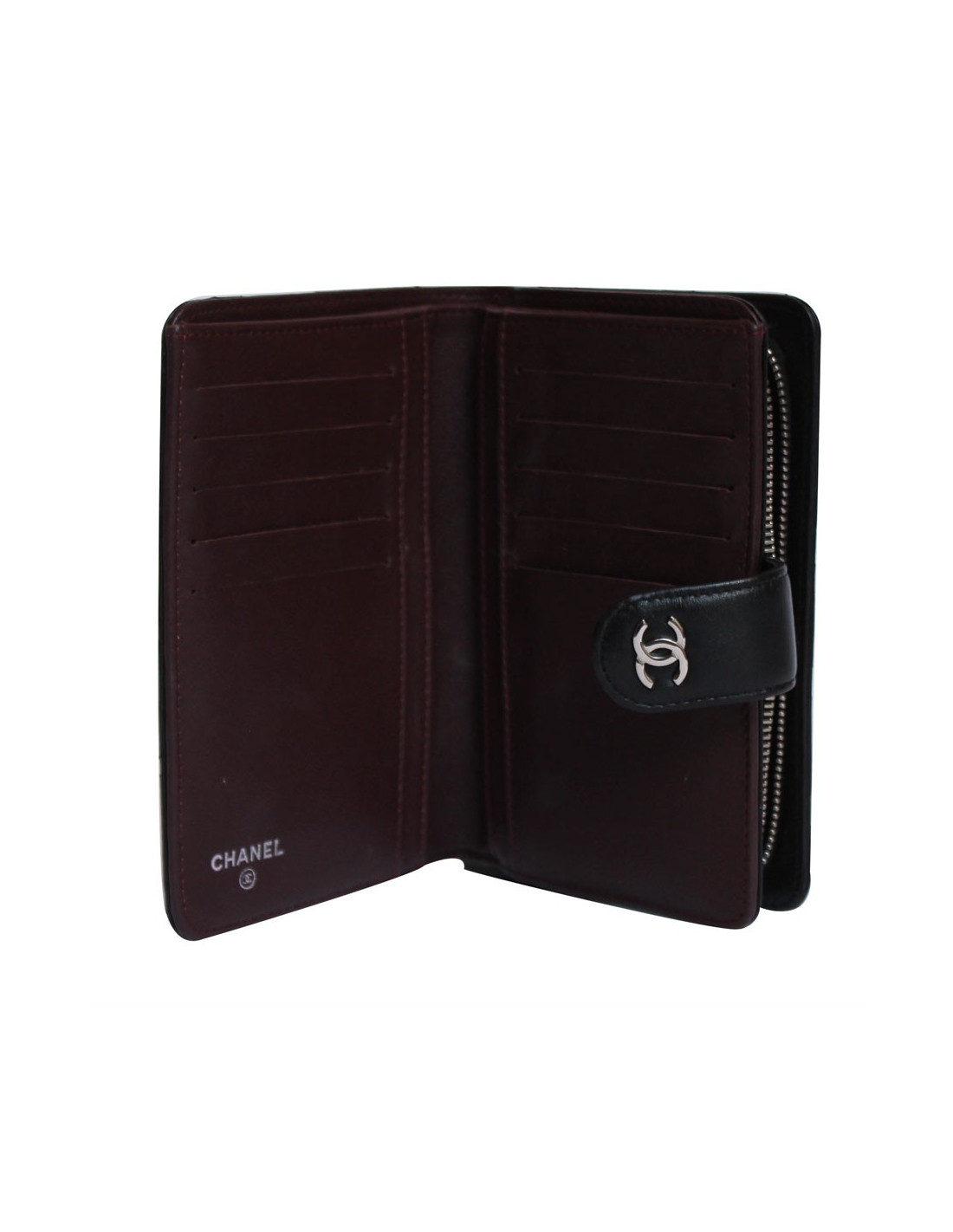 Portefeuille de la Maison Chanel en cuir matelassé noir. Bijouterie en métal argenté. Il contient deux espaces de rangement. Le premier avec fermeture par bouton pression avec 10 fentes pour carte bleue, 1 grande fente à billet et 4 fentes moyennes. Le deuxième pour la monnaie avec fermeture zippée. Hologramme: 1679.... et sa carte d'authenticité. En très bon état.