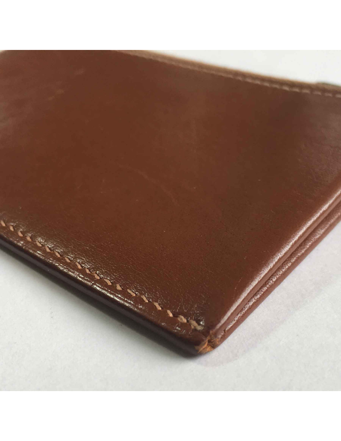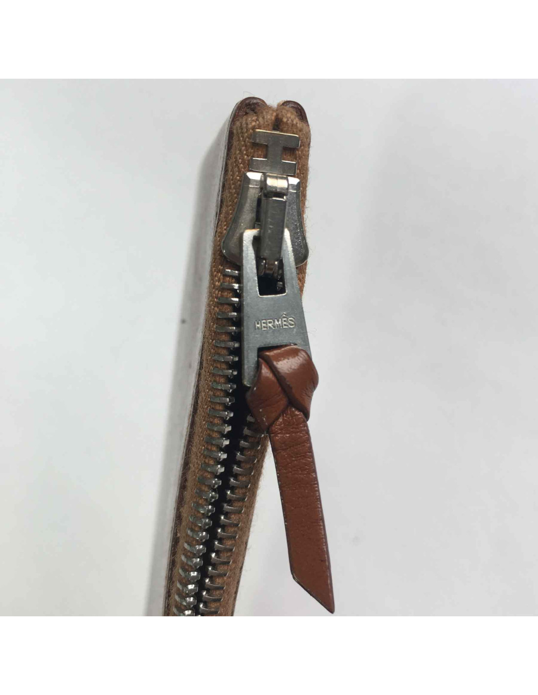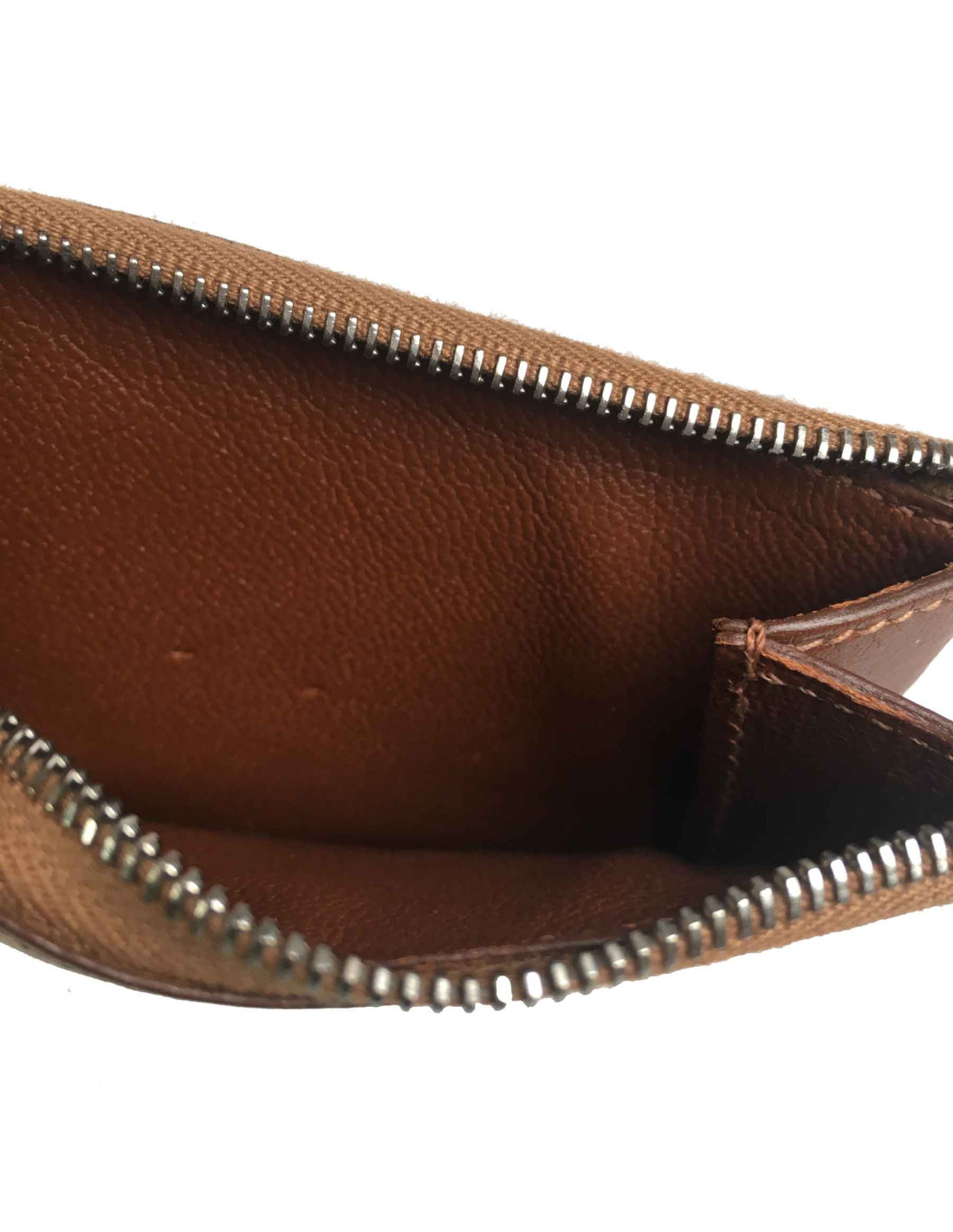 Porte-cartes Hermès en veau barénia marron. Une petite fente à l'extérieur et une fente centrale zippée.