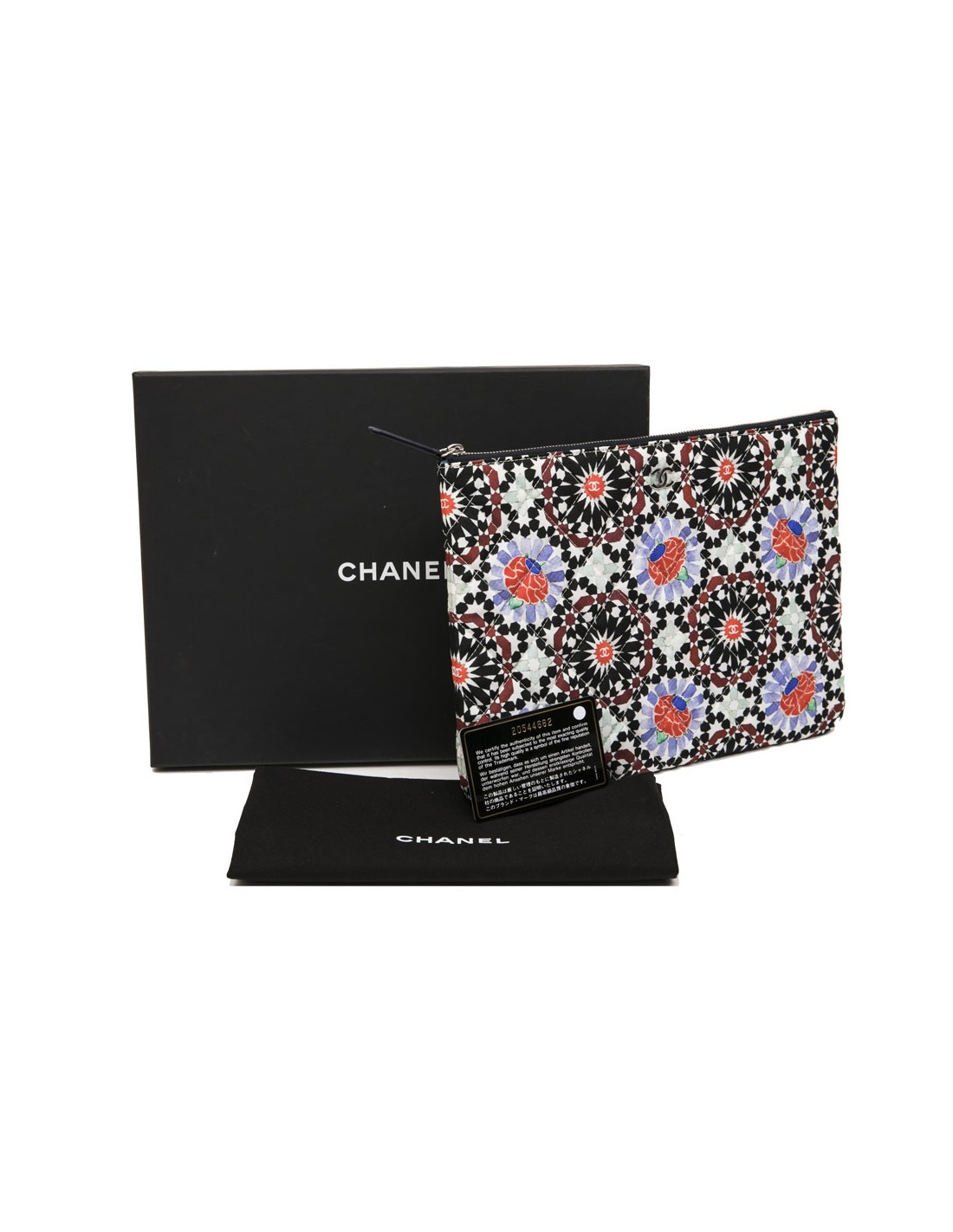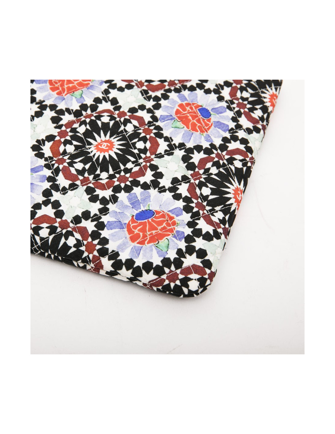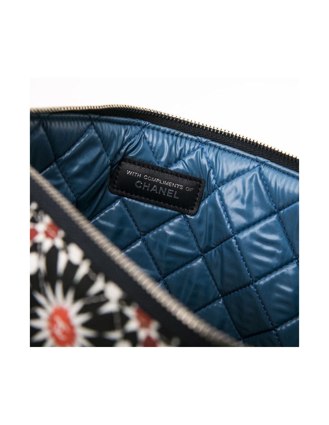 Pochette Chanel Paris-Dubai", en tissu matelassé. Fermeture zippée. Bijouterie argentée. L'intérieur est en matière imperméable bleu.