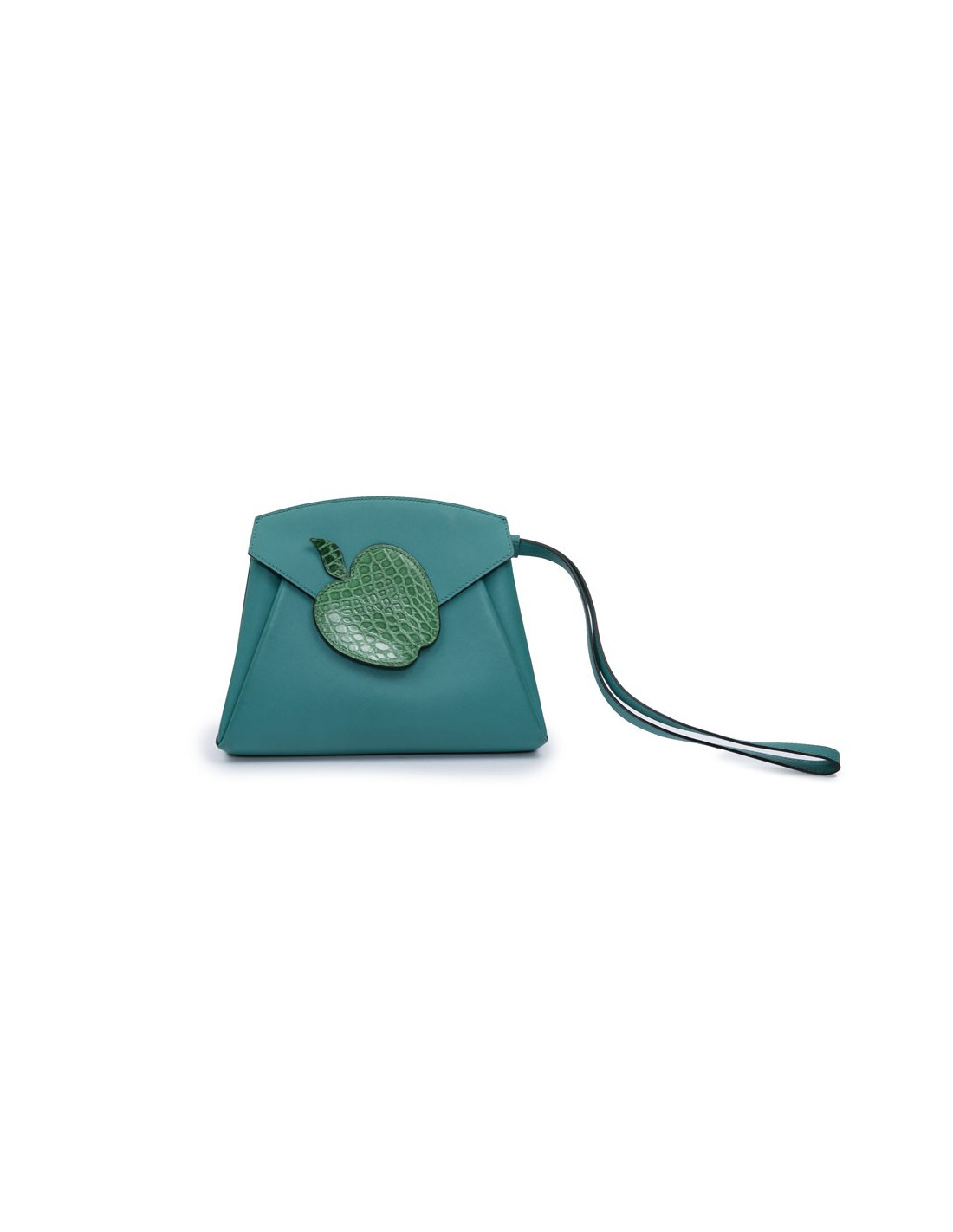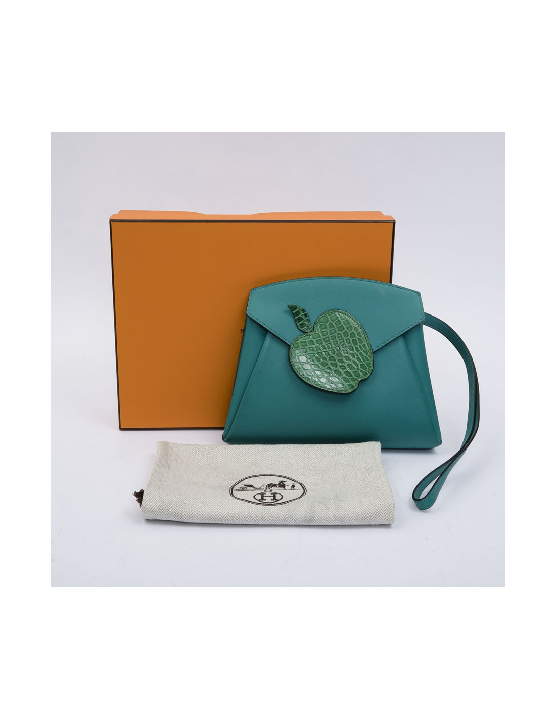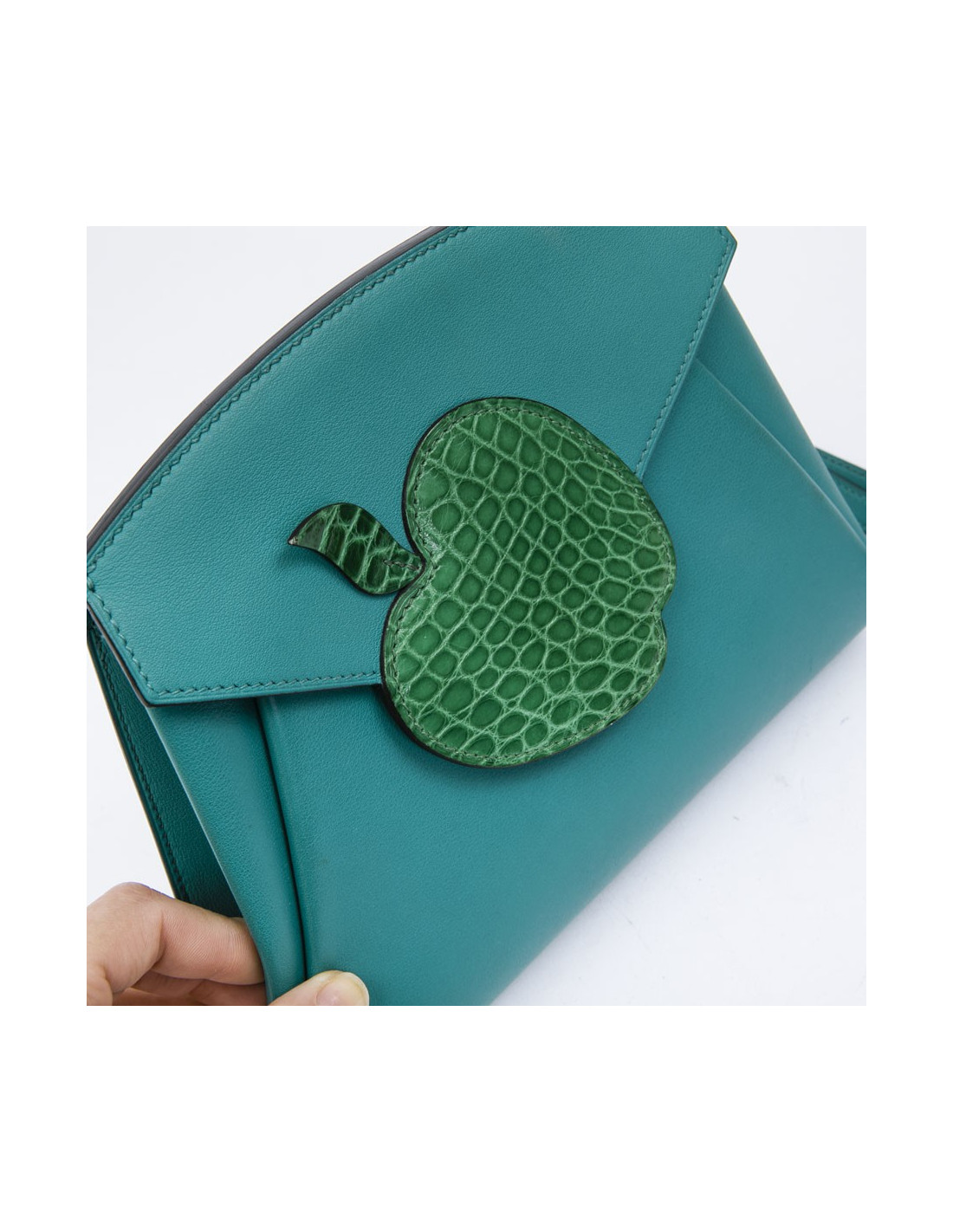 Sac pochette Hermès collection Tutti Frutti Hermail en cuir tadelakt bleu paon et empiècement pomme en crocodile vert. Collection Printemps-Eté 2006.Fermeture par bouton pression. L'intérieur dispose d'une grande poche plate. Anse en cuir. Made in France