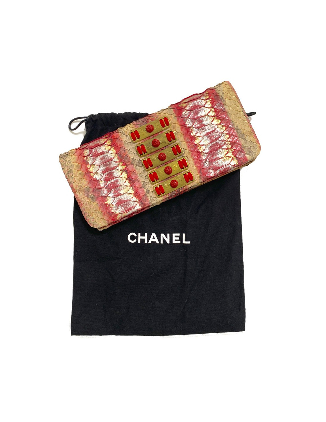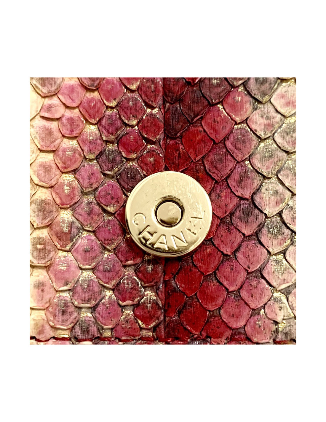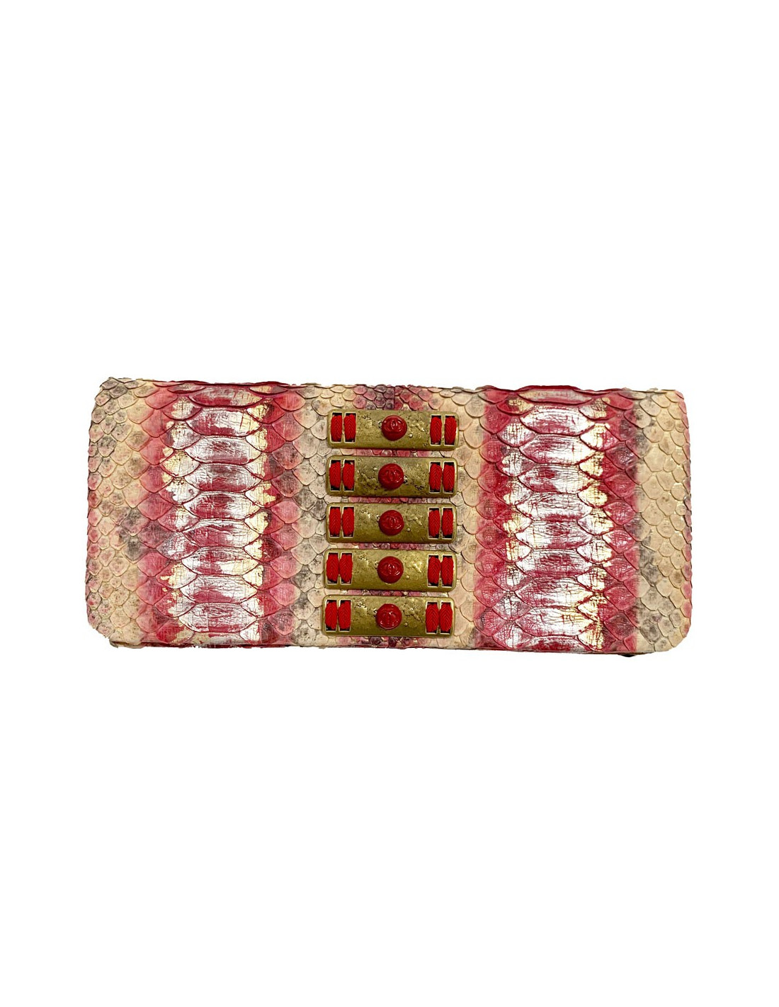 Sublime! Pochette couture de la Maison CHANEL entièrement en python dont les couleurs sont un dégradé du beige vers le rouge en passant par le rose. 5 pièces métalliques rectangulaires décorées se situent au centre de la pochette dans un métal or vieilli. La pochette se ferme par un bouton pression.
