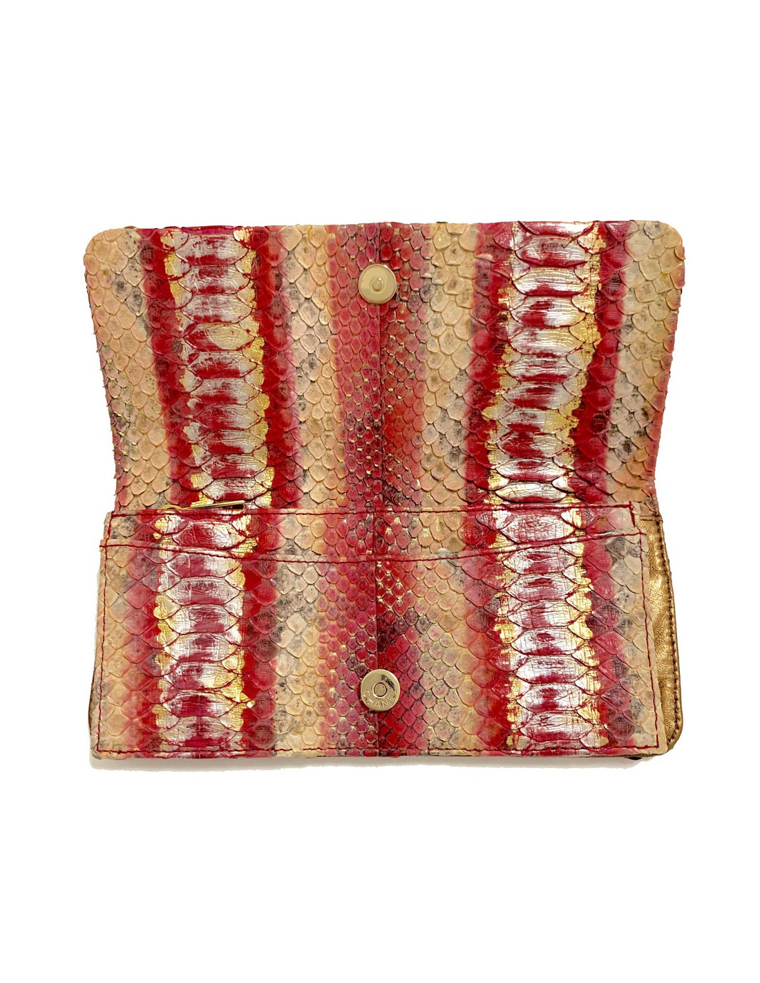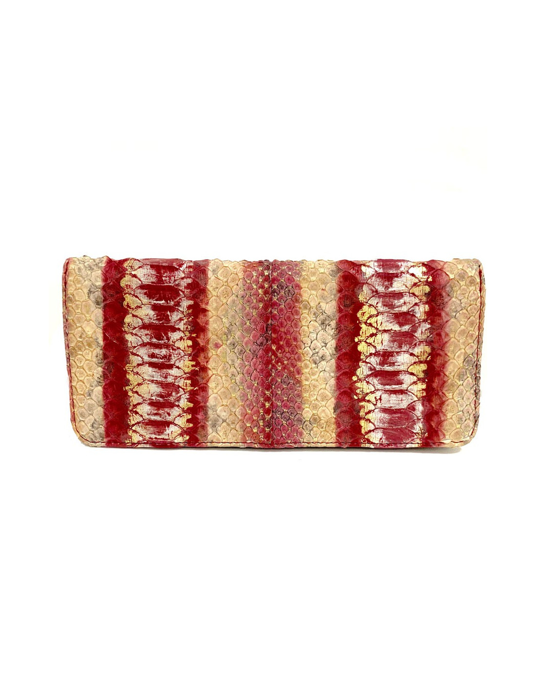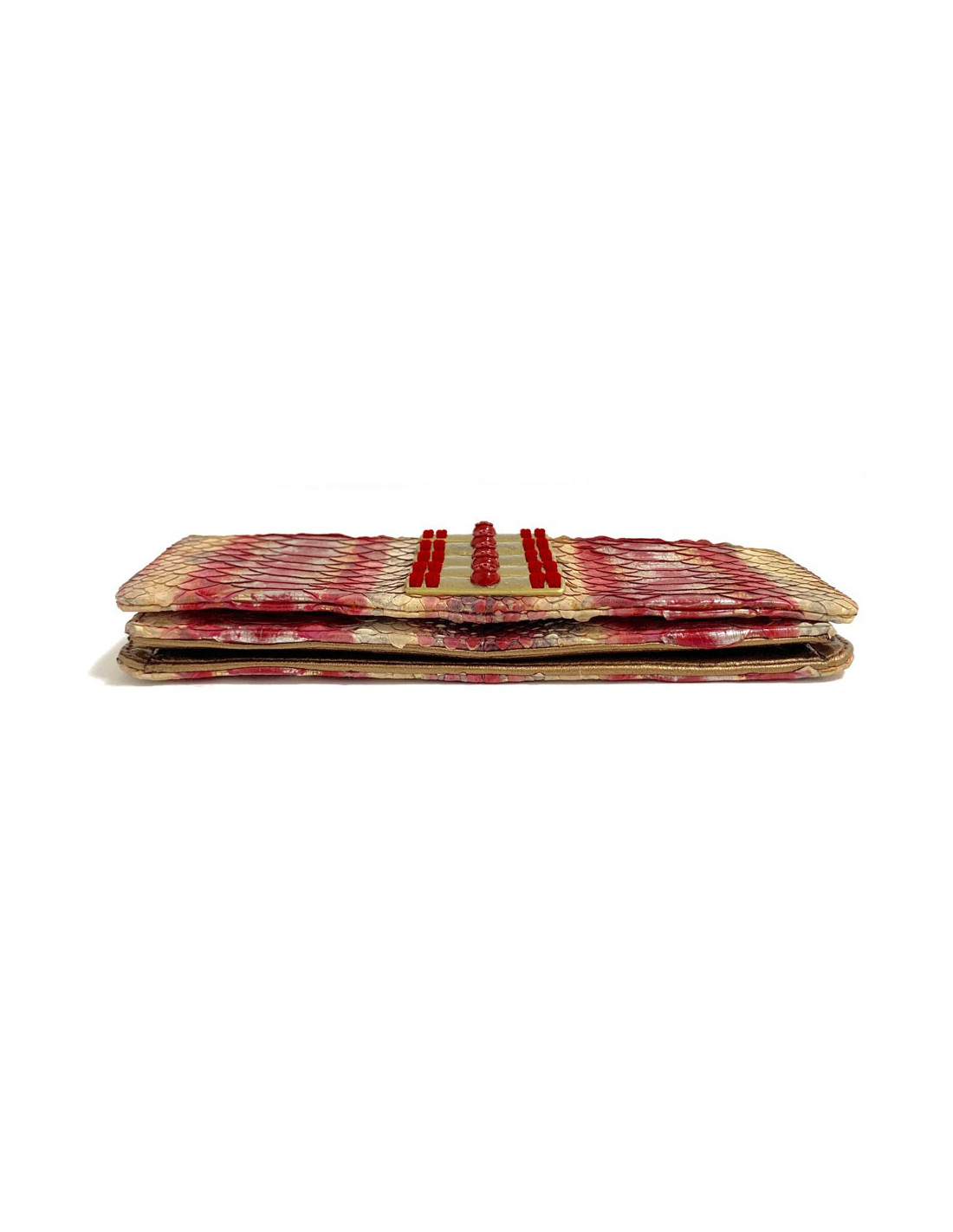 Sublime! Pochette couture de la Maison CHANEL entièrement en python dont les couleurs sont un dégradé du beige vers le rouge en passant par le rose. 5 pièces métalliques rectangulaires décorées se situent au centre de la pochette dans un métal or vieilli. La pochette se ferme par un bouton pression.