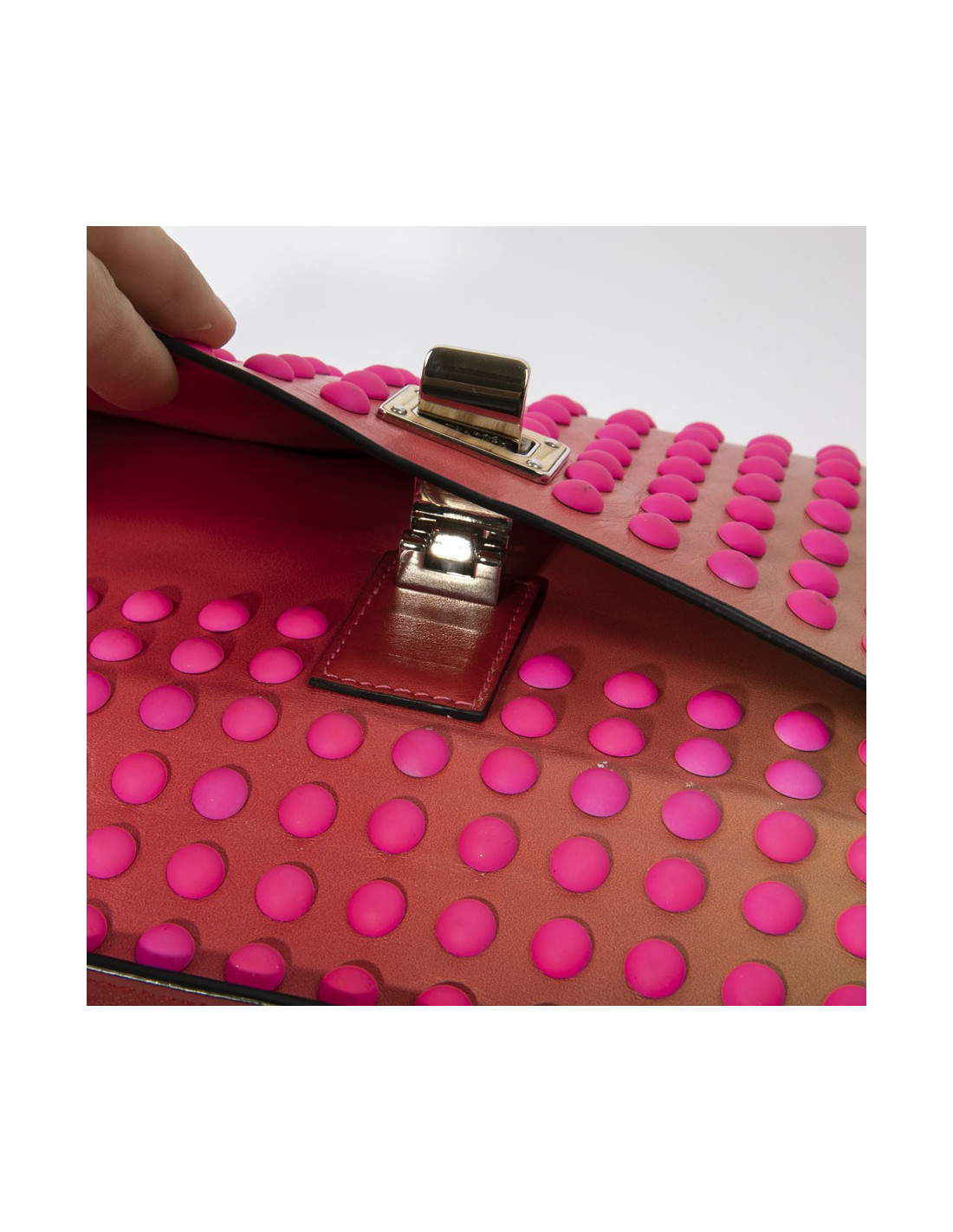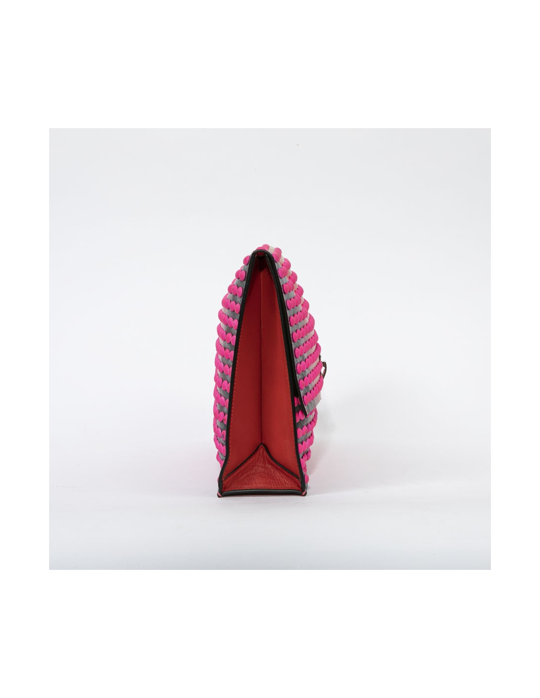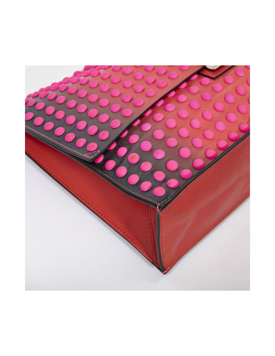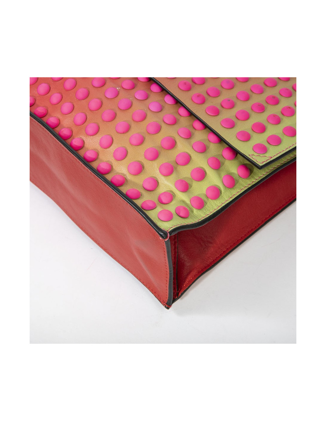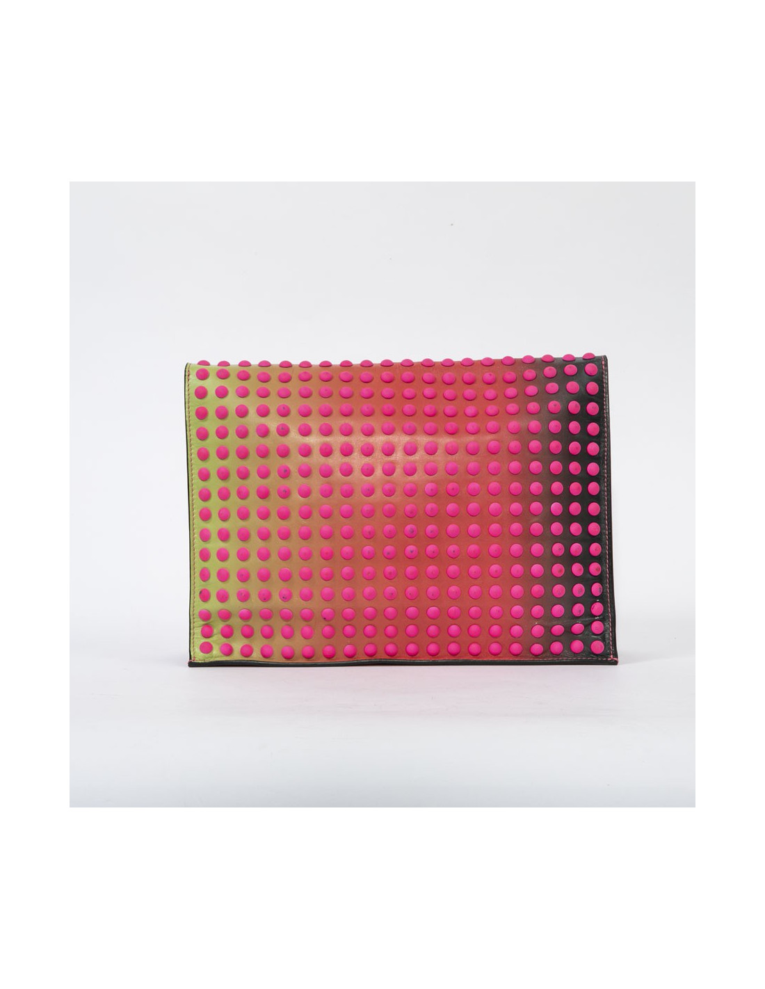 Pochette PROENZA SCHOULER en PVC dégradé de couleurs (gris foncé, rouge, vert). Picots en gomme rose fushia. Fermoir en métal doré pâle et corne. Doublure intérieure en cuir rouge. Poche plate à l'intérieur.