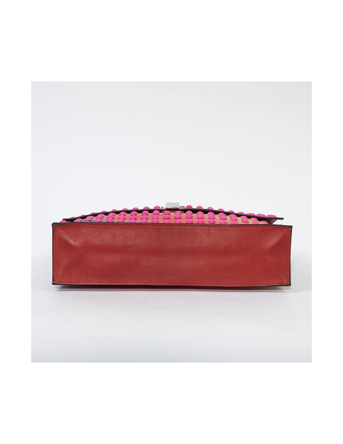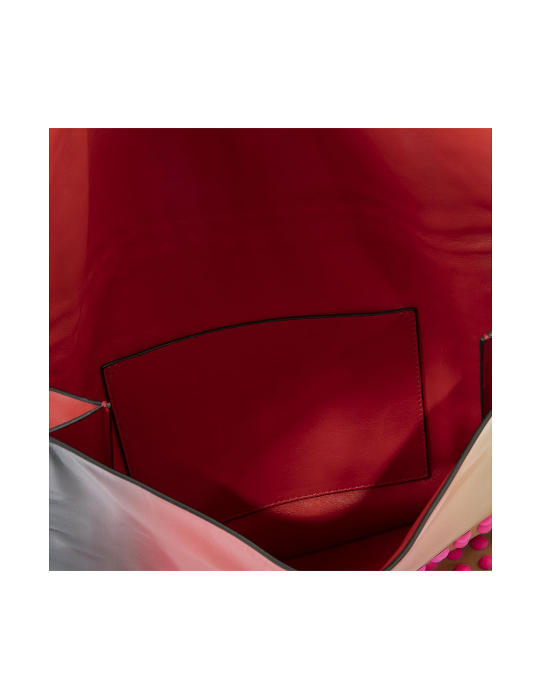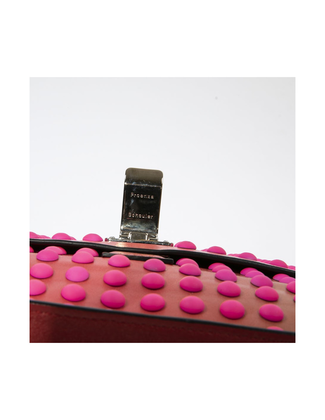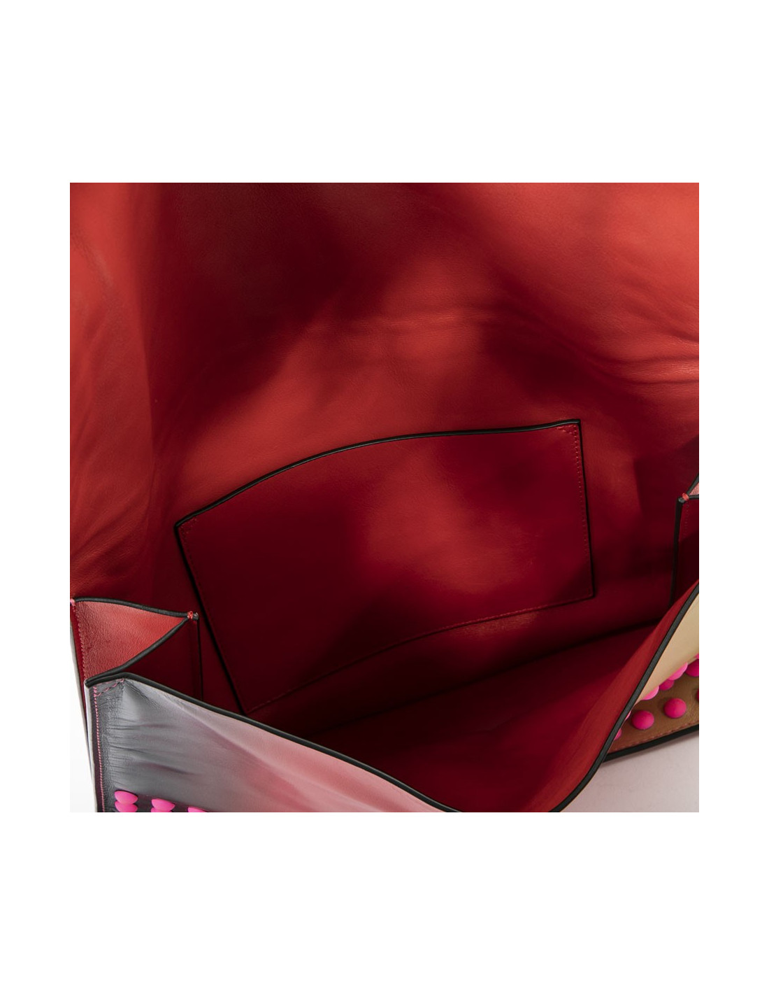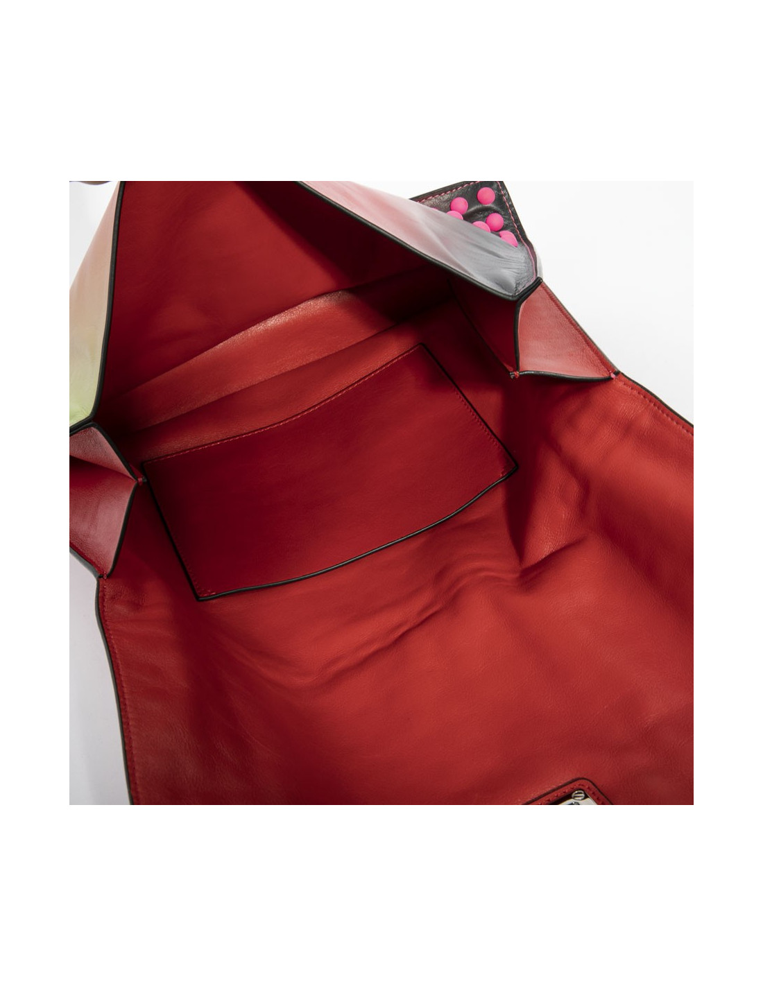 Pochette PROENZA SCHOULER en PVC dégradé de couleurs (gris foncé, rouge, vert). Picots en gomme rose fushia. Fermoir en métal doré pâle et corne. Doublure intérieure en cuir rouge. Poche plate à l'intérieur.