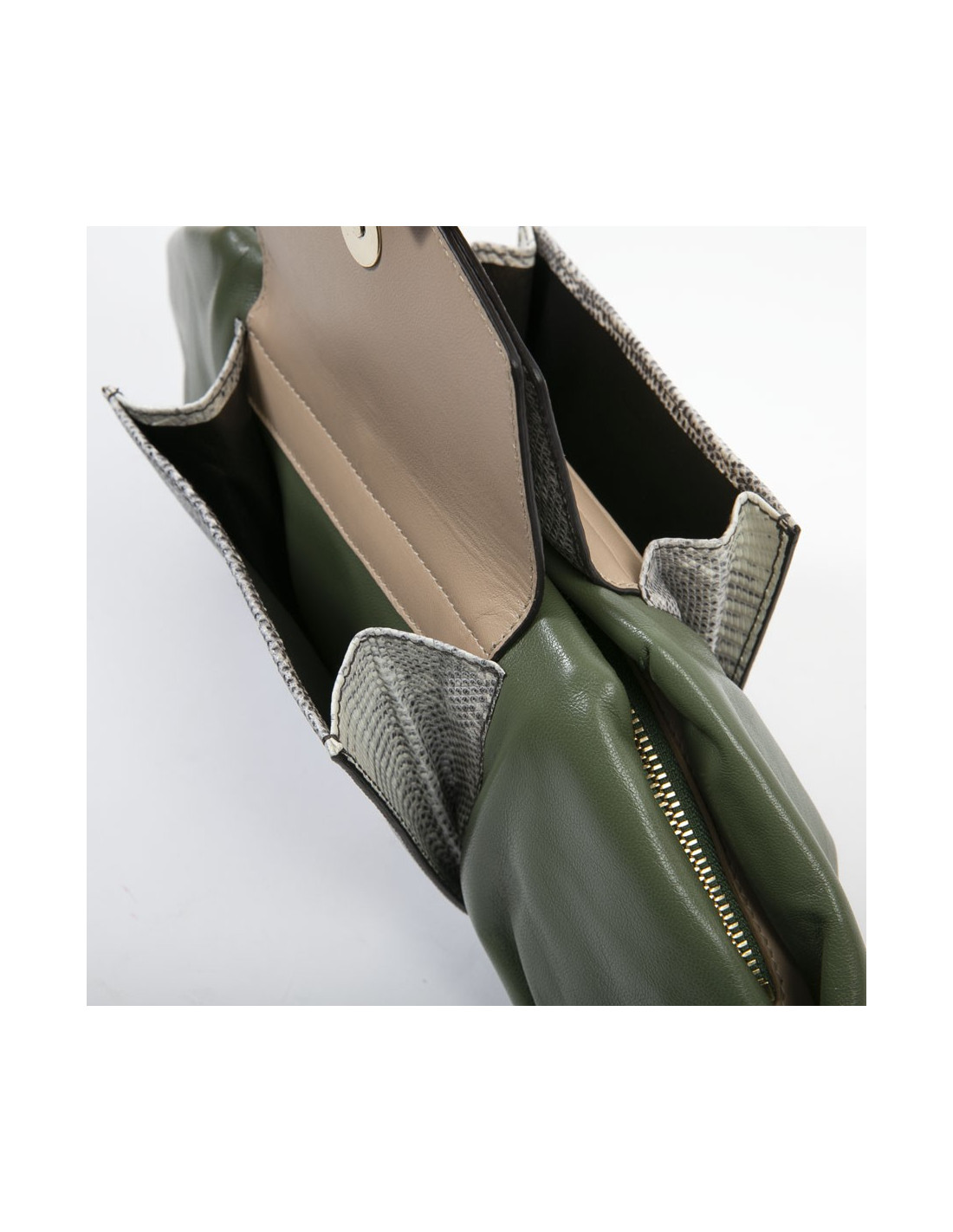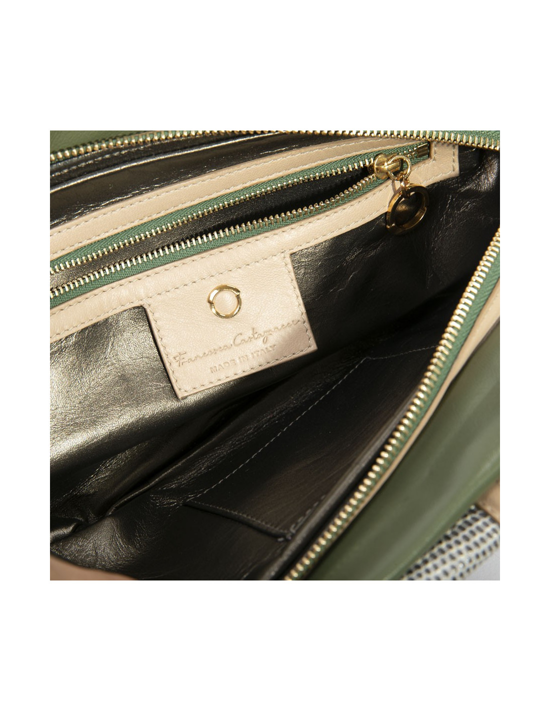 Intérieur : doublé en cuir vert foncé irisé, avec poche zippée