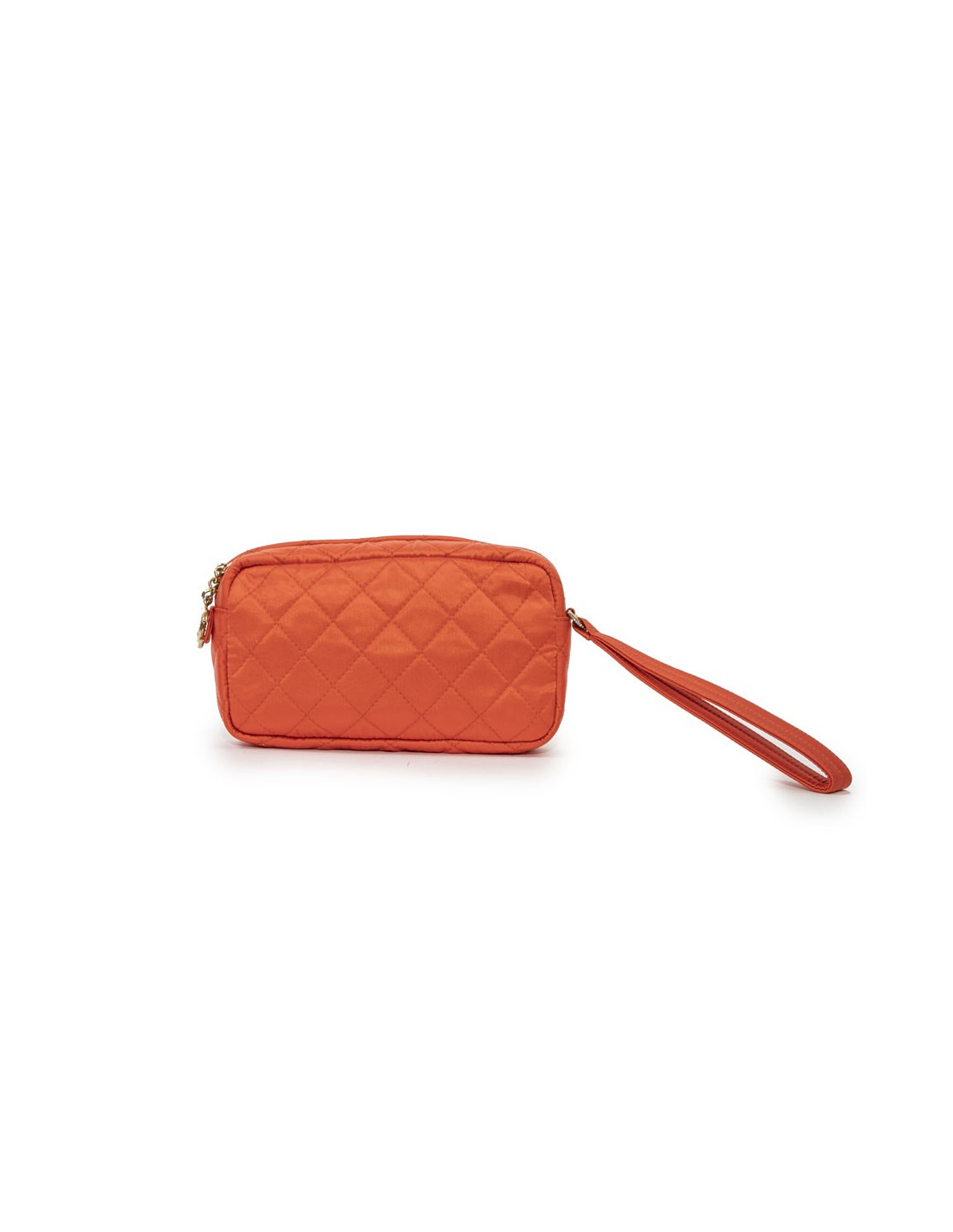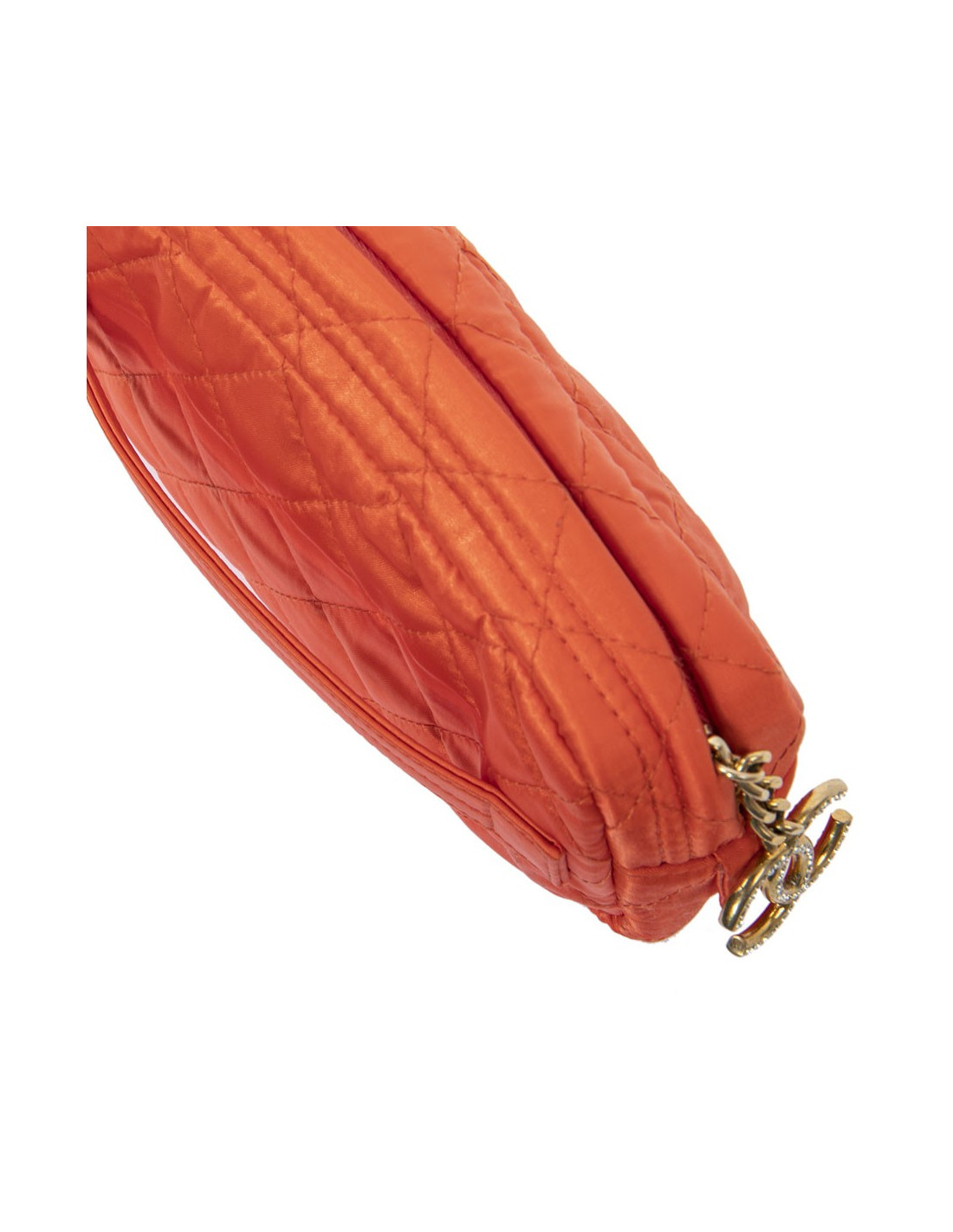 Cette petite pochette CHANEL d'occasion est en satin orange avec lanière pour un porté main ou poignet, et en possède une seconde sur l'un des côtés. Elle a une fermeture zippée dorée avec un charms " CC " en strass dorés (5 mini strass manquants). La doublure intérieure est en satin. Elle a une poche plate à l'intérieur. Elle est en très bon état, aucune trace d'usure ou de tache.
