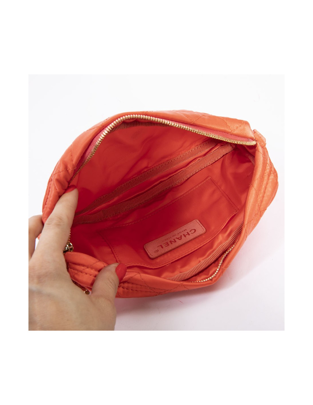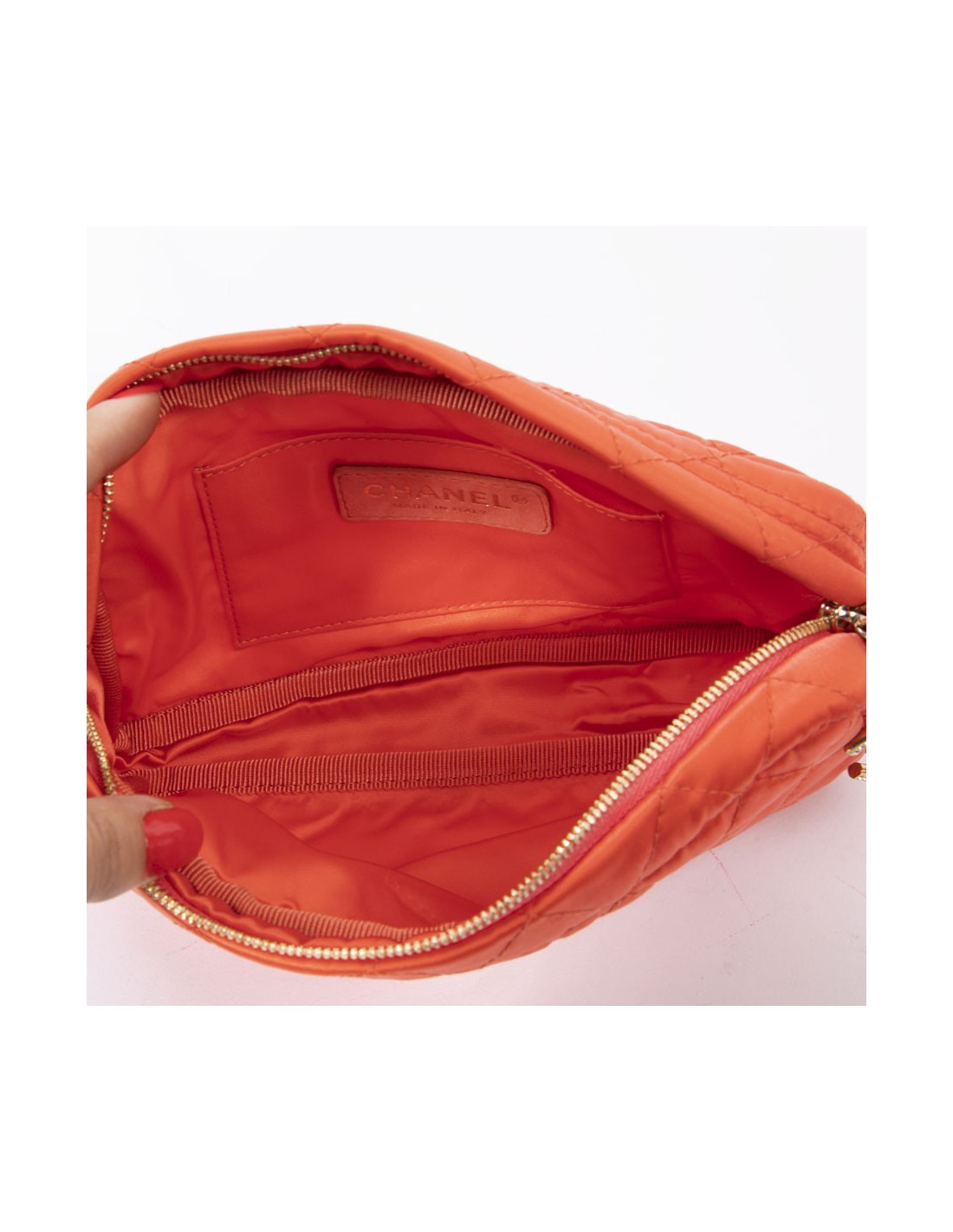 Cette petite pochette orange en satin CHANEL porte la mention Made in Italy