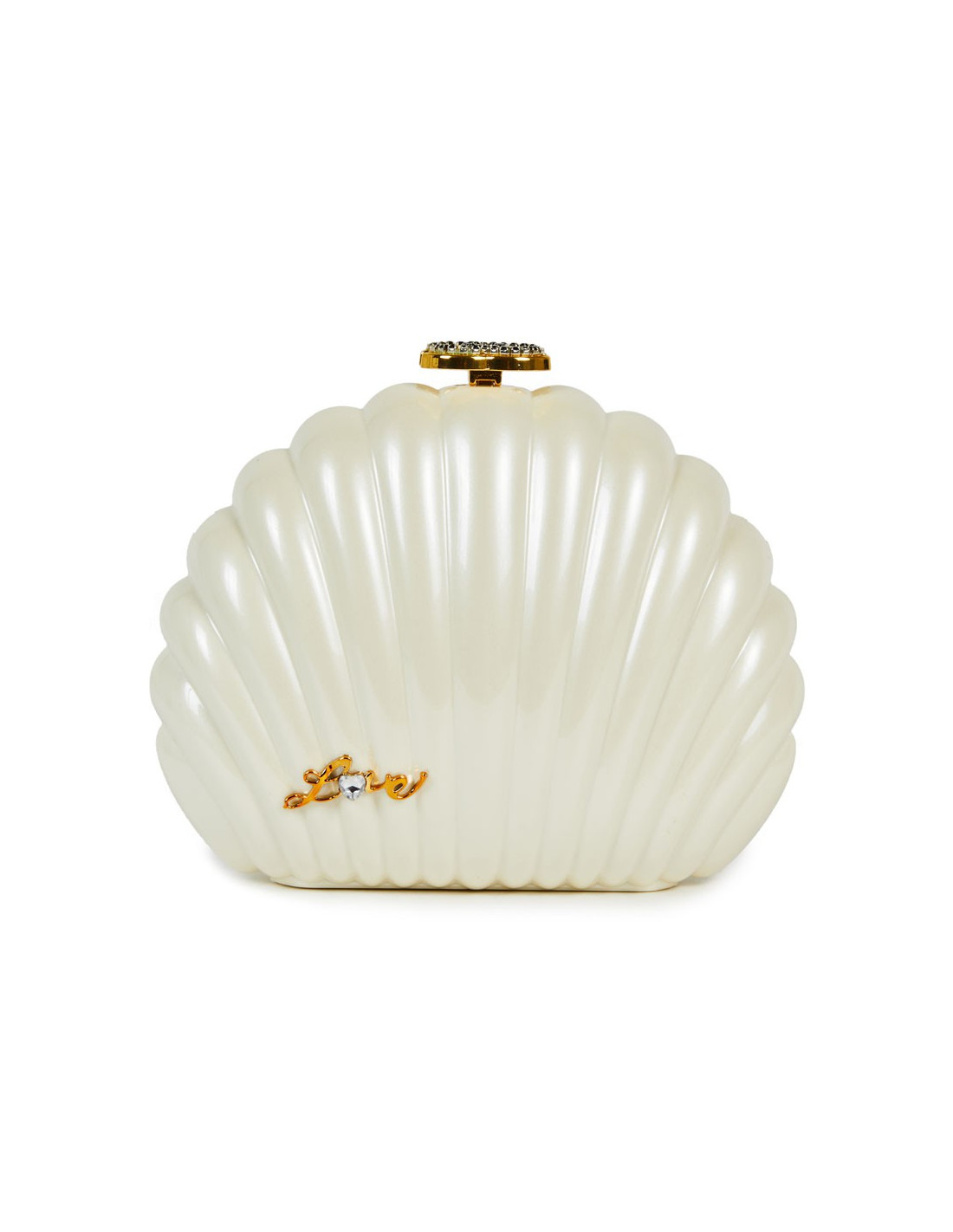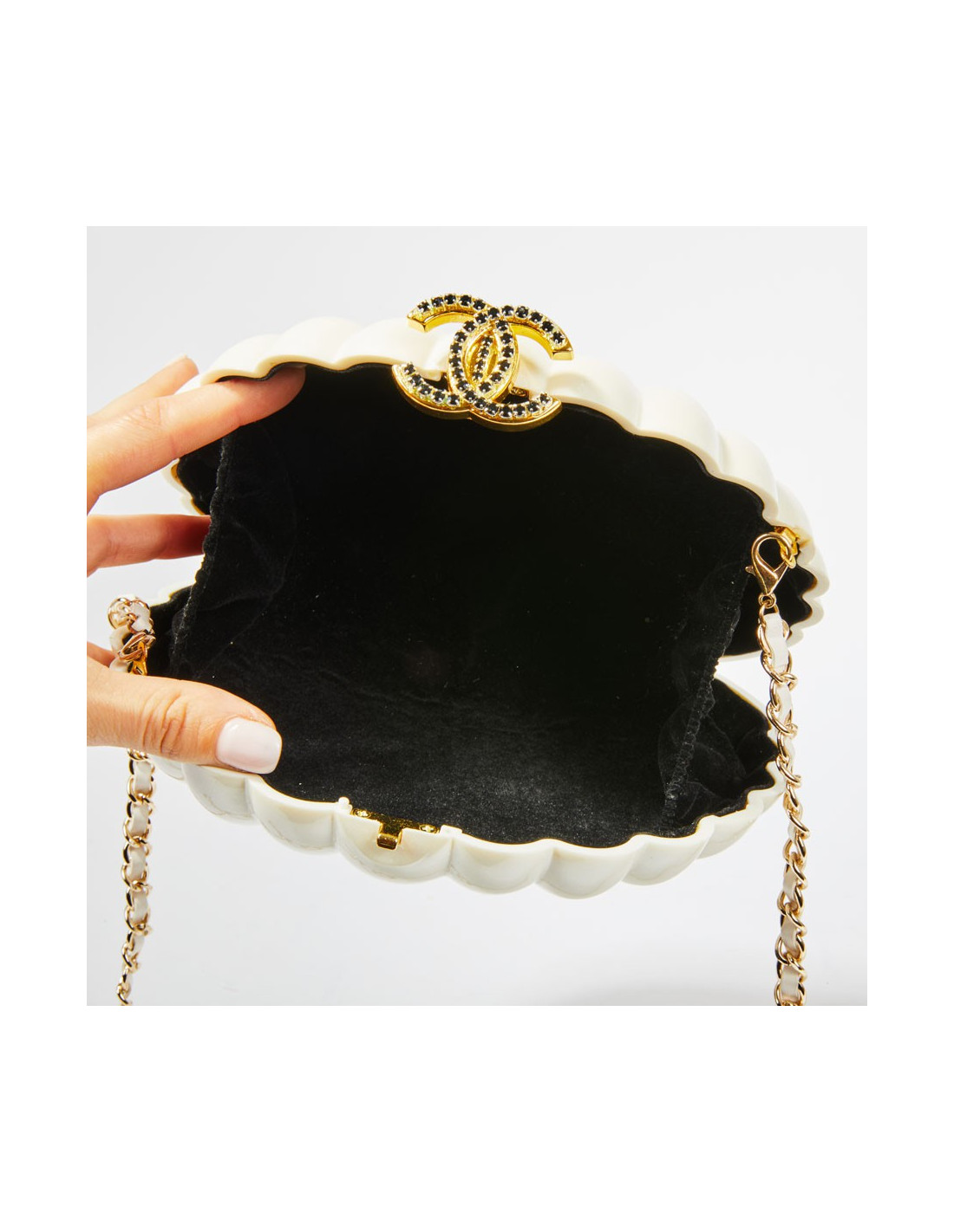 Ce joli petit sac d'occasion CHANEL était un cadeau fait aux VIP lors du show "CHANEL AIRLINES" en 2016. Il a la forme d'un coquillage qui est en plexiglas blanc cassé nacré. L'ouverture se fait sur le dessus du sac par le bijou "CC" (en cristal noir).C'est un fermoir à bascule. L'accastillage est or. Cette minaudière se porte à l'épaule, crossover ou à la main la bandoulière est amovible. L'intérieur est en velours noir. Sur la première face extérieure on voit deux petits brillants sur le bas gauche et de l'autre côté un "LOVE" en métal or avec un petit brillant Swarovski.