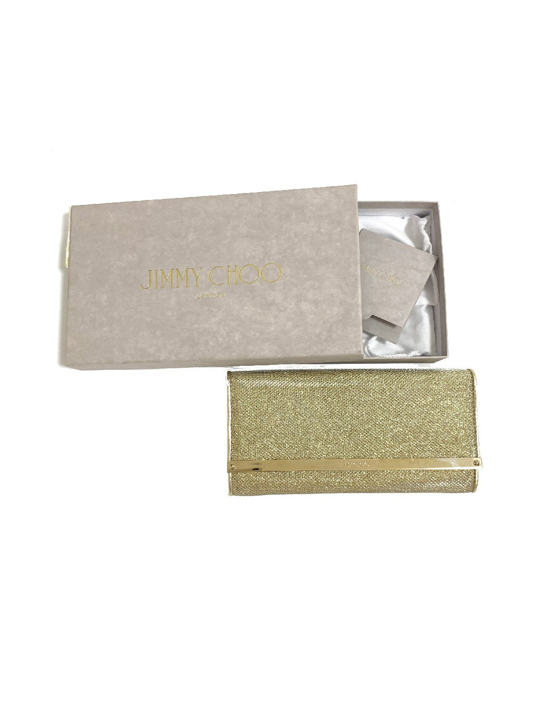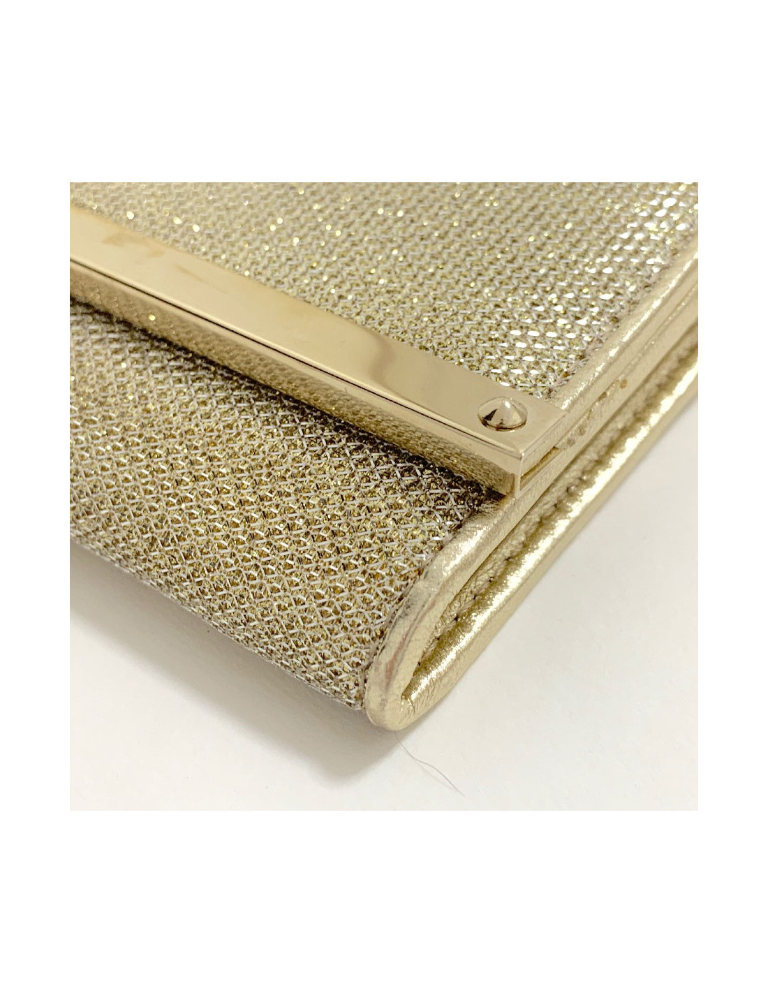 Très belle pochette de la maison Jimmy Choo, modèle Milla. Cette pochette est en lamé texturé doré scintillant. C'est une pochette avec rabat. L'intérieur est en cuir doré. Il comprend : 6 fentes à carte bleue, 1 pochette zippée.