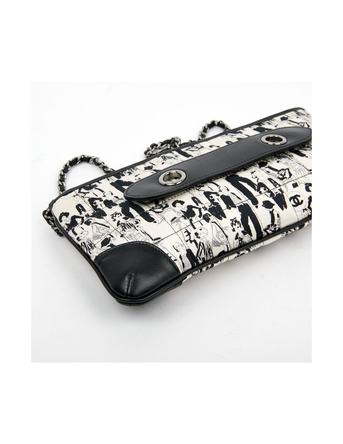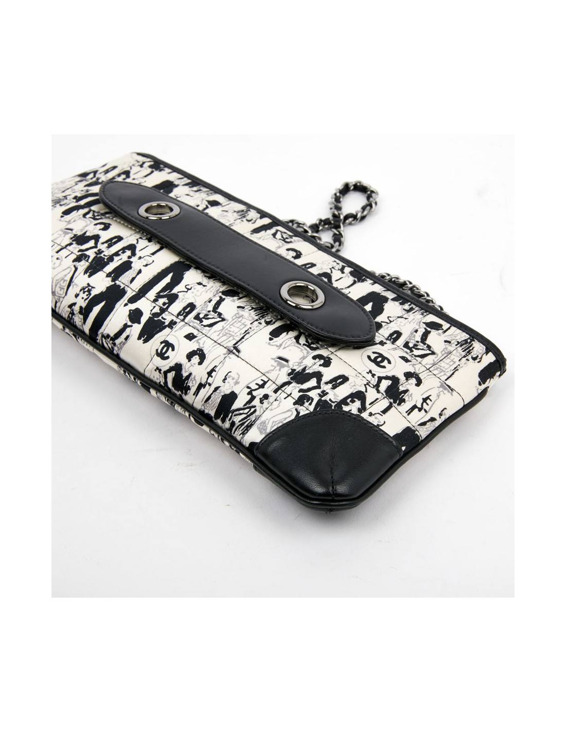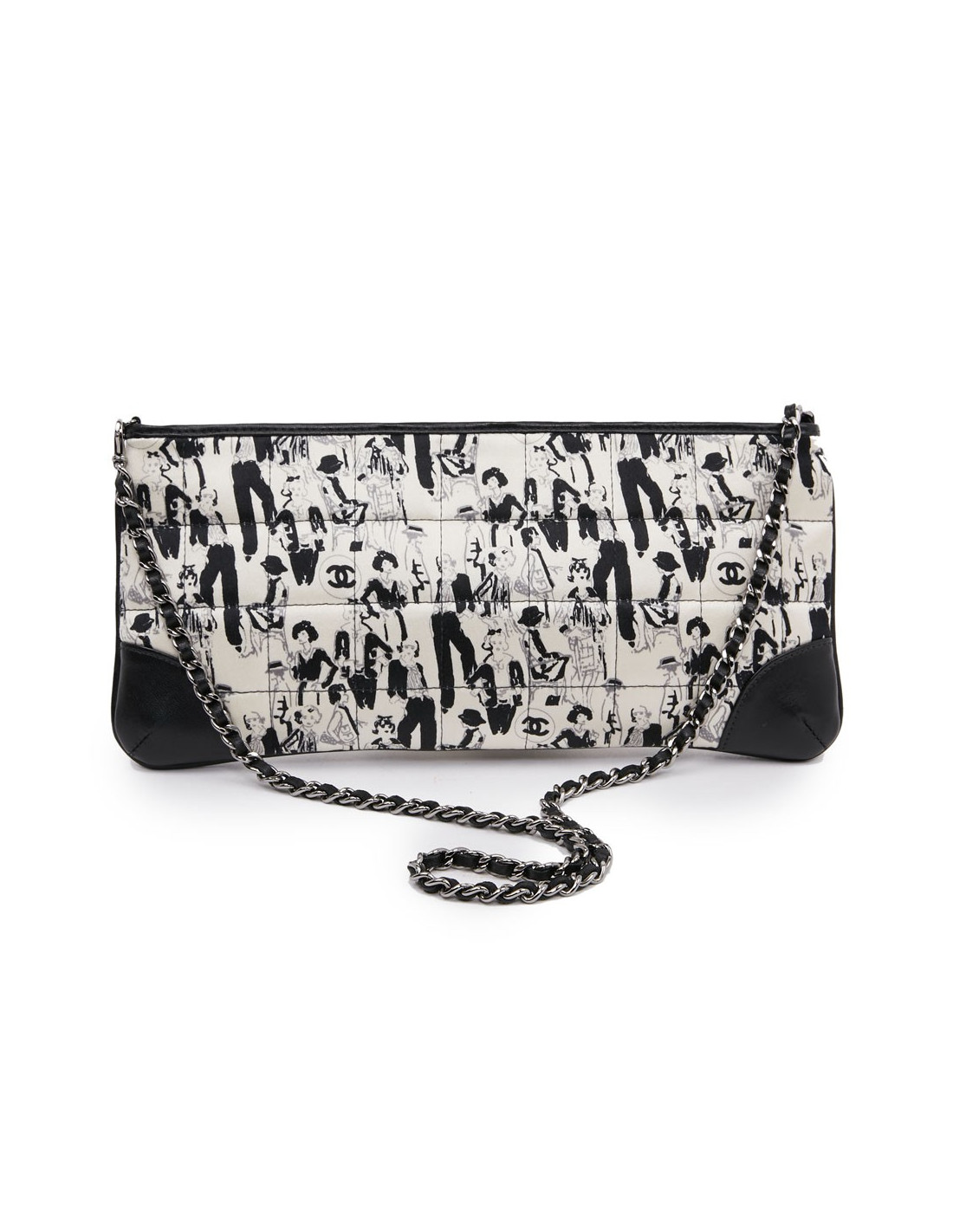 Cette pochette CHANEL est en soie noire et blanche. Elle est matelassée à décor de personnages (Coco Chanel ) et cuir noir sur les coins. La bijouterie est en argent palladié. Elle peut se porter à l'épaule ou main. La chaine est entrelacée de cuir noir. L'intérieur est en tissu monogramme CHANEL, une petite poche plate. Le petit carré en soie est identique à la pochette. Il peut être ajouté au sac ou porté autour du cou. Le sac est en très bon état, une petite tache sur le foulard.