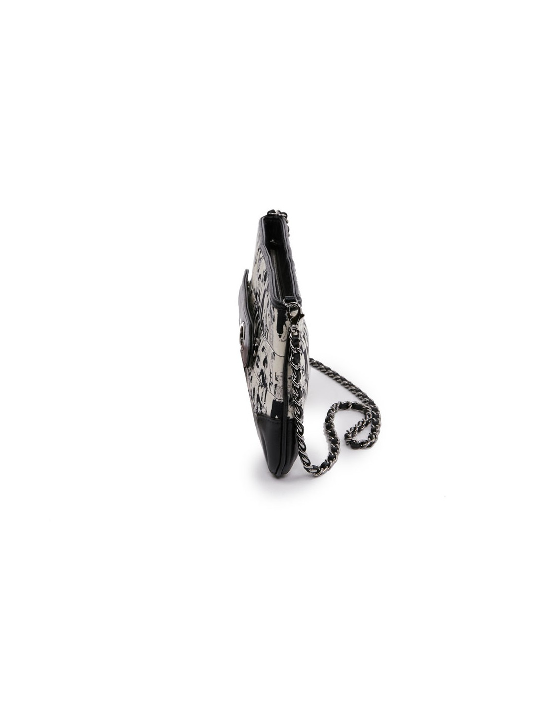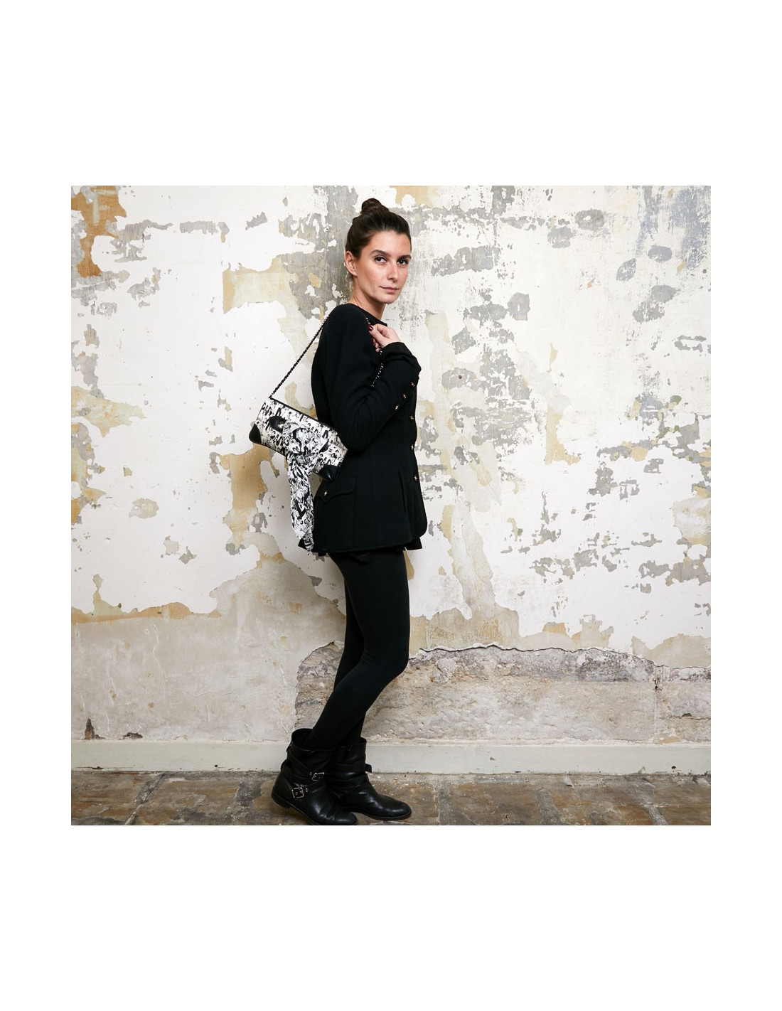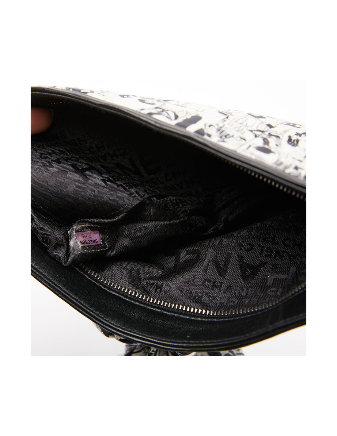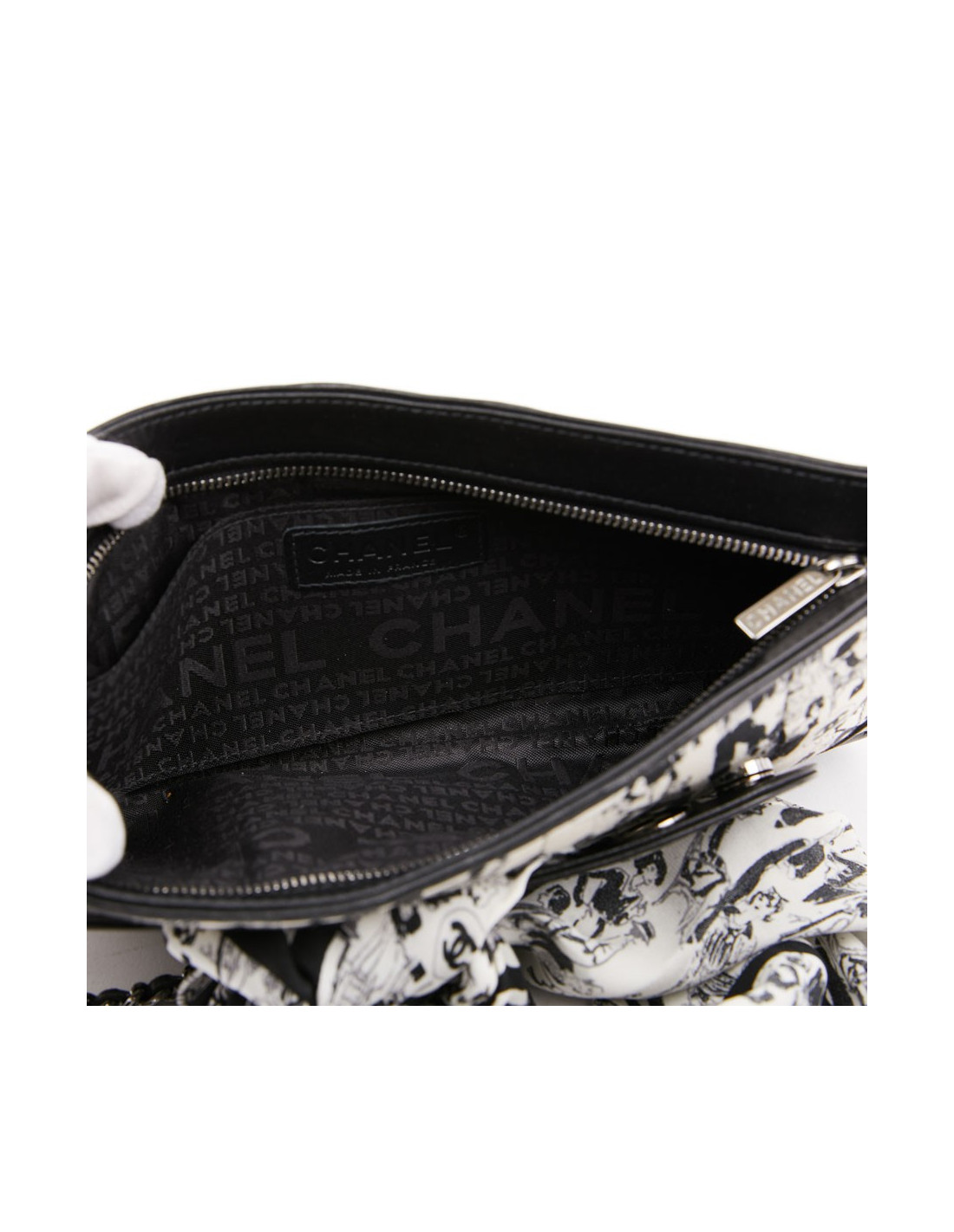 Cette pochette CHANEL est en soie noire et blanche. Elle est matelassée à décor de personnages (Coco Chanel ) et cuir noir sur les coins. La bijouterie est en argent palladié. Elle peut se porter à l'épaule ou main. La chaine est entrelacée de cuir noir. L'intérieur est en tissu monogramme CHANEL, une petite poche plate. Le petit carré en soie est identique à la pochette. Il peut être ajouté au sac ou porté autour du cou. Le sac est en très bon état, une petite tache sur le foulard.