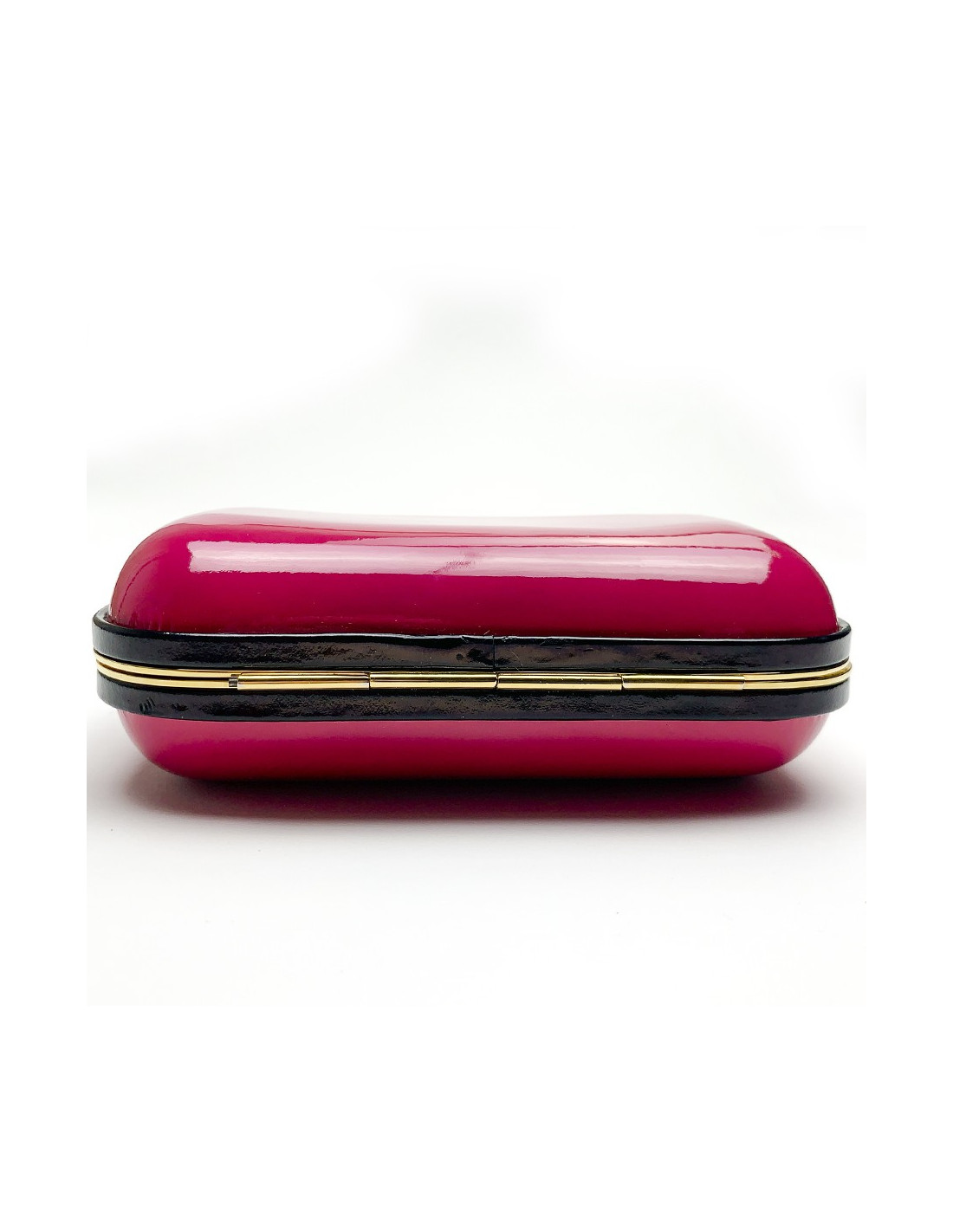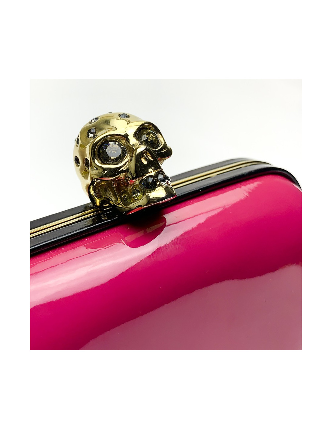 Cette minaudière est signée de la Maison Alexander McQueen. Elle est d'un rose vif et elle est surmontée sur le fermoir d'une vanité, une représentation allégorique de la mort, dont Alexander McQueen, de son vrai nom Lee Alexander Mc Queen faisait allusion dans ses collections. Ses représentations étaient parfois très macabres. Il lui arrivait de malmener ses mannequins en les jetant sur des animaux empaillés ou bien ses créations étaient tâchées de (faux) sang. C'était un génie avant gardiste de la mode, ayant fait ses études dans la prestigieuse école Saint Martin's school of art. On l'appelait le Bad boy de la couture.