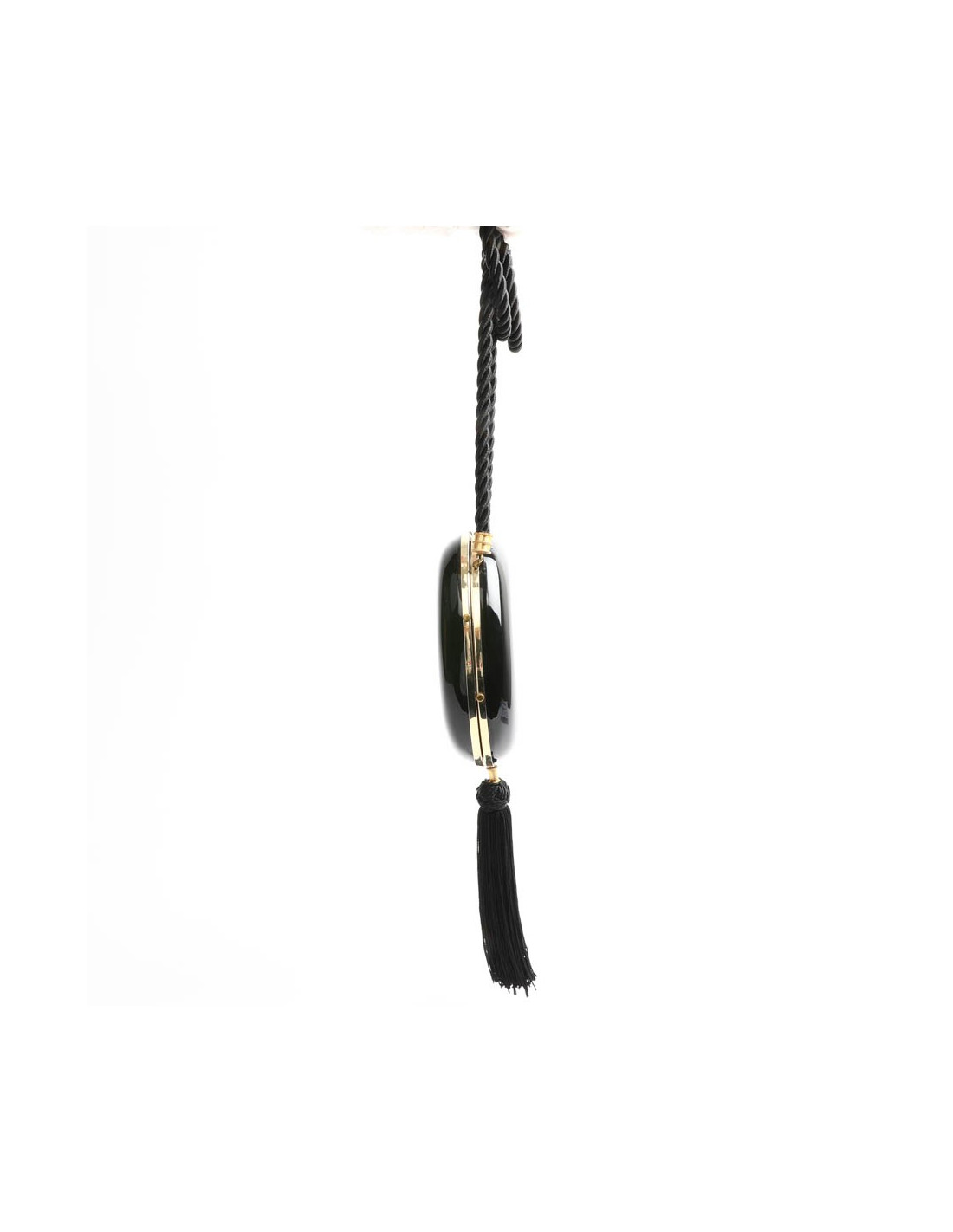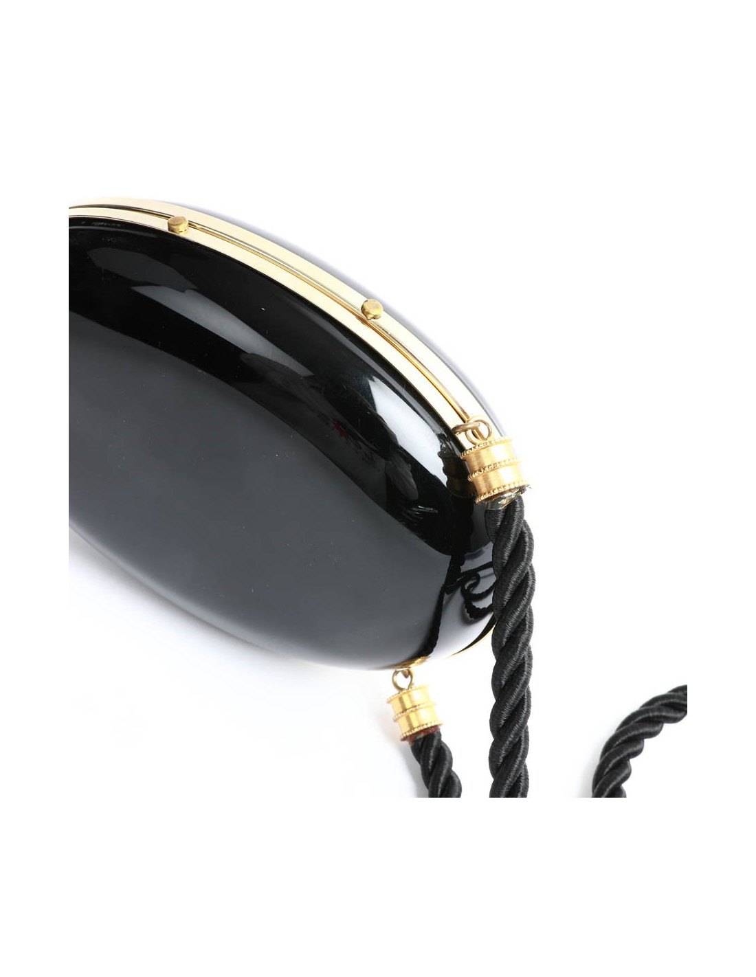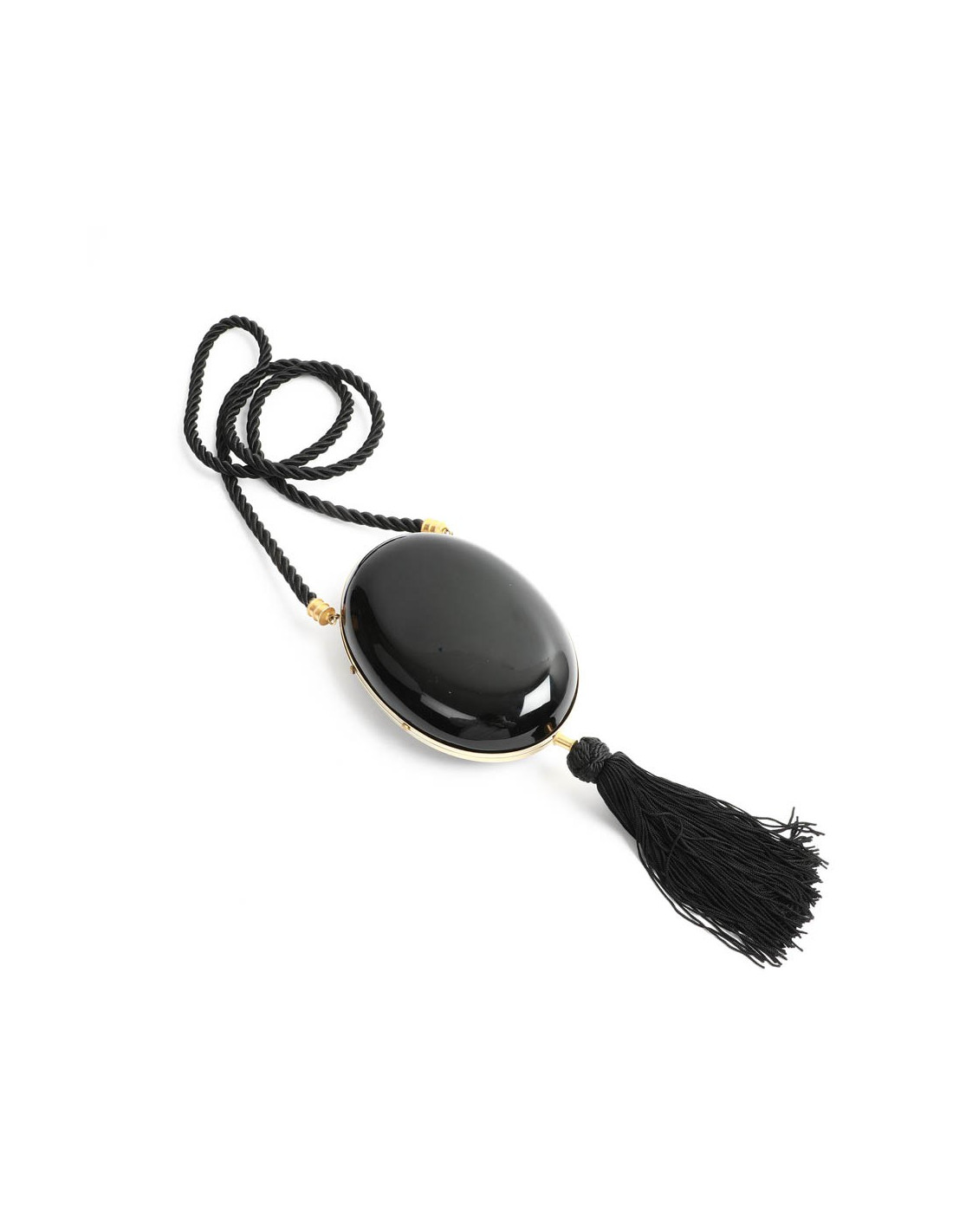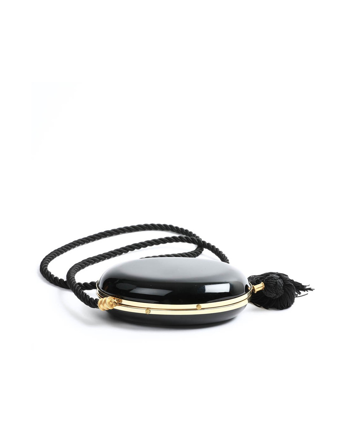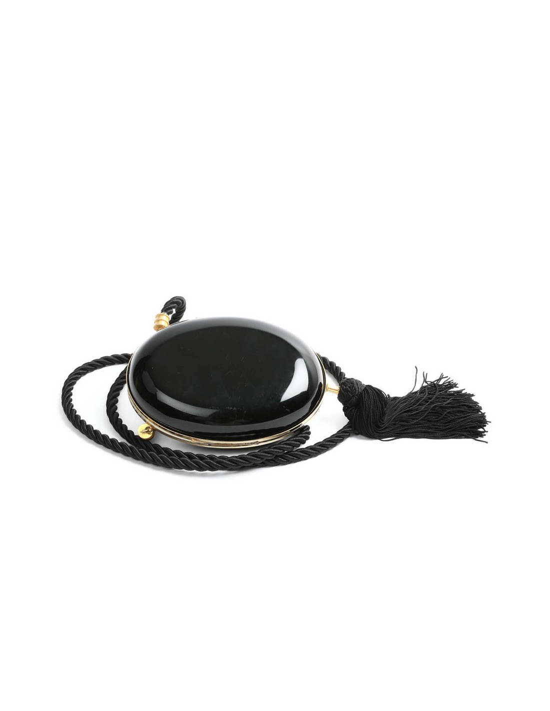 Ravissante minaudière en plexi noir se terminant par un pompon, typique des articles vintage YSL. Elle se porte à l'épaule ou croisée. En très bon état. La bijouterie est dorée.
