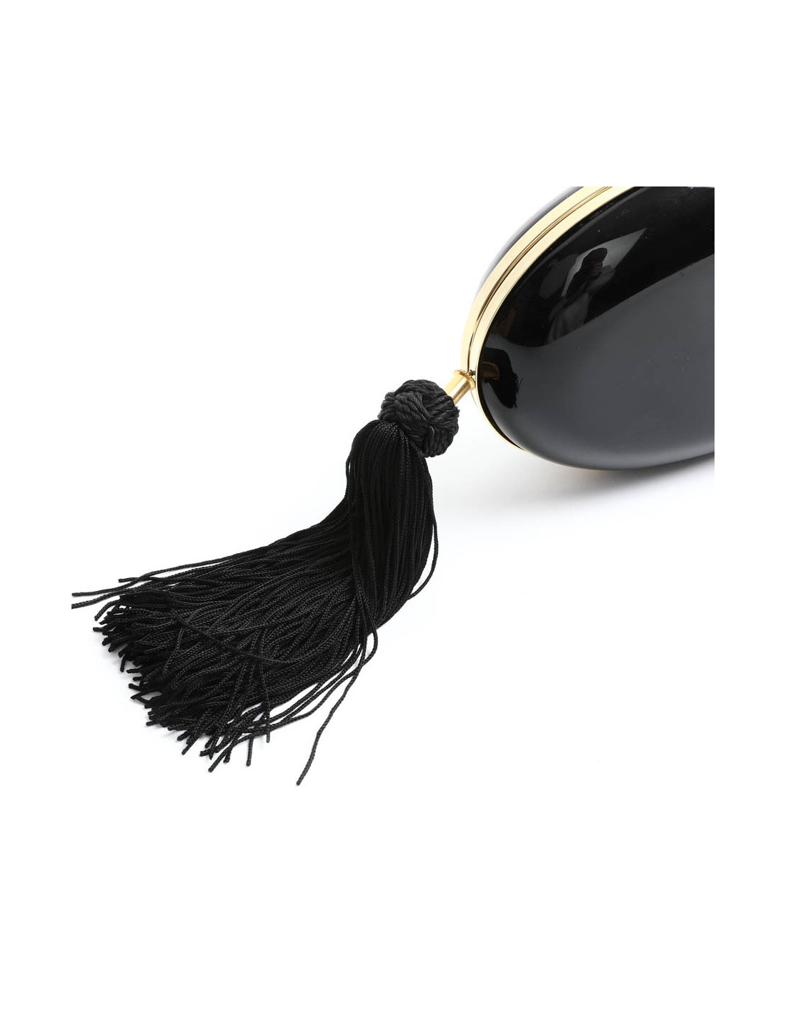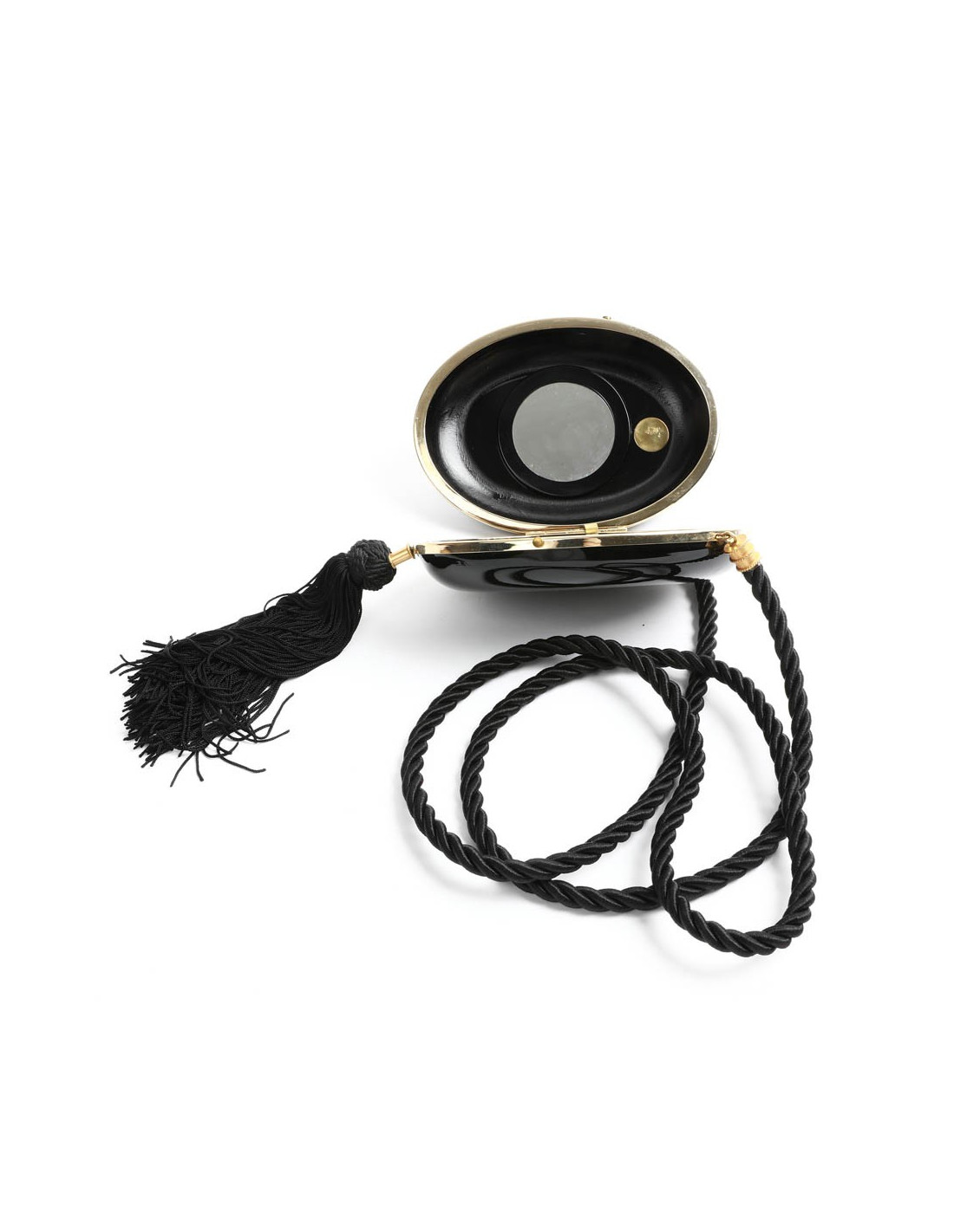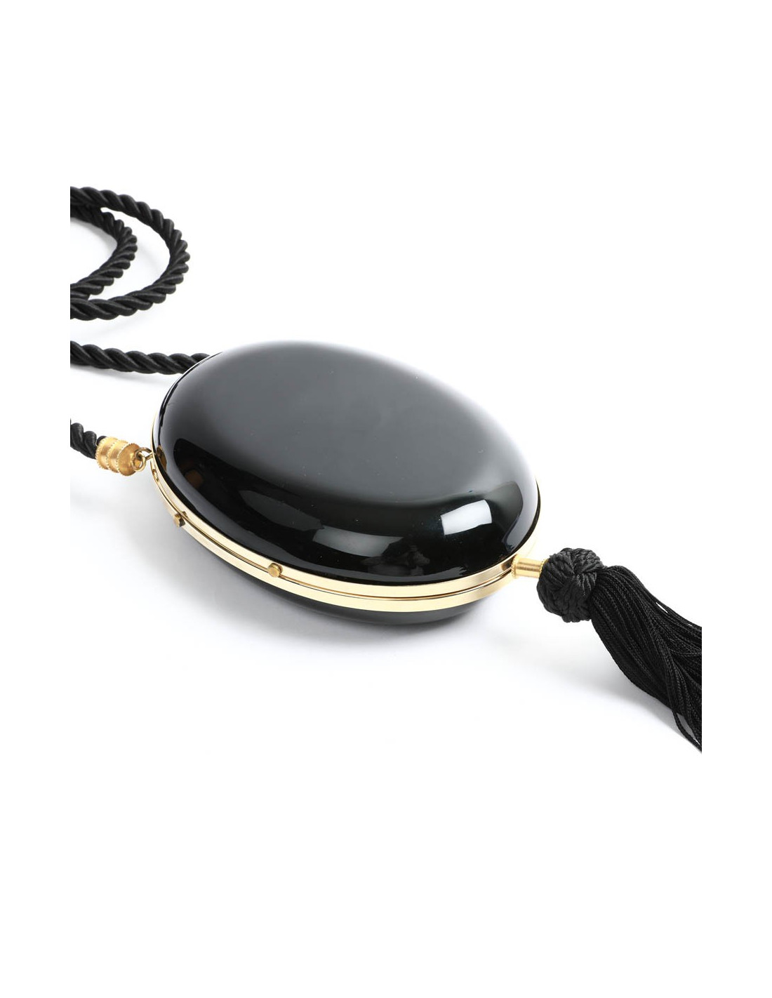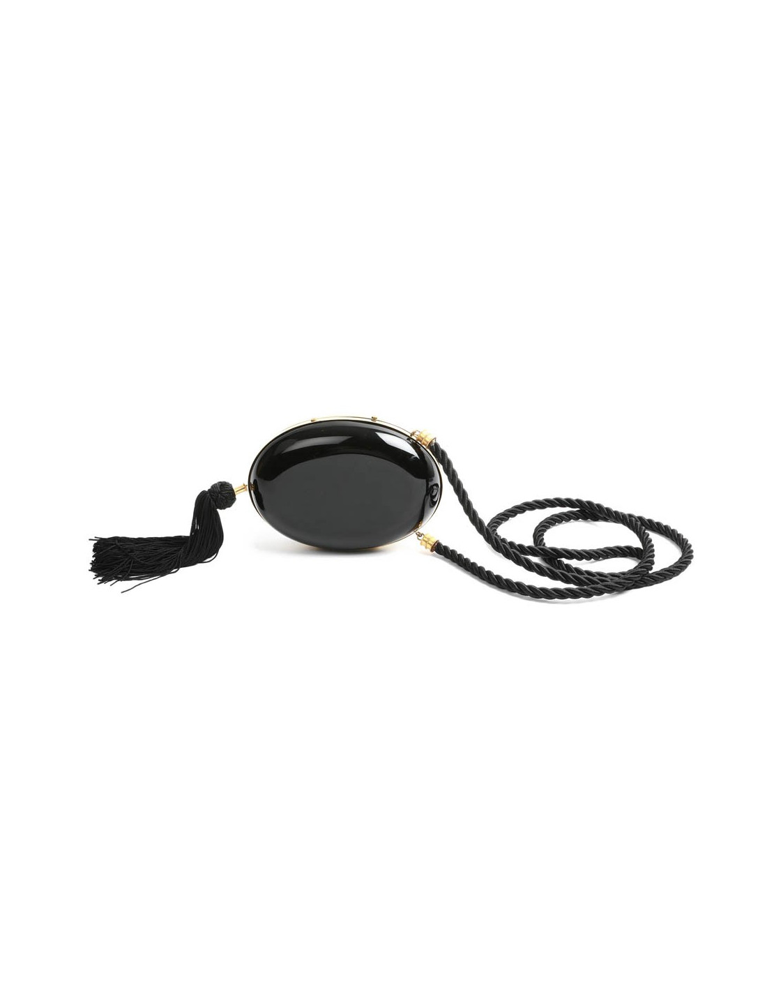 Ravissante minaudière en plexi noir se terminant par un pompon, typique des articles vintage YSL. Elle se porte à l'épaule ou croisée. En très bon état. La bijouterie est dorée.