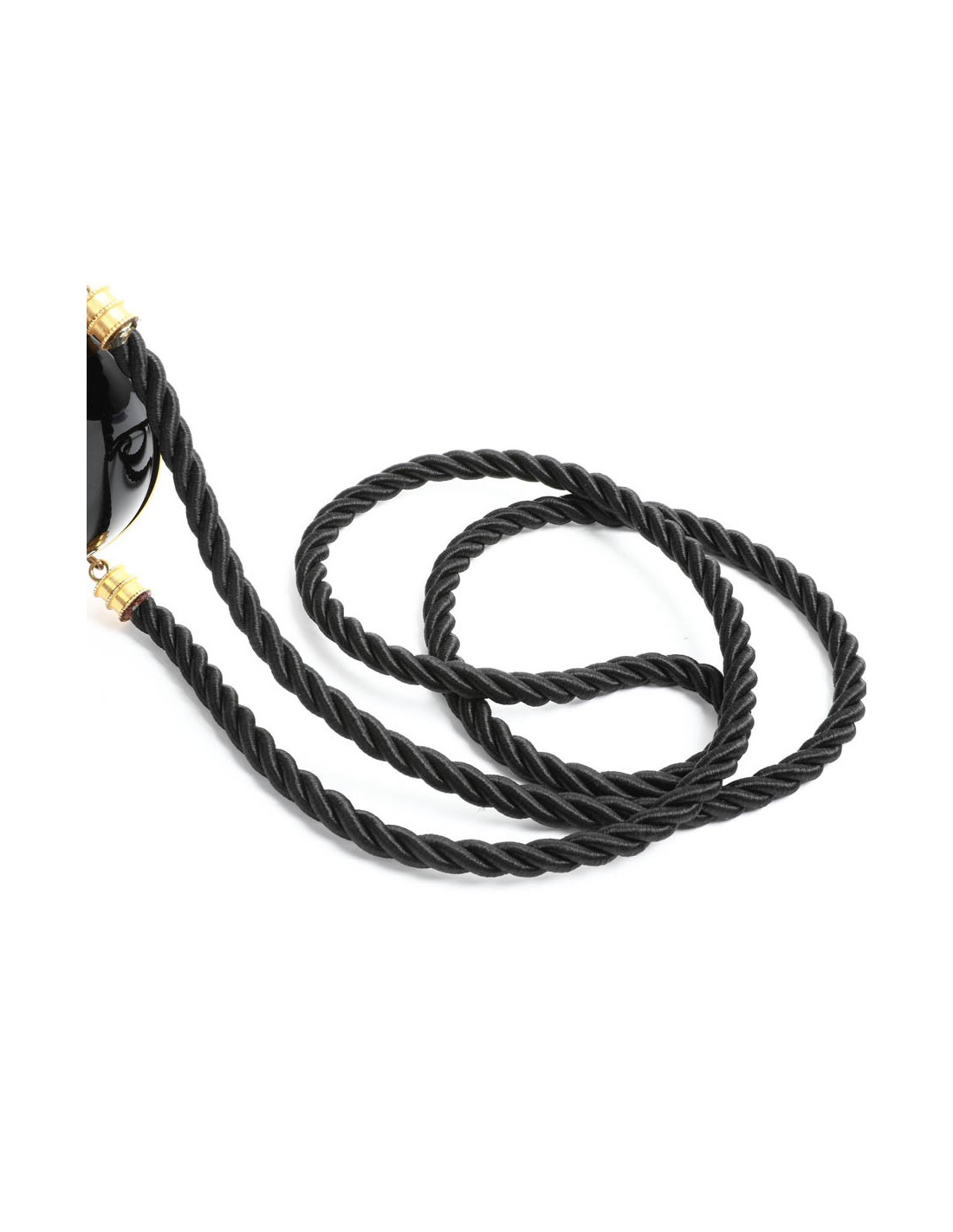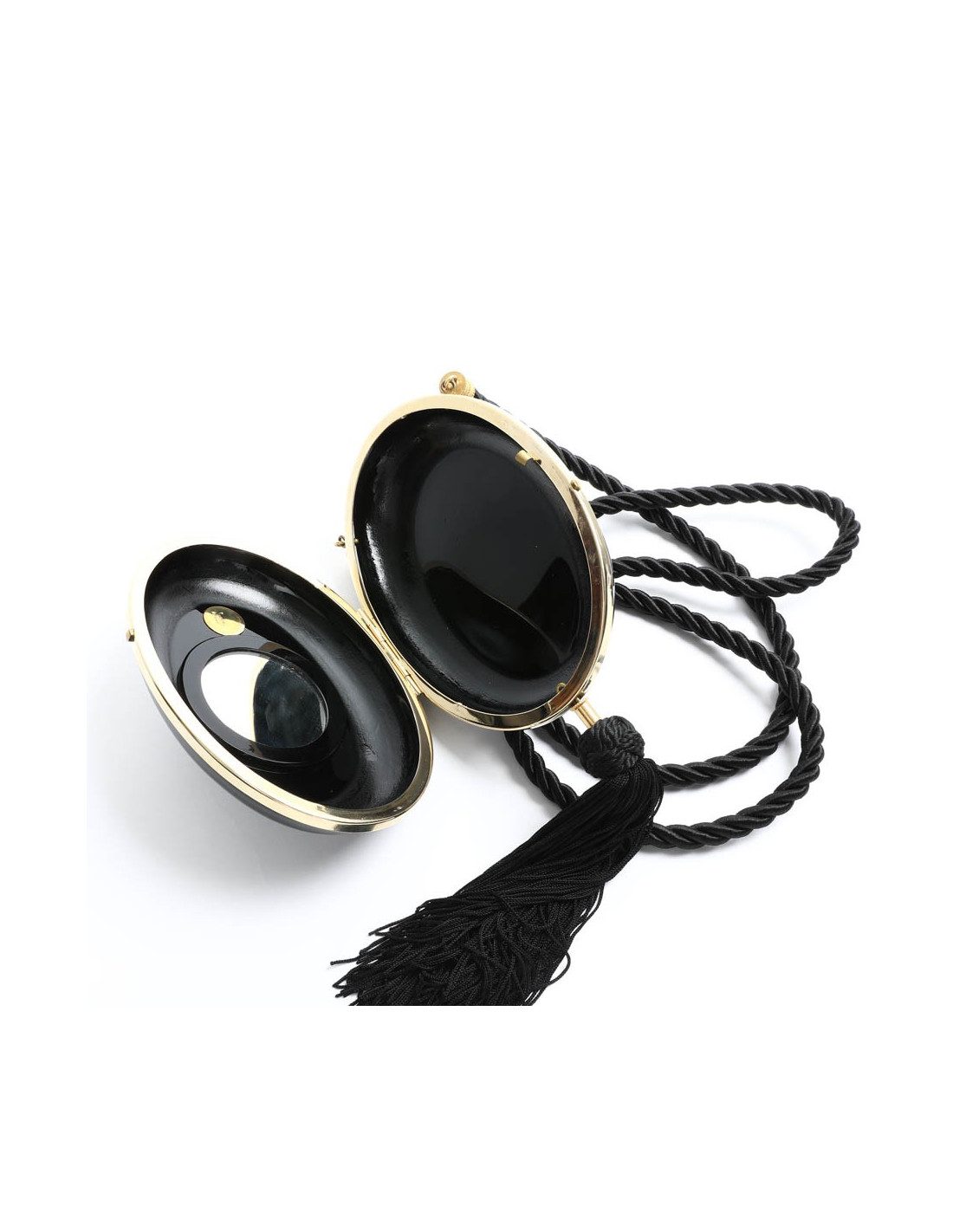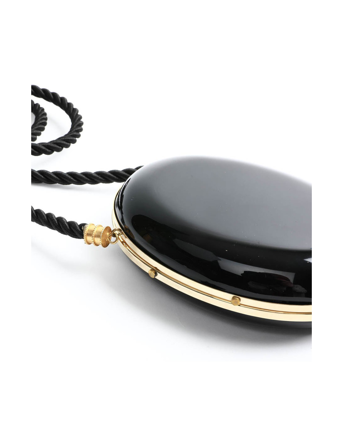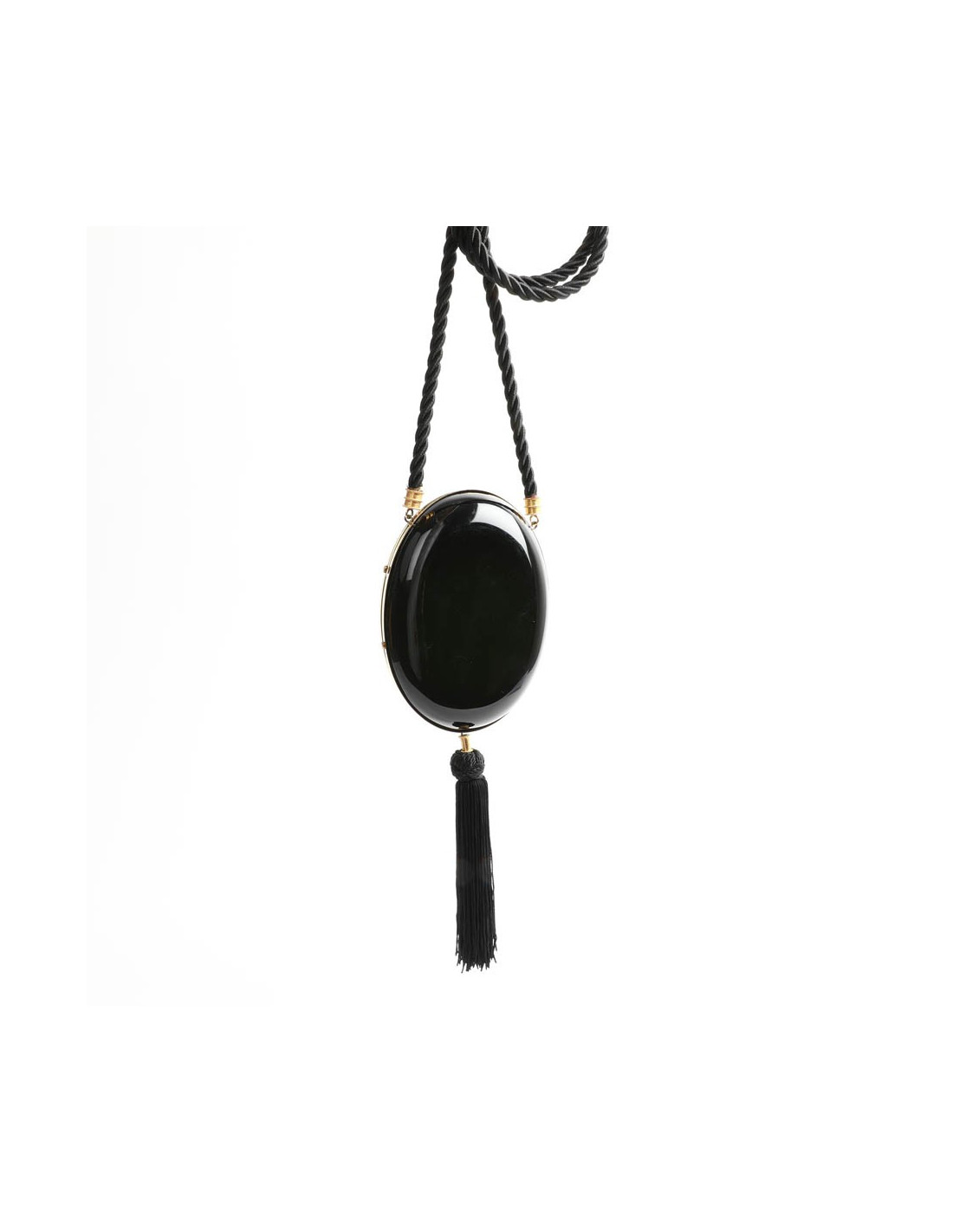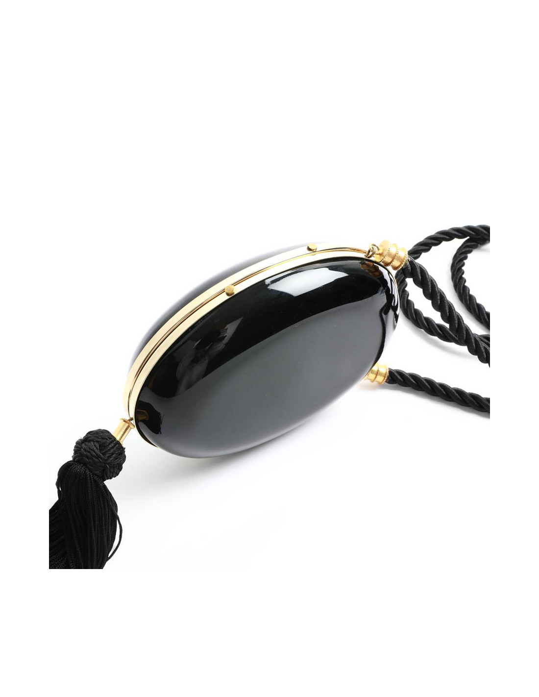 Ravissante minaudière en plexi noir se terminant par un pompon, typique des articles vintage YSL. Elle se porte à l'épaule ou croisée. En très bon état. La bijouterie est dorée.