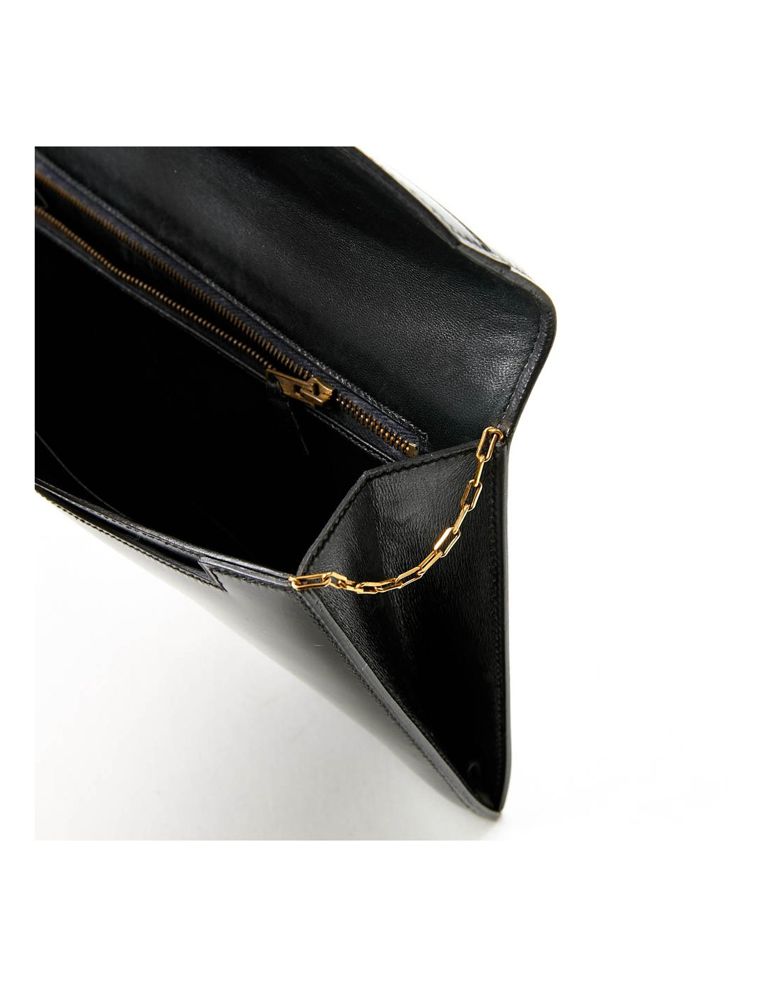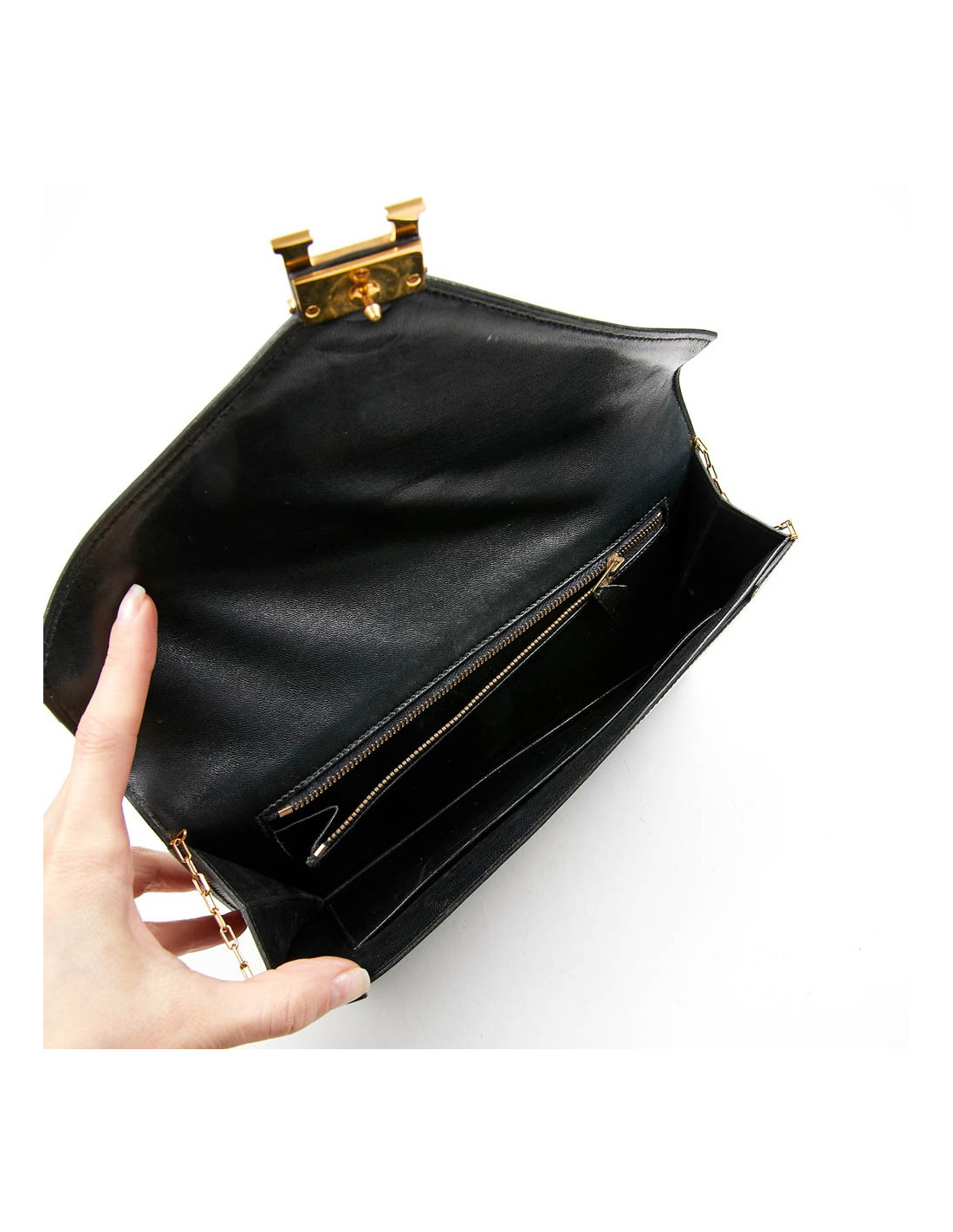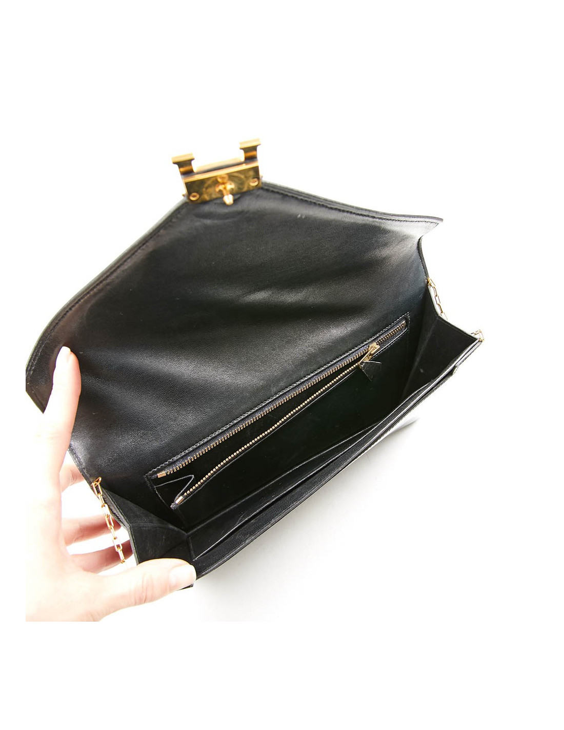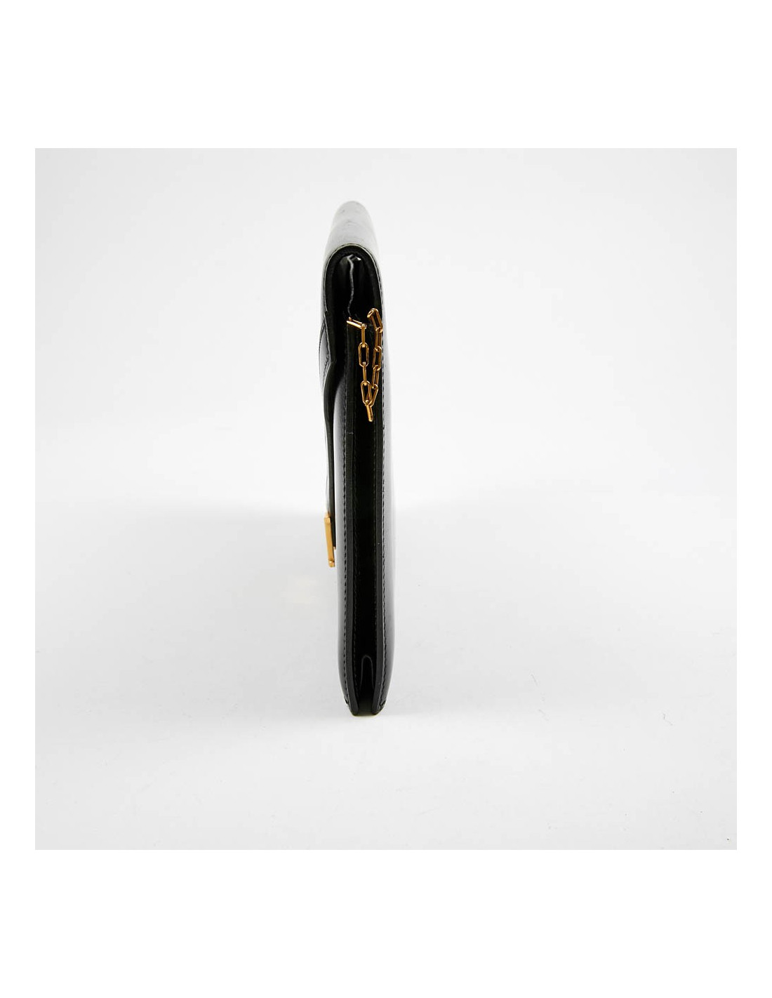 Sac pochette Modèle "Lydie" Vintage Hermès en cuir de veau box lisse noir. La bijouterie est plaqué or. Il a un fermoir par bouton pression.