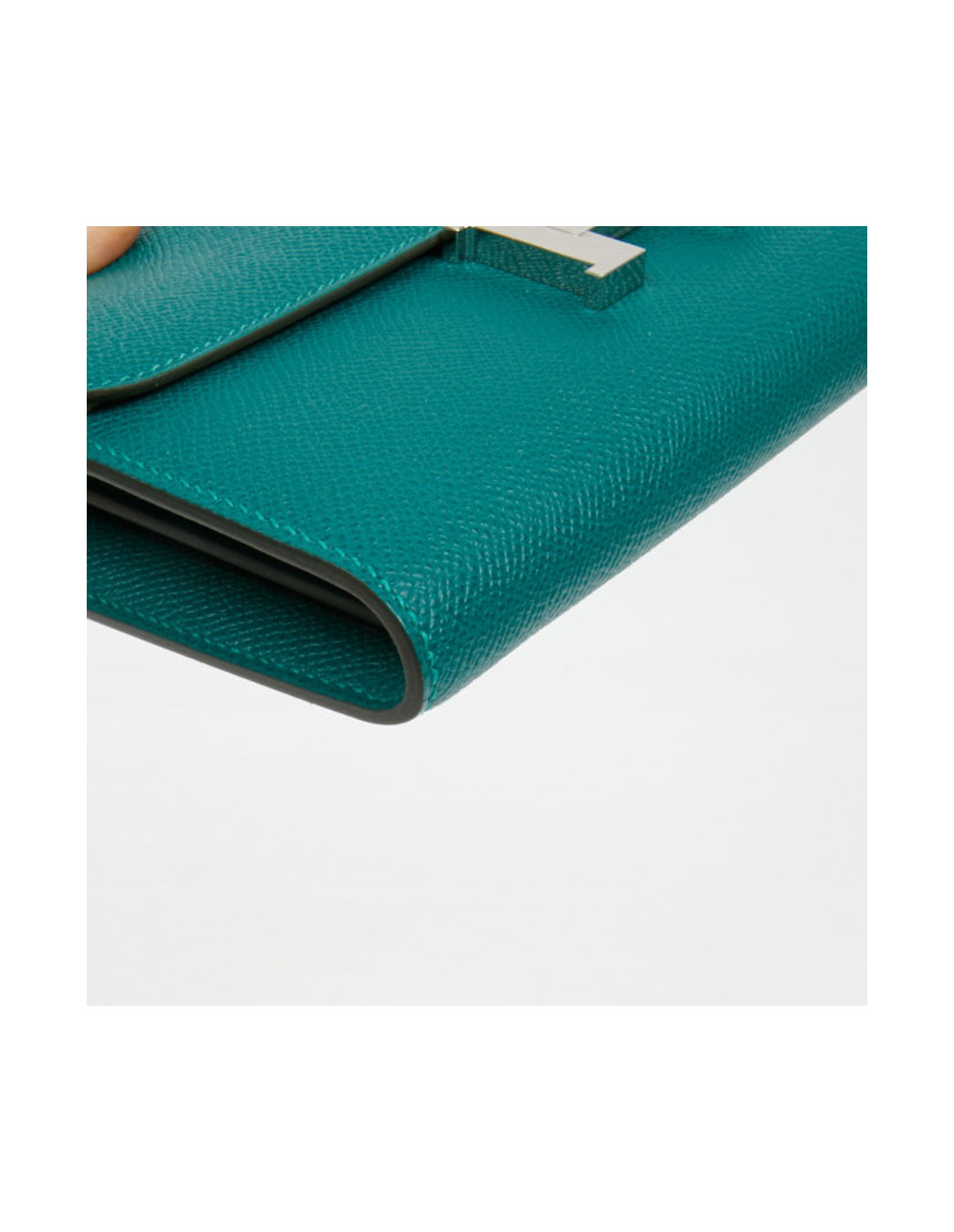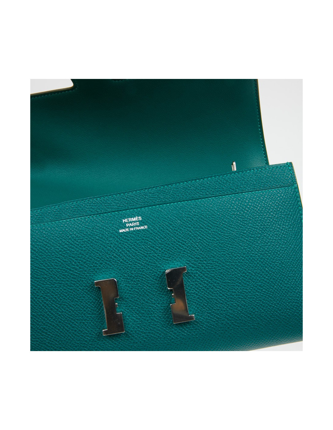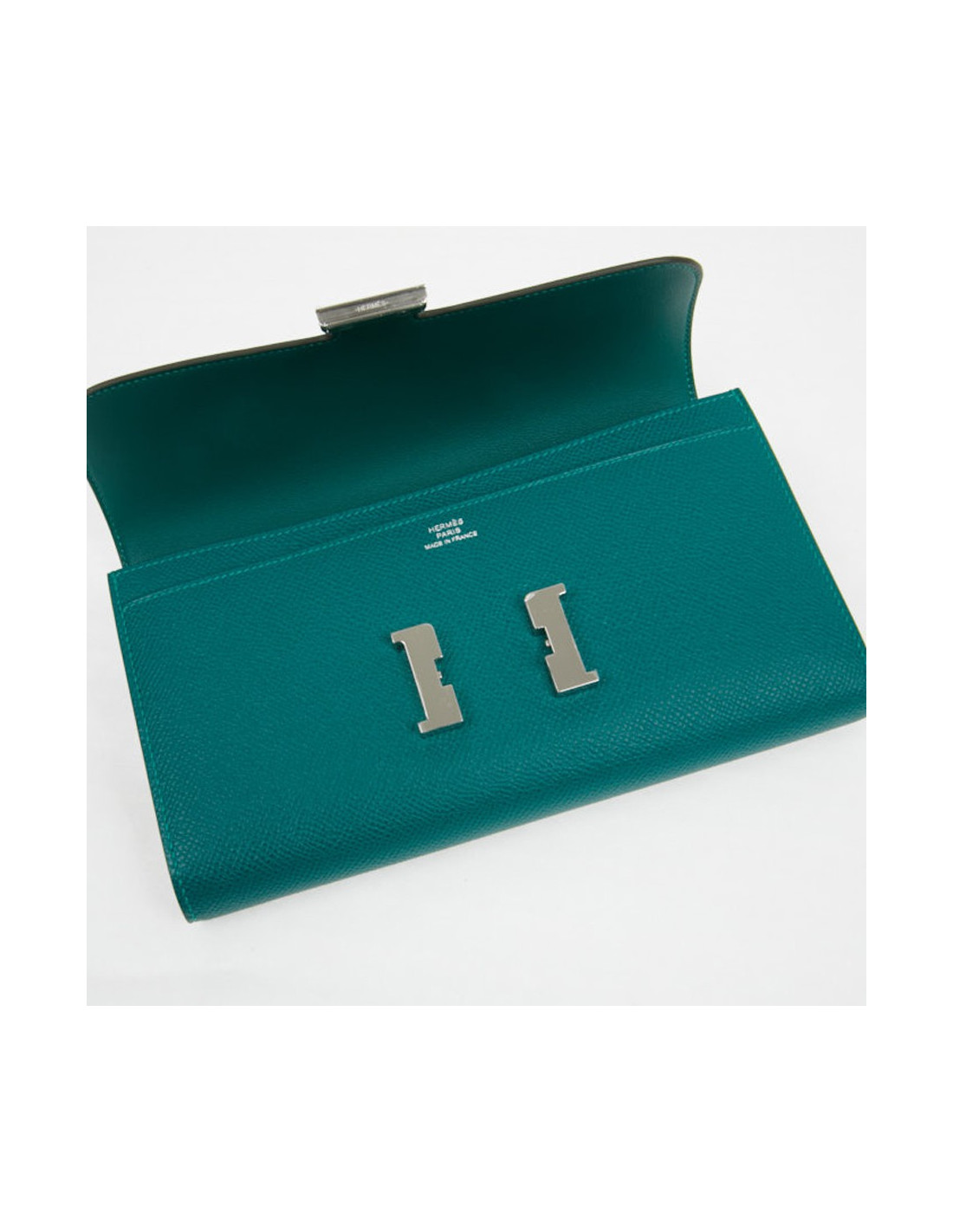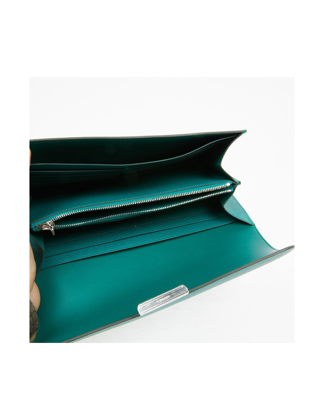 Ce magnifique portefeuille Constance de la Maison Hermès est en cuir de veau Epsom couleur Malachite. Fermoir H de la collection Constance en métal argent palladié. A l'intérieur un porte monnaie central avec fermeture à glissière entouré de deux grands espaces de rangement avec des poches pour cartes de crédit.