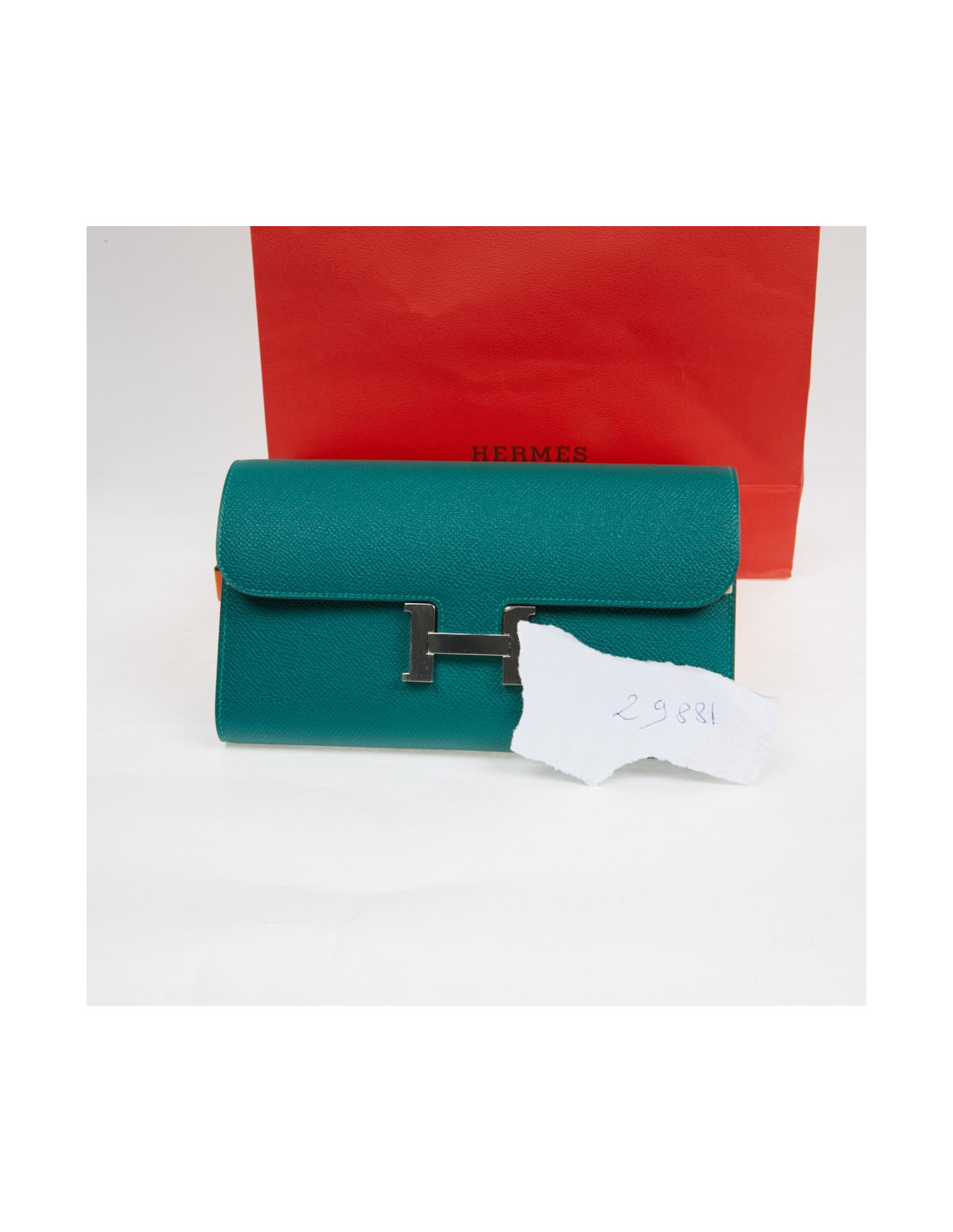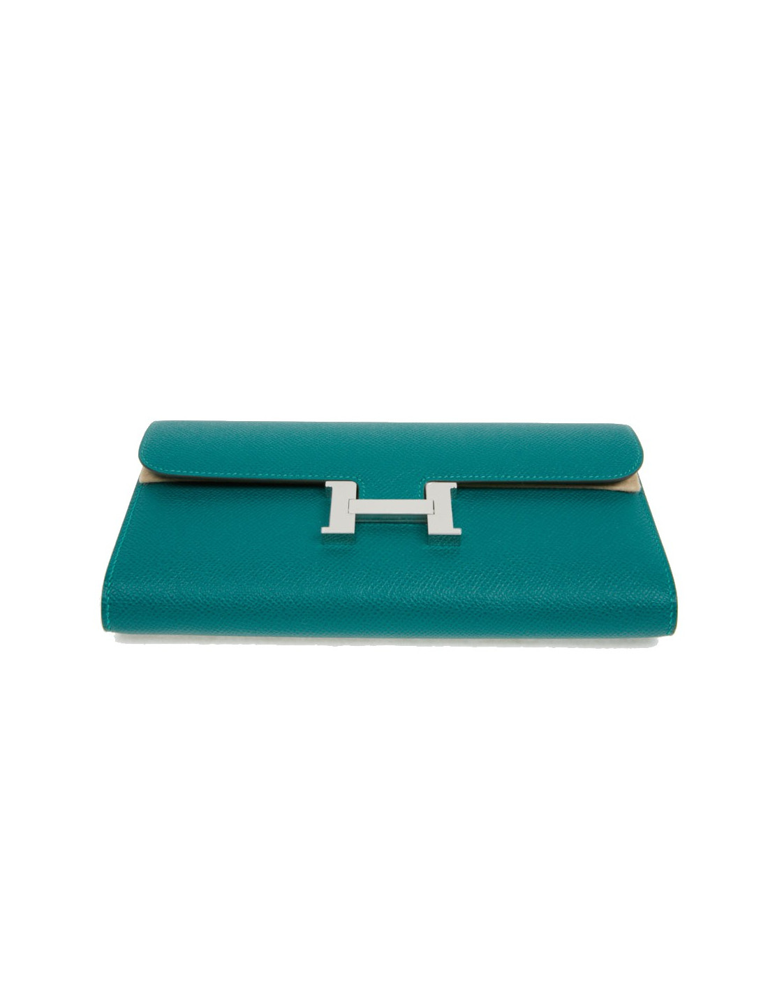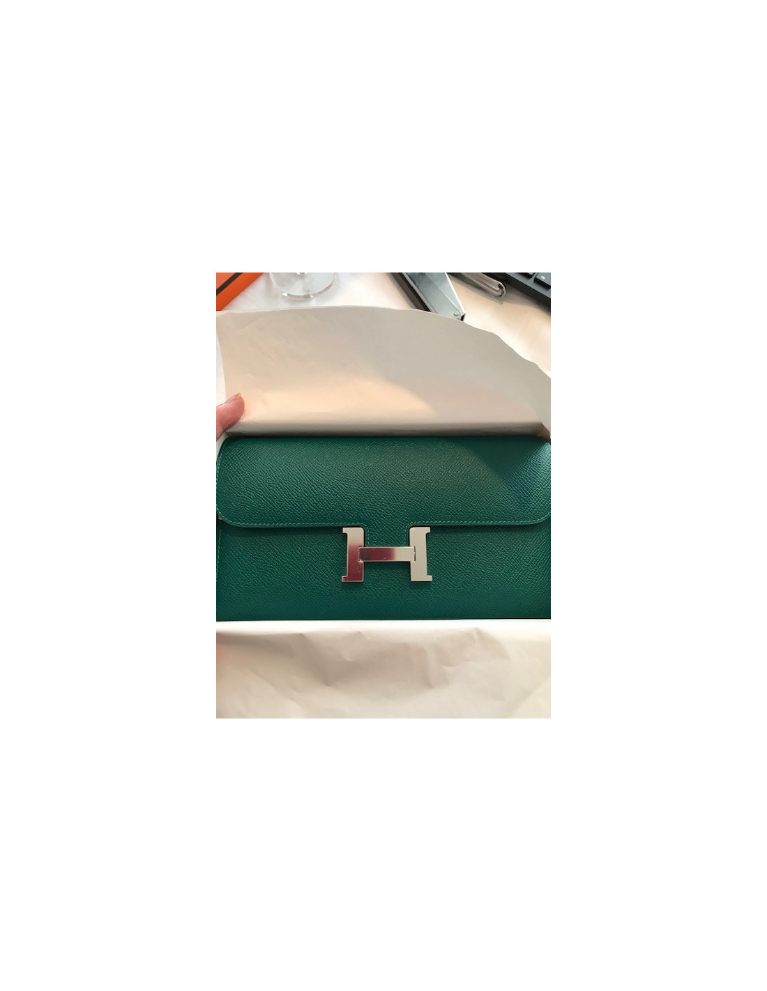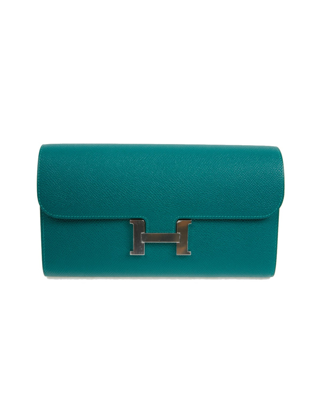 Ce magnifique portefeuille Constance de la Maison Hermès est en cuir de veau Epsom couleur Malachite. Fermoir H de la collection Constance en métal argent palladié. A l'intérieur un porte monnaie central avec fermeture à glissière entouré de deux grands espaces de rangement avec des poches pour cartes de crédit.