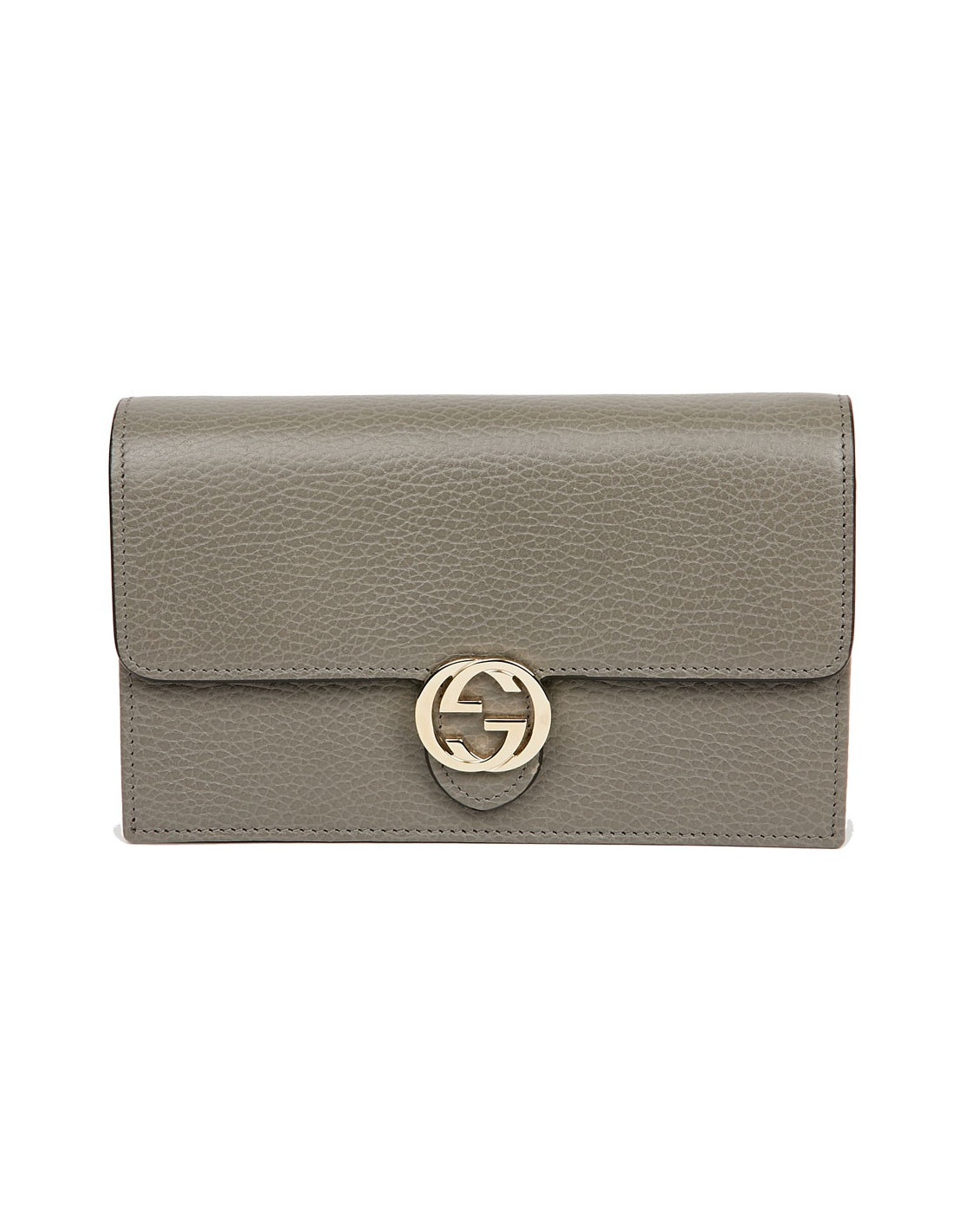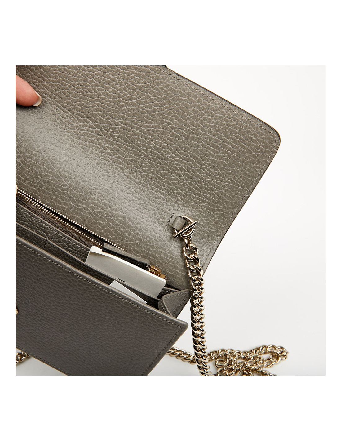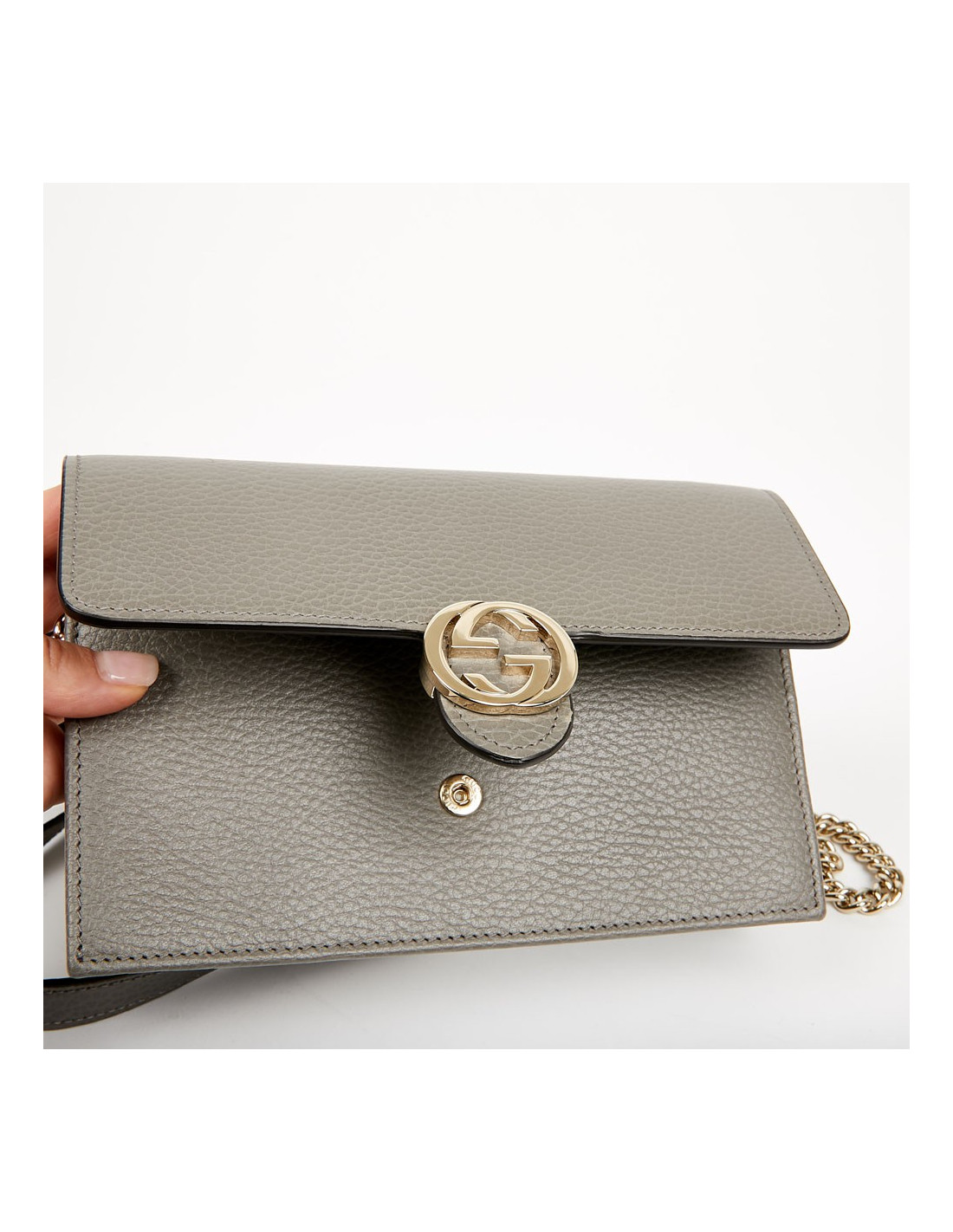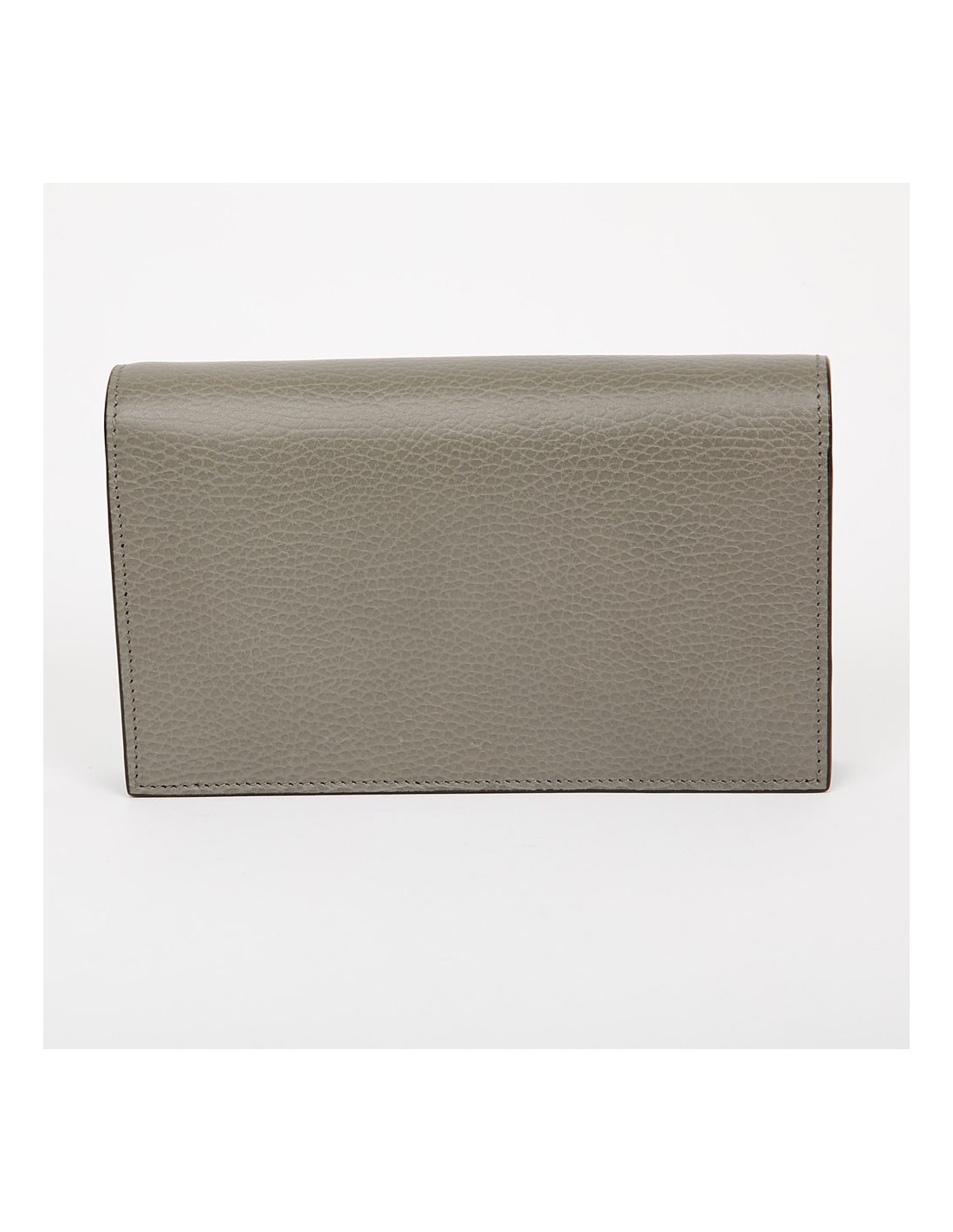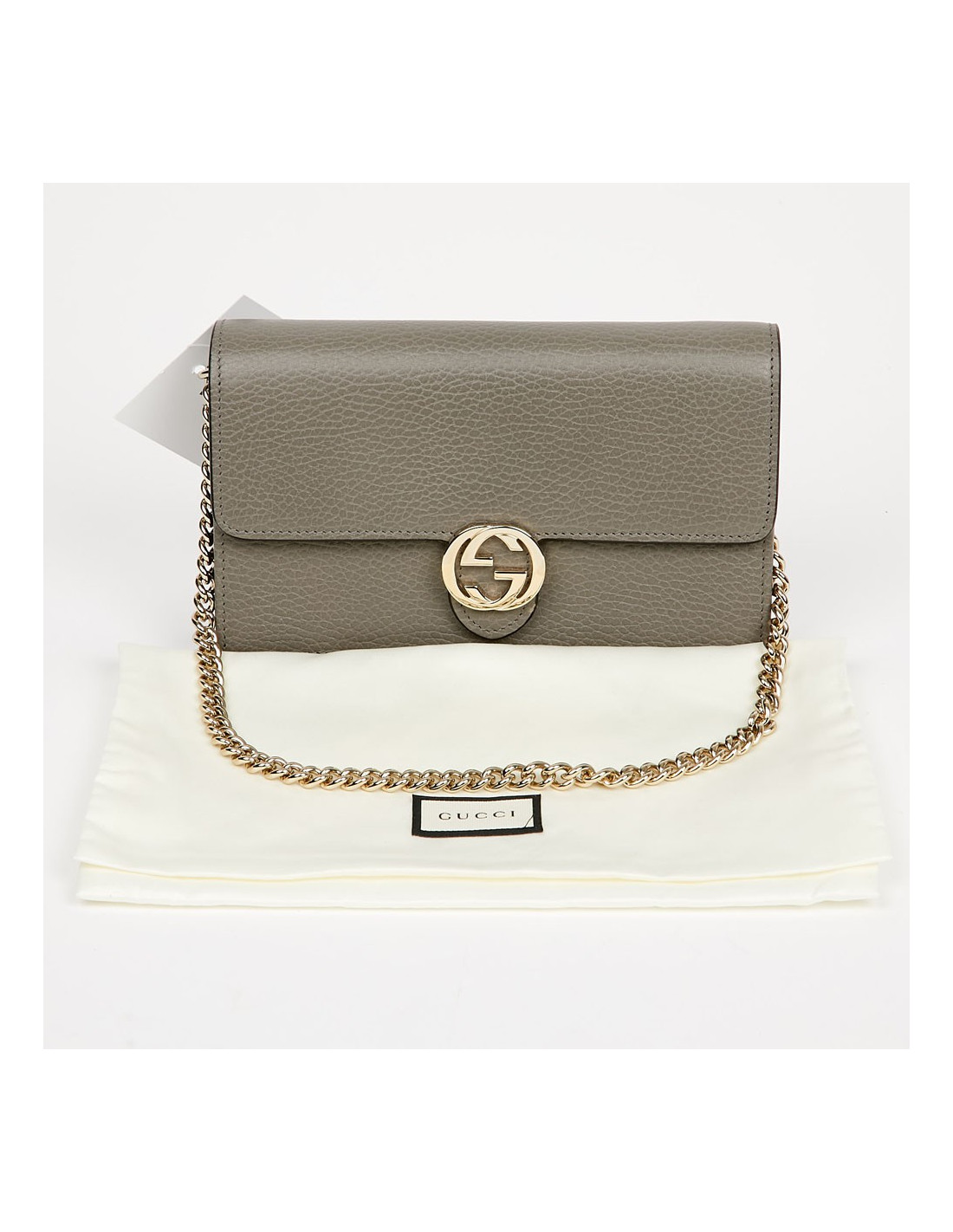 On adore ce petit Wallet on chain de la Maison Gucci, issu de la collection Interlocking. Il est en cuir grainé gris poussière. La bijouterie est en métal doré avec une fermeture par un bouton pression (logo à l'emblème de la marque "GG"). Il est doublé de cuir et de tissu gris. A l'intérieur une poche zippée vous permettra de garder vos papiers en toute sécurité et de chaque côté des fentes pour cartes. La bandoulière n'est pas ajustable mais elle est amovible. Il se porte cross body ou main. Il n'a jamais été utilisé.