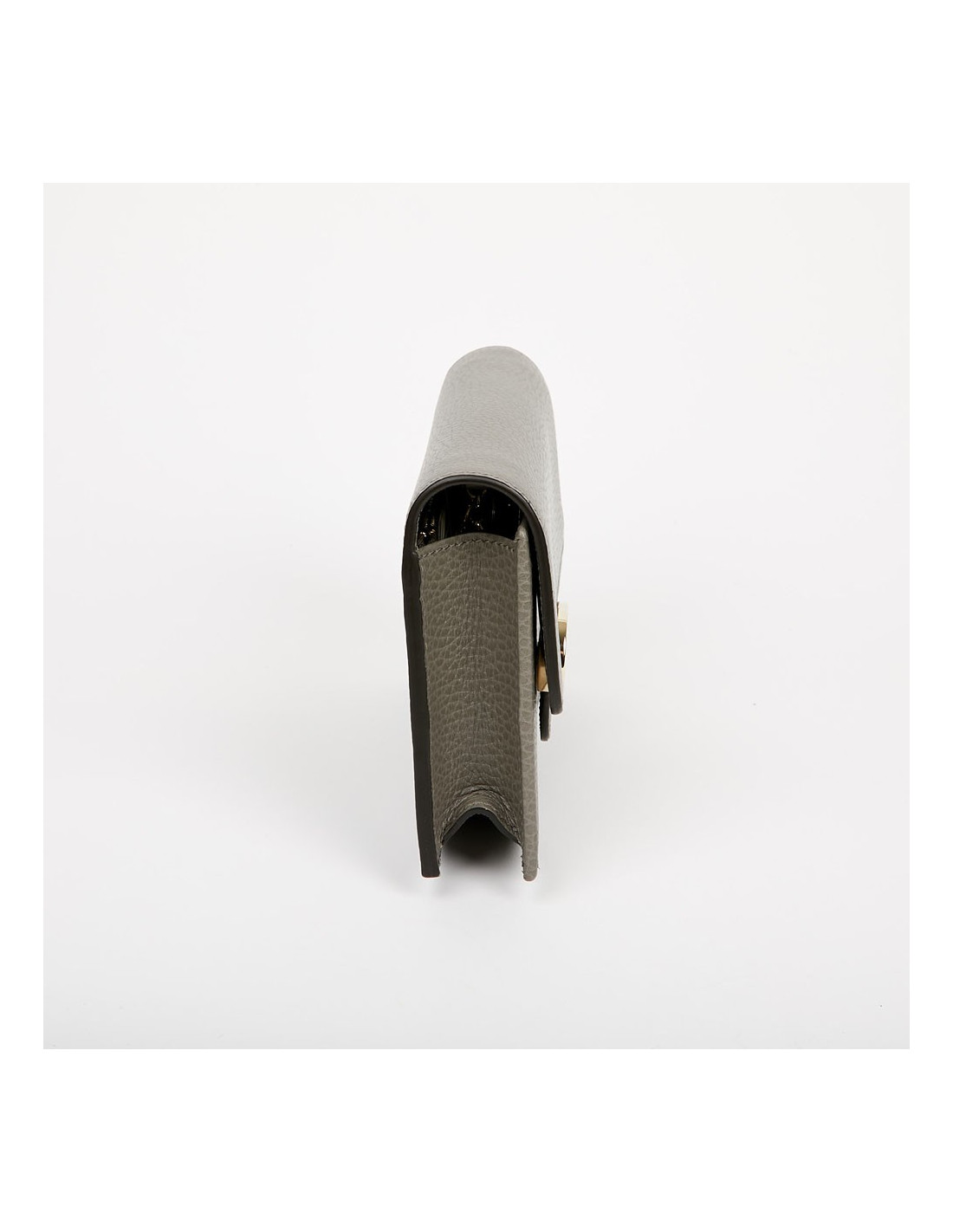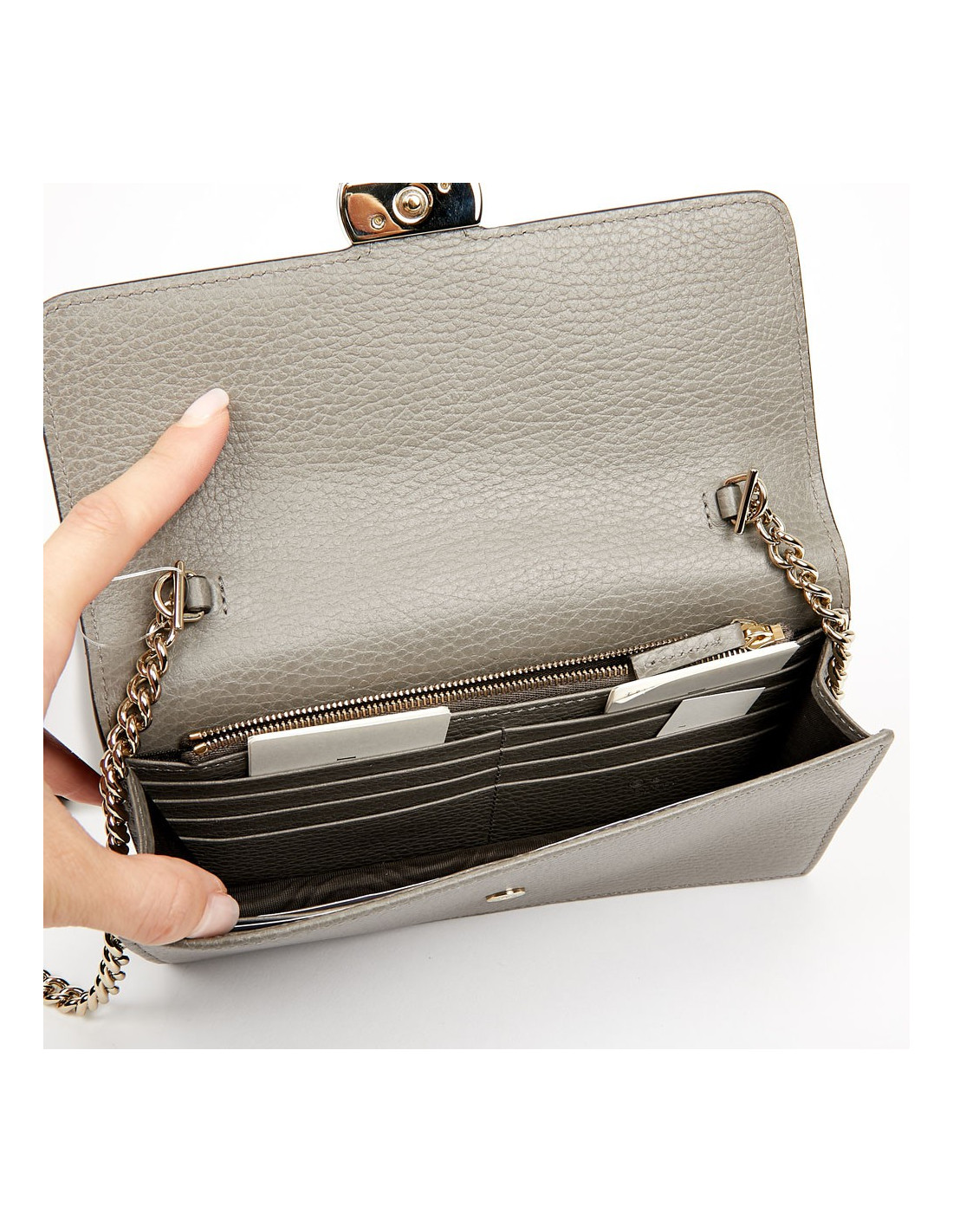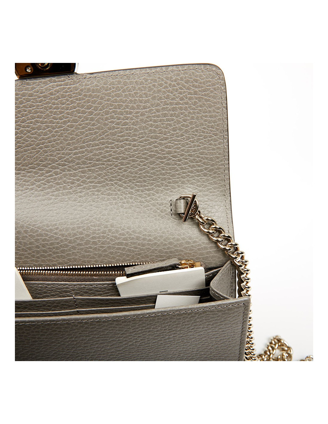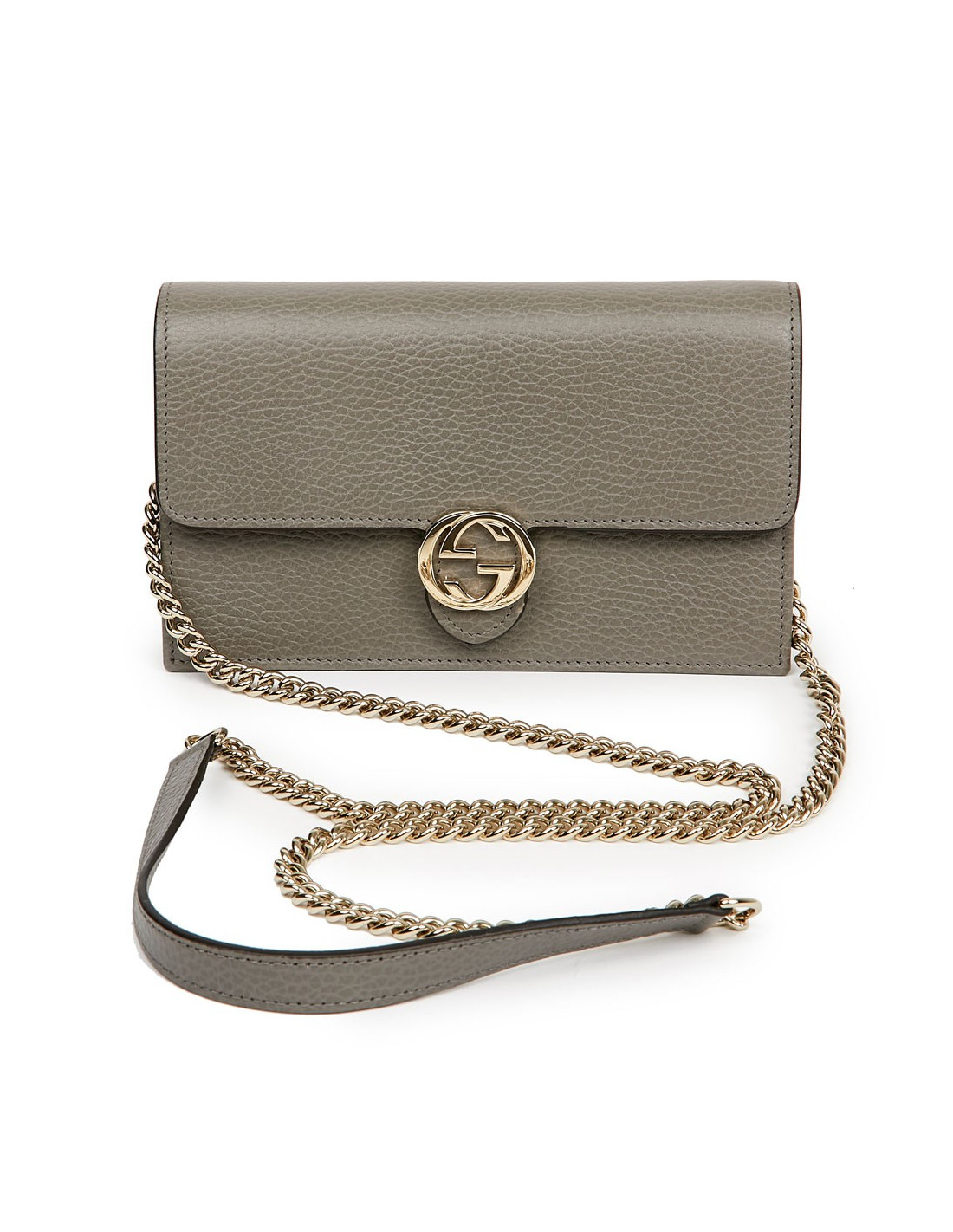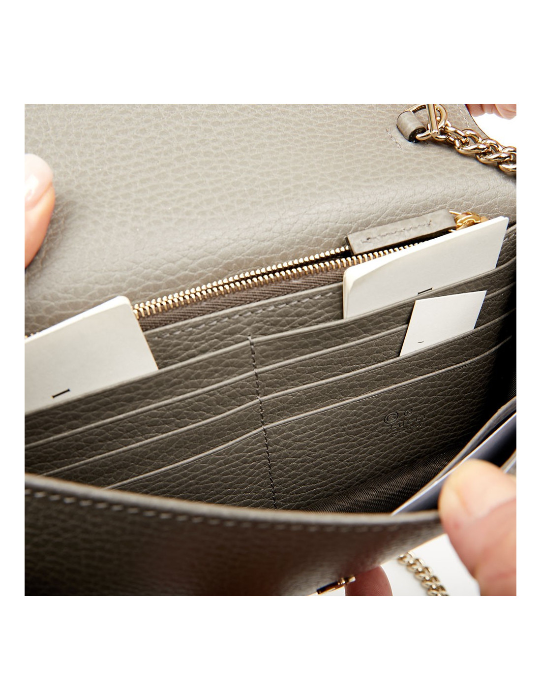 On adore ce petit Wallet on chain de la Maison Gucci, issu de la collection Interlocking. Il est en cuir grainé gris poussière. La bijouterie est en métal doré avec une fermeture par un bouton pression (logo à l'emblème de la marque "GG"). Il est doublé de cuir et de tissu gris. A l'intérieur une poche zippée vous permettra de garder vos papiers en toute sécurité et de chaque côté des fentes pour cartes. La bandoulière n'est pas ajustable mais elle est amovible. Il se porte cross body ou main. Il n'a jamais été utilisé.