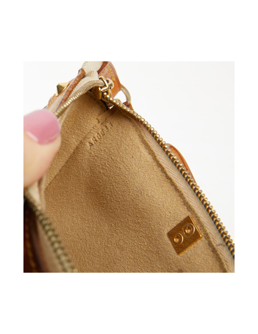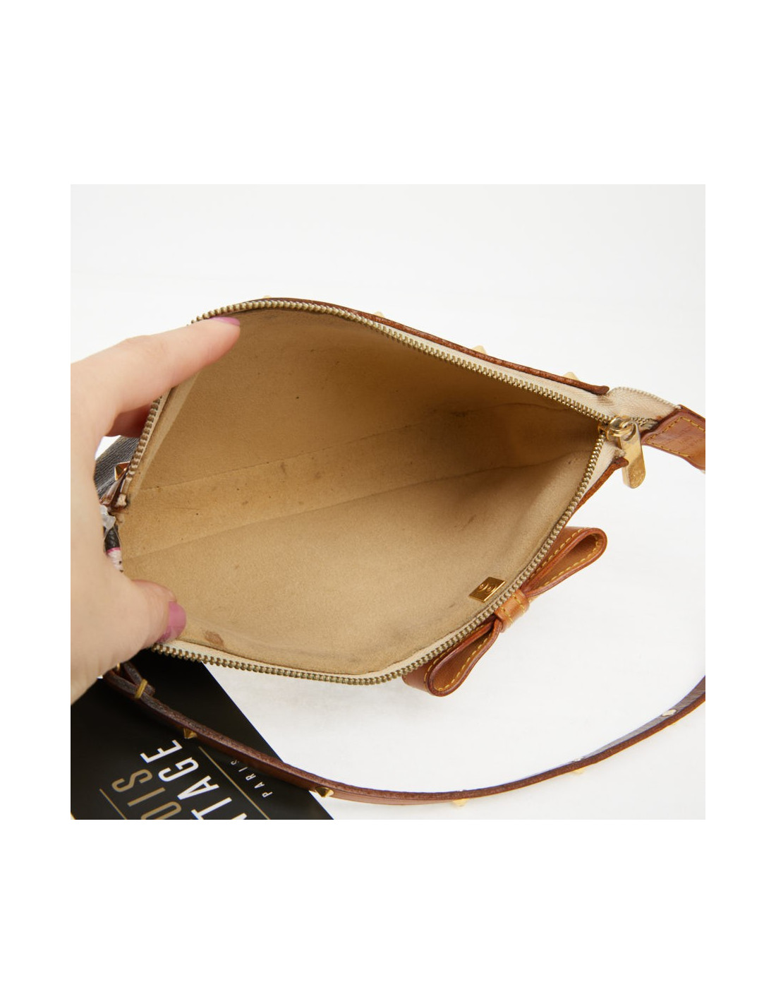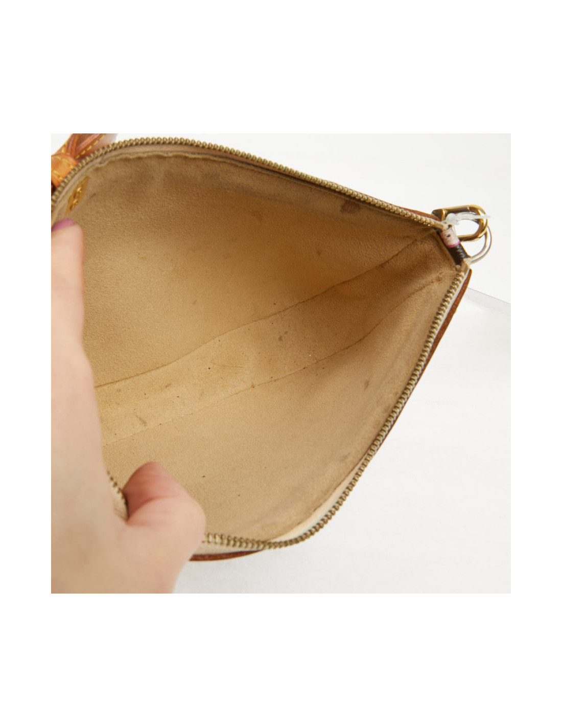 Collector ! Cette pochette Louis Vuitton est issue d'une collaboration avec Takashi Murakami, elle est toile enduite Monogram marron avec des fleurs de couleur rose. Les finitions sont en cuir de vache naturel. La bijouterie est en métal doré. Fermeture par une fermeture à glissière. Elle est indiqué : état correct car le cuir est patiné à certains endroits et la doublure en suèdine beige est tachée, ainsi que la couleur des fleurs est effacée par des petits pointillés (voir photos)
