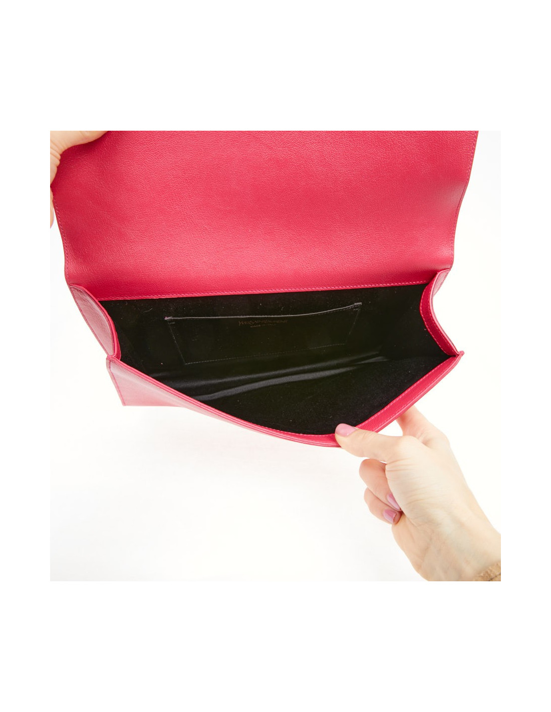 Jamais portée, cette pochette Belle de jour YSL est en cuir rose fuchsia. Elle se ferme par un bouton aimanté en métal doré. Elle est doublée de satin noir avec une petite poche plaquée. Sur le rabat, les initiales sont en relief YSL entremêlées.