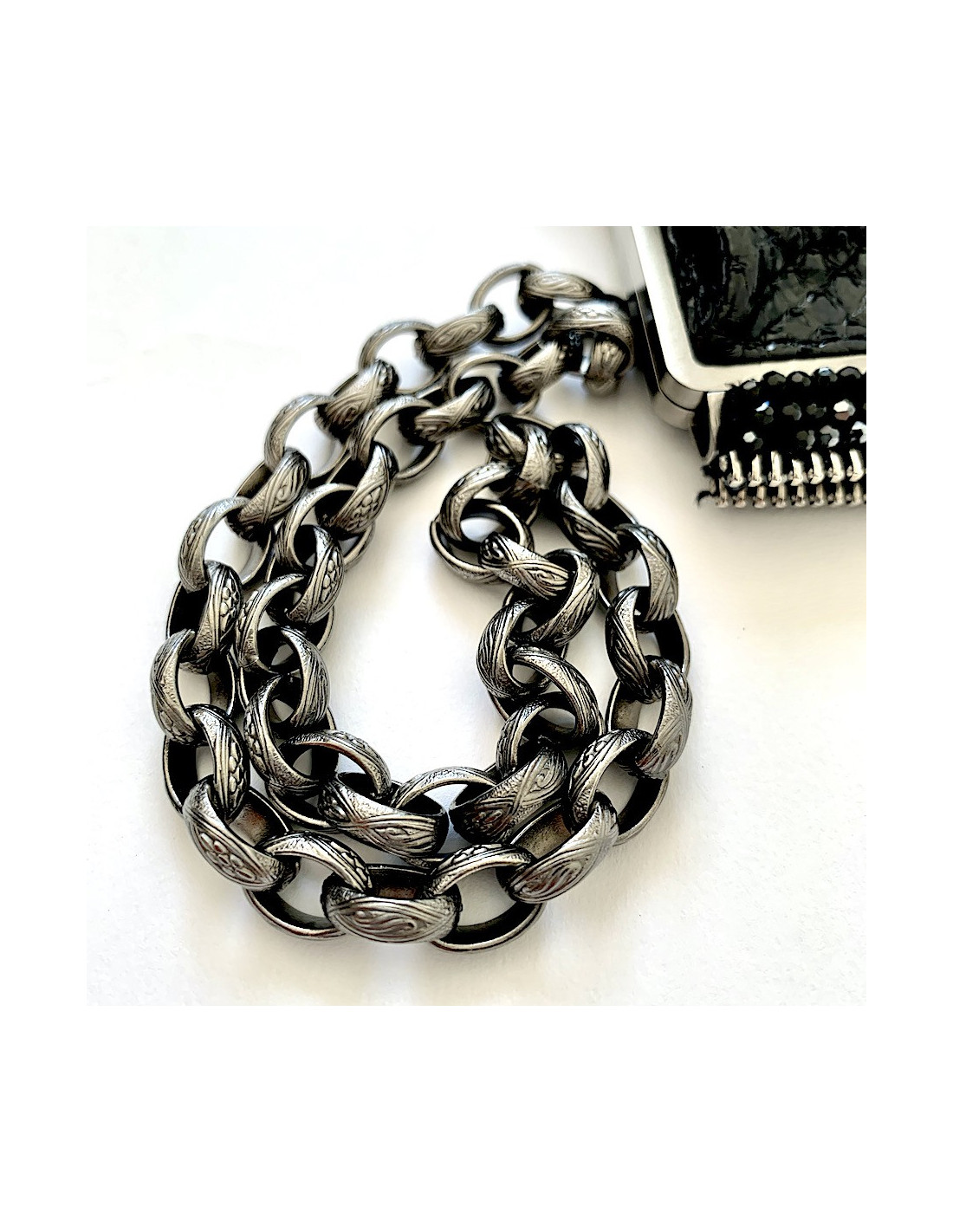 Détails : fermoir à bascule, la chaine permet de la porter autour du poignet