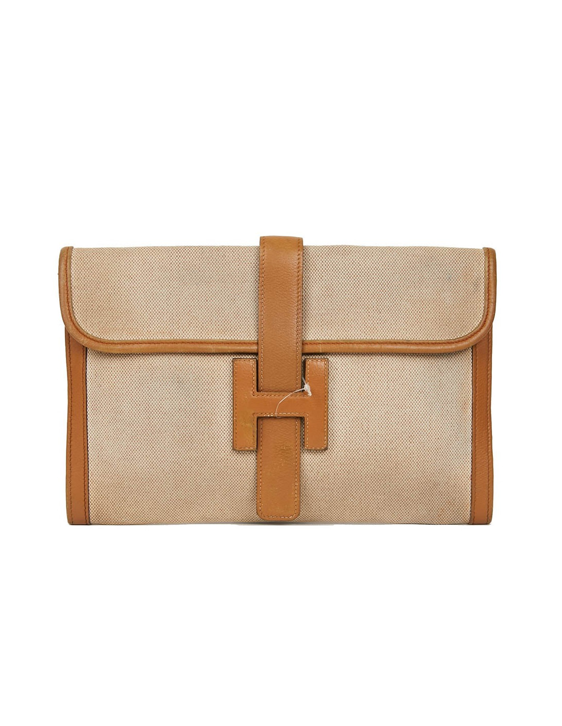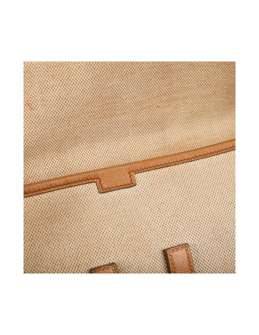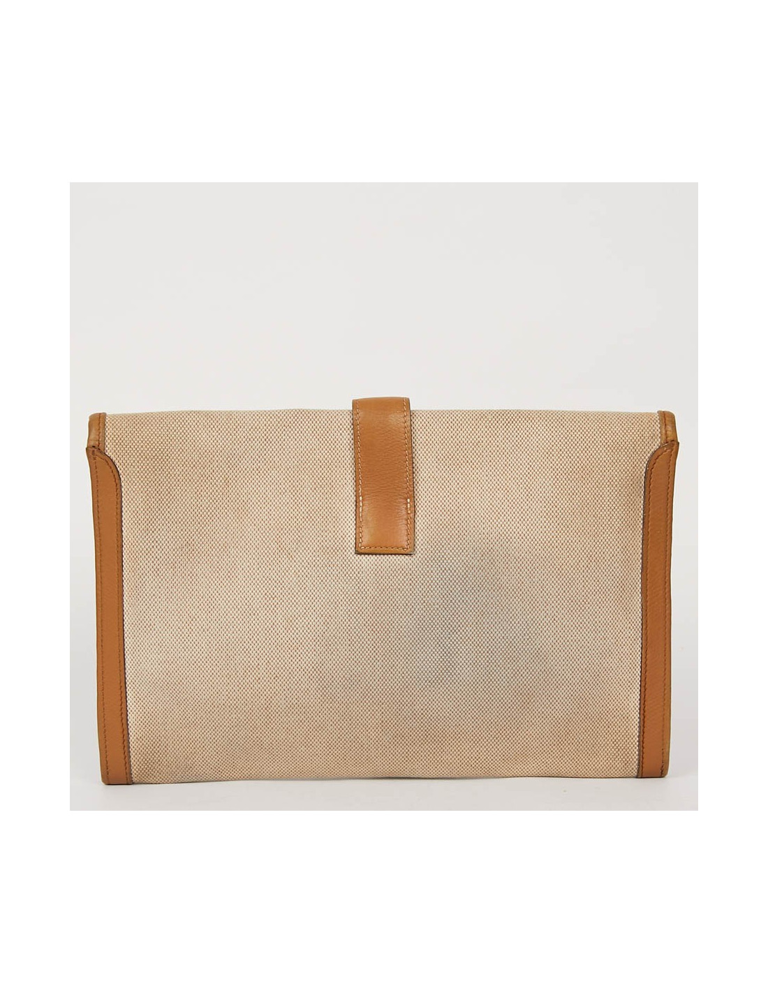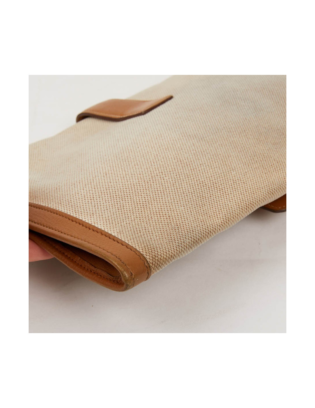 Pochette vintage Jige de la Maison HERMES en toile et cuir beige. Fermeture par une patte en cuir grainé. Elle est en bon état, les coins sont un peu usés et et la doublure est tachée par endroits.