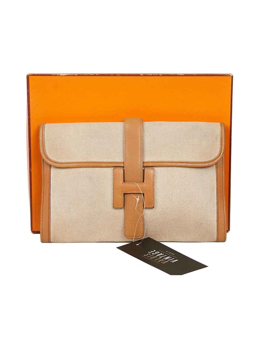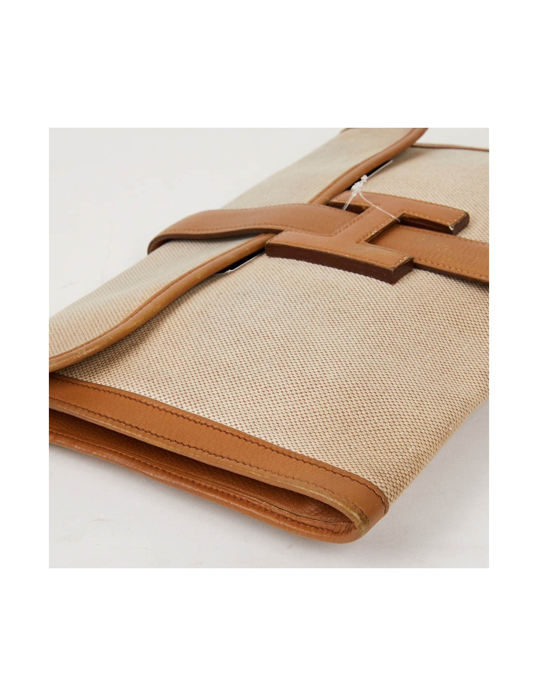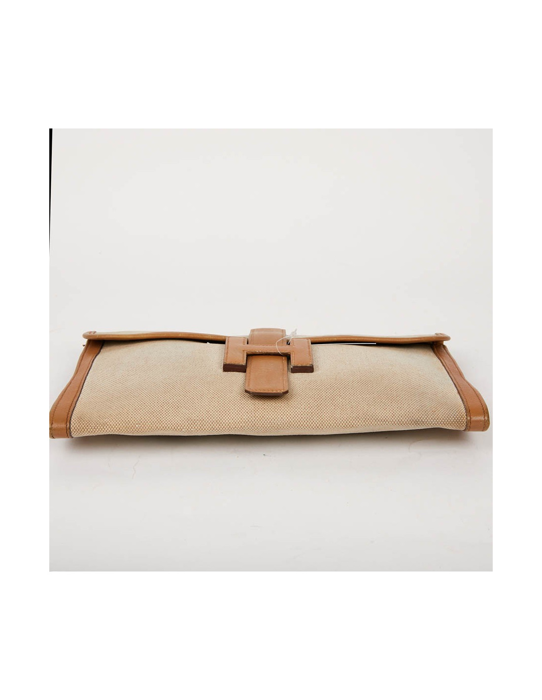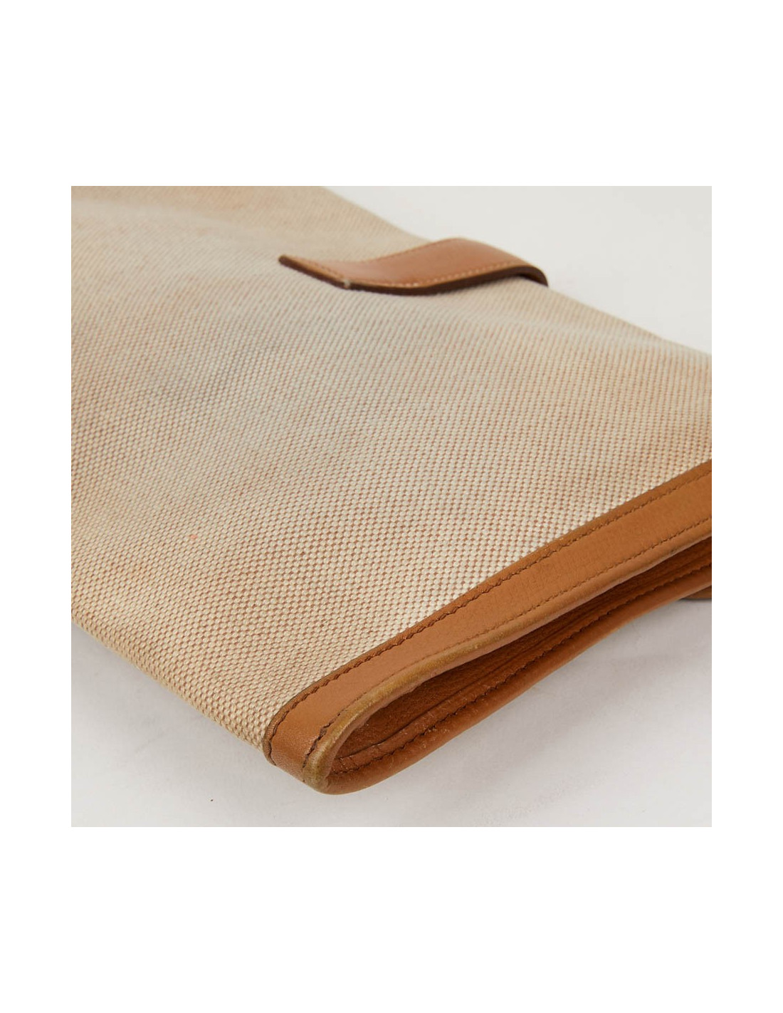 Pochette vintage Jige de la Maison HERMES en toile et cuir beige. Fermeture par une patte en cuir grainé. Elle est en bon état, les coins sont un peu usés et et la doublure est tachée par endroits.