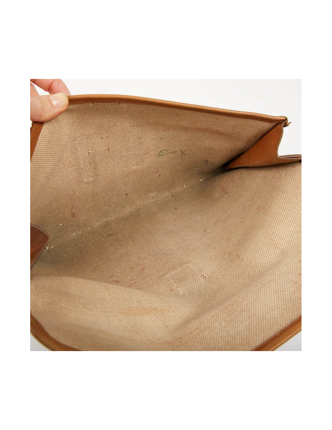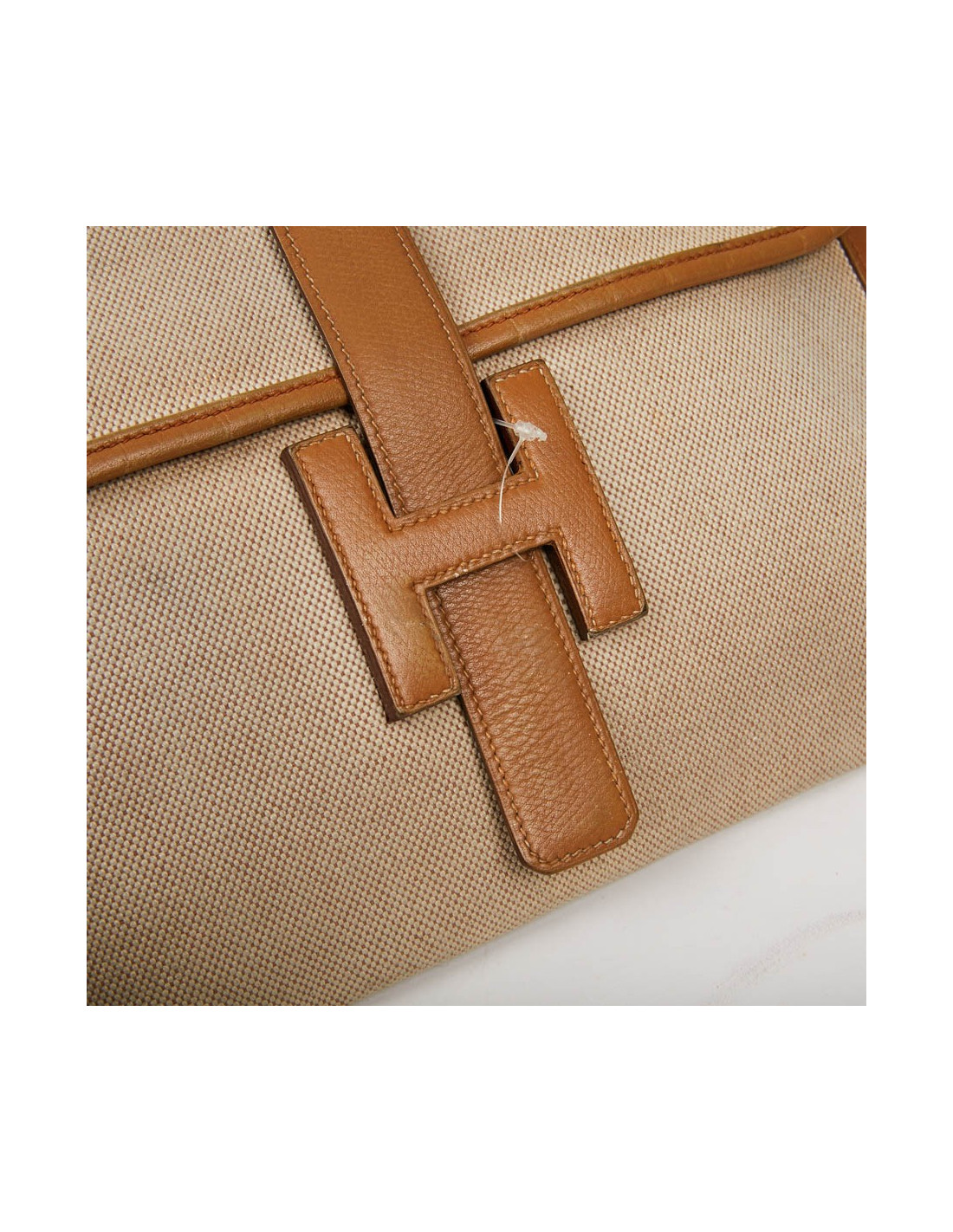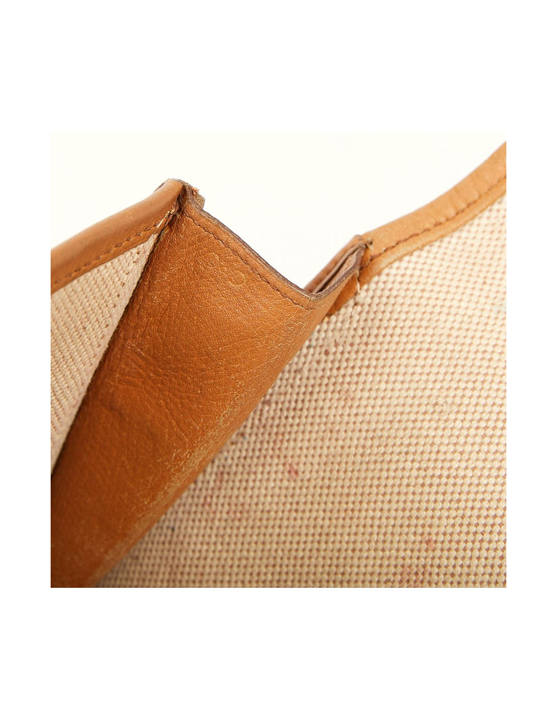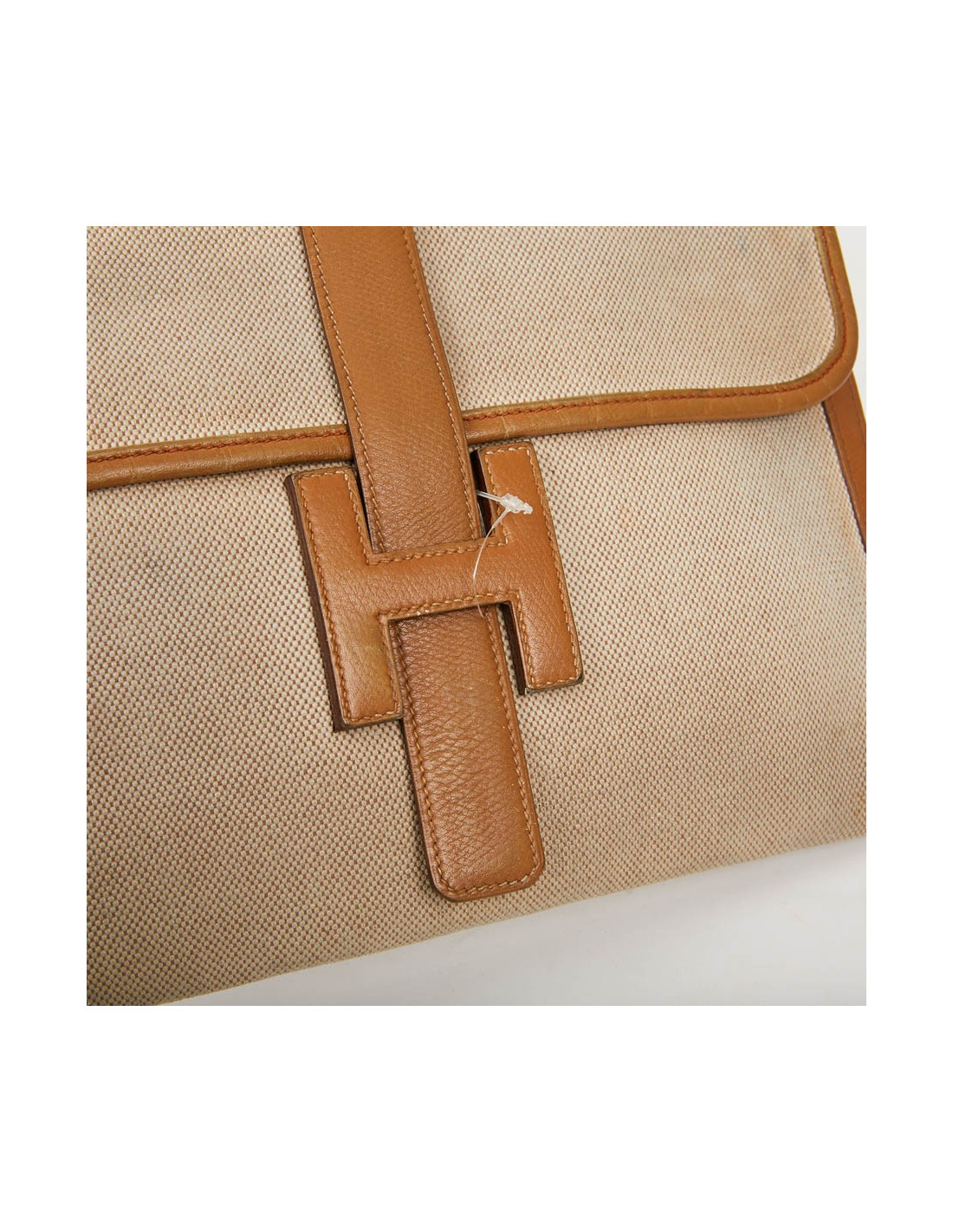 Pochette vintage Jige de la Maison HERMES en toile et cuir beige. Fermeture par une patte en cuir grainé. Elle est en bon état, les coins sont un peu usés et et la doublure est tachée par endroits.