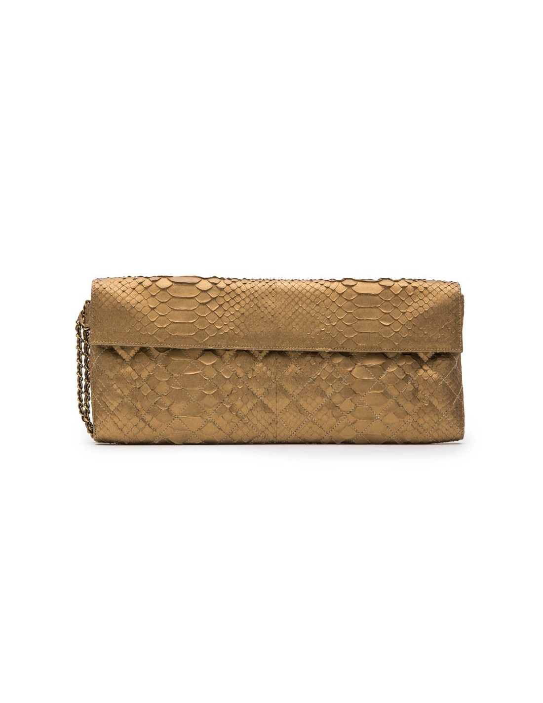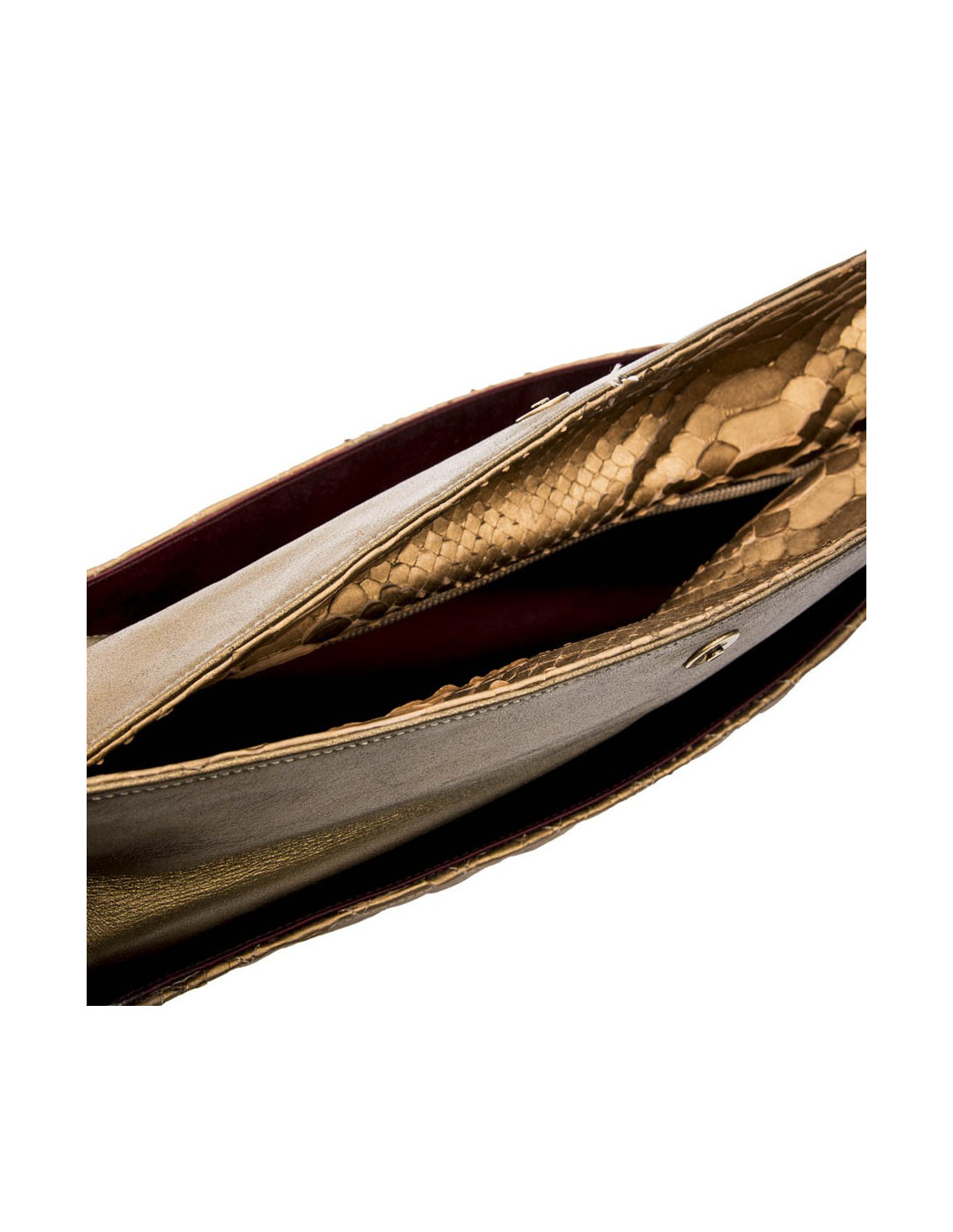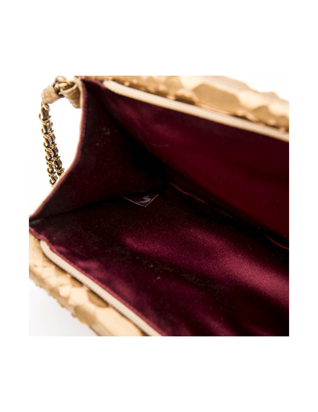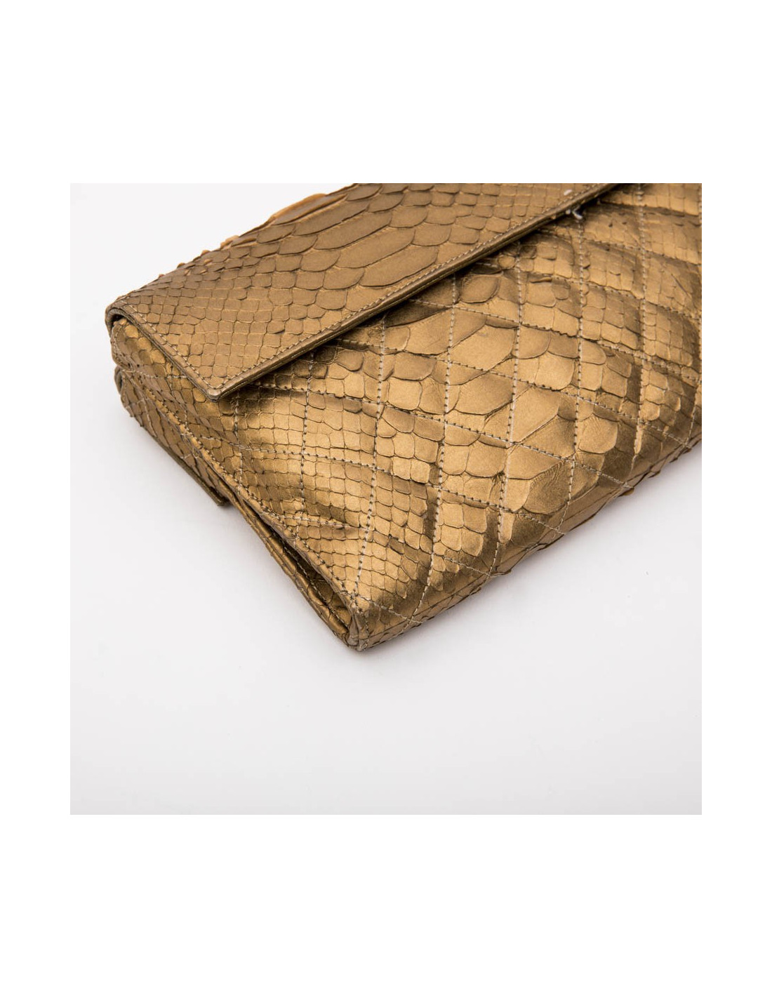 Rarrissime. Longue pochette Chanel en python or mat cuivré. L'intérieur est en satin duchesse bordeaux avec 3 soufflets dont un zippé. La bijouterie est en laiton doré.