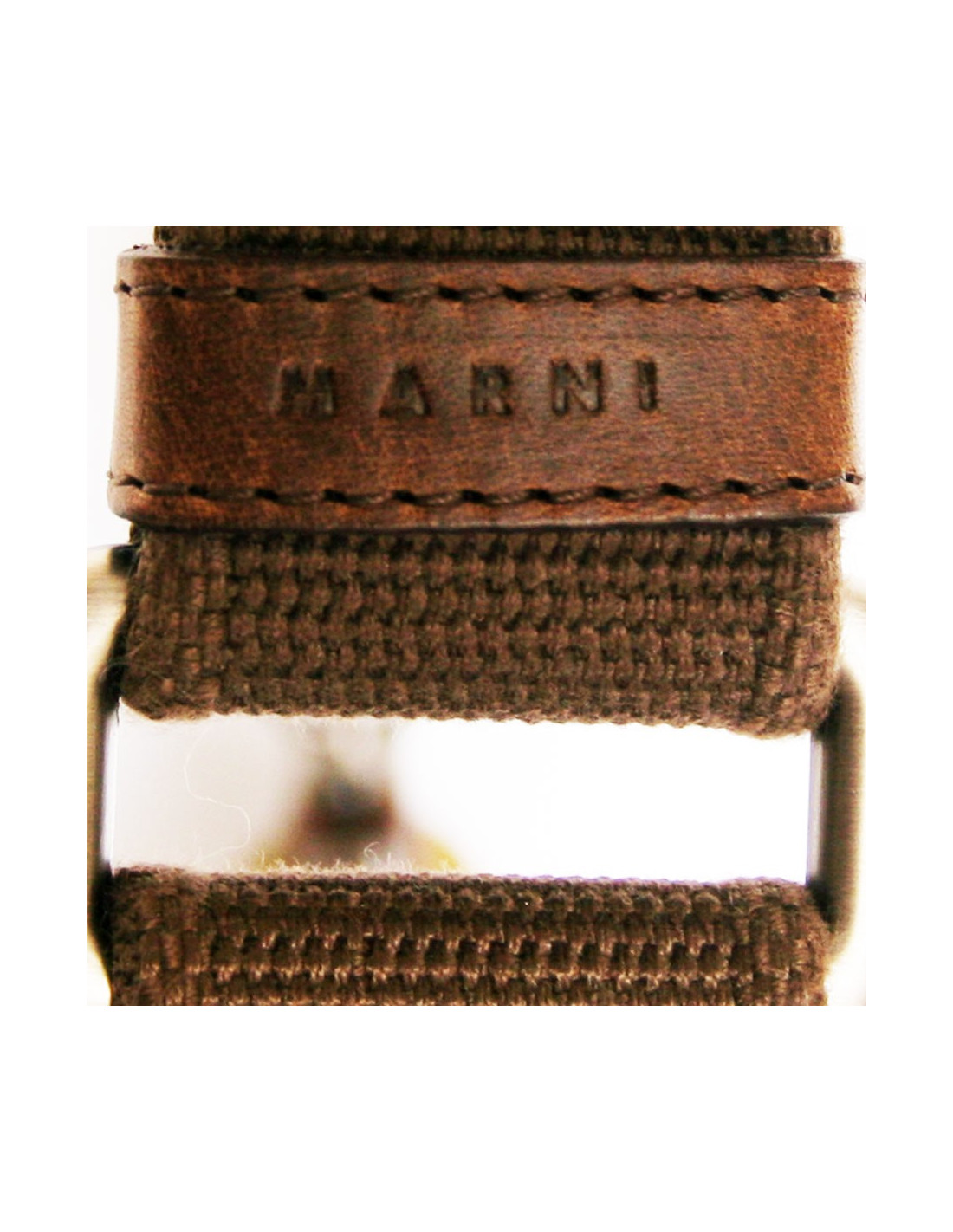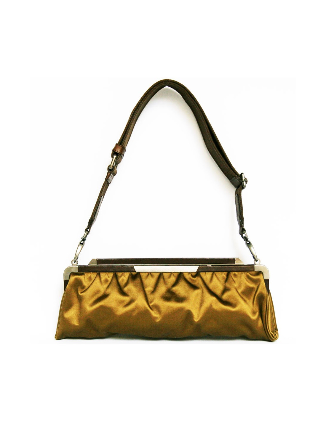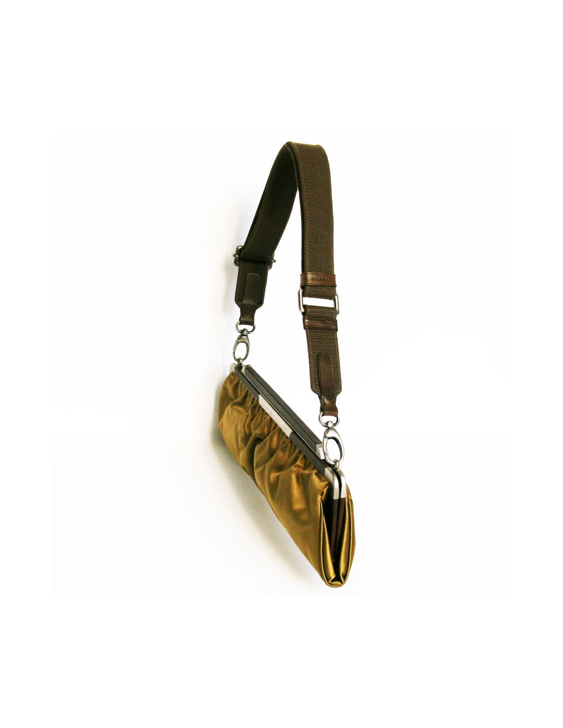 Pochette griffe de niche italienne MARNI en satin doré foncé avec contour acier et cuir..