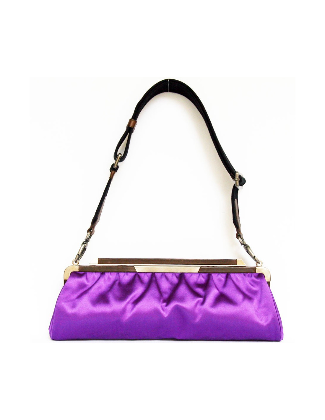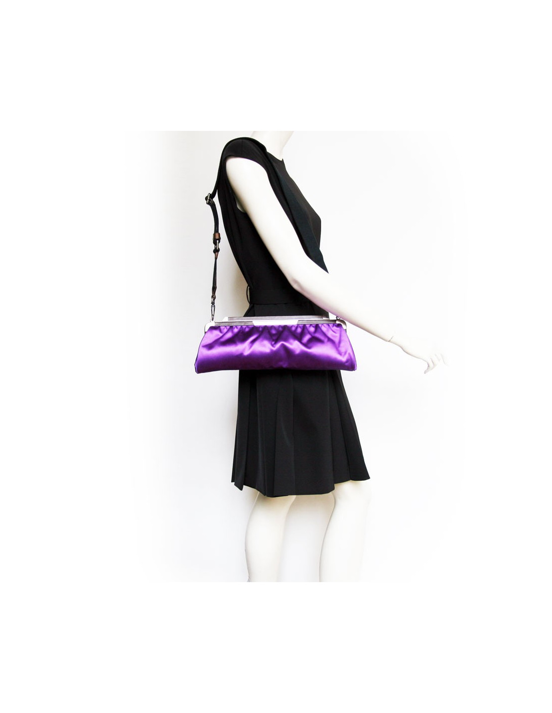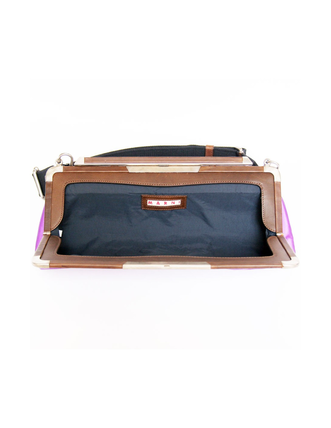 Cette jolie pochette Marni très tendance est en satin violet avec le contour en acier et cuir. Une anse en toile permet de porter cette pochette soit à la main ou à l'épaule (anse amovible).